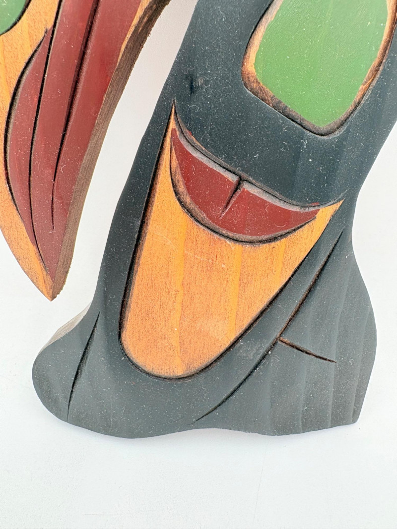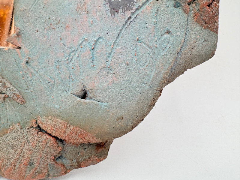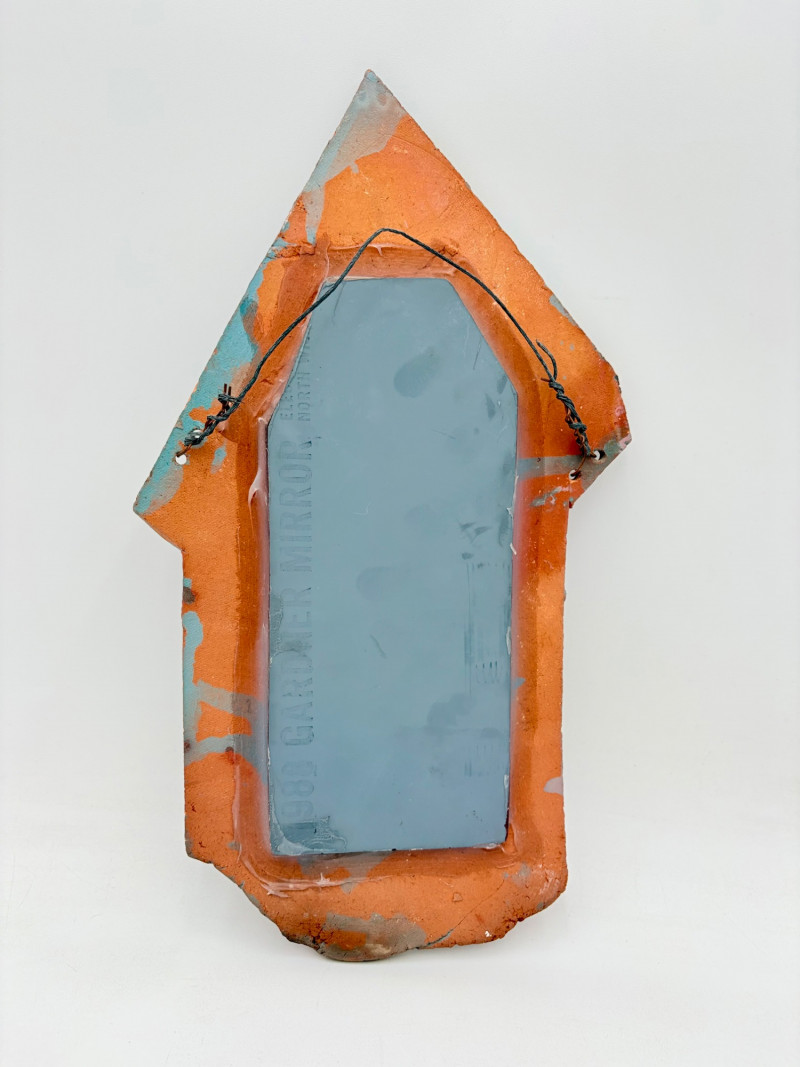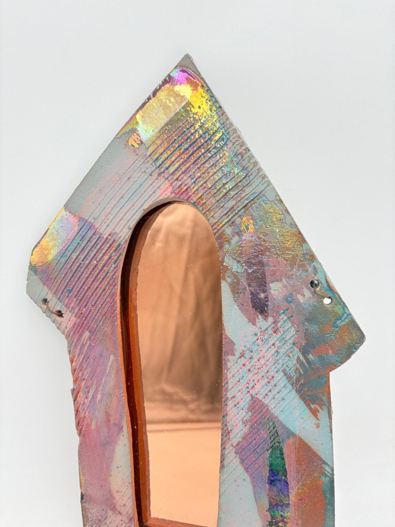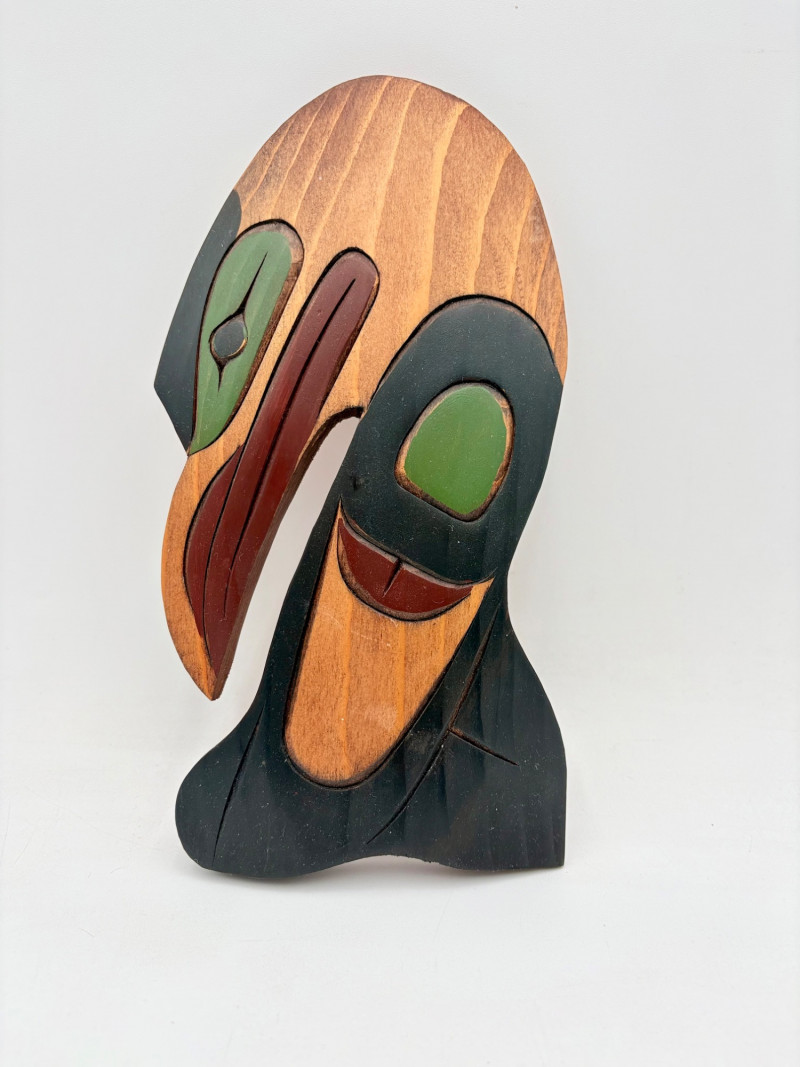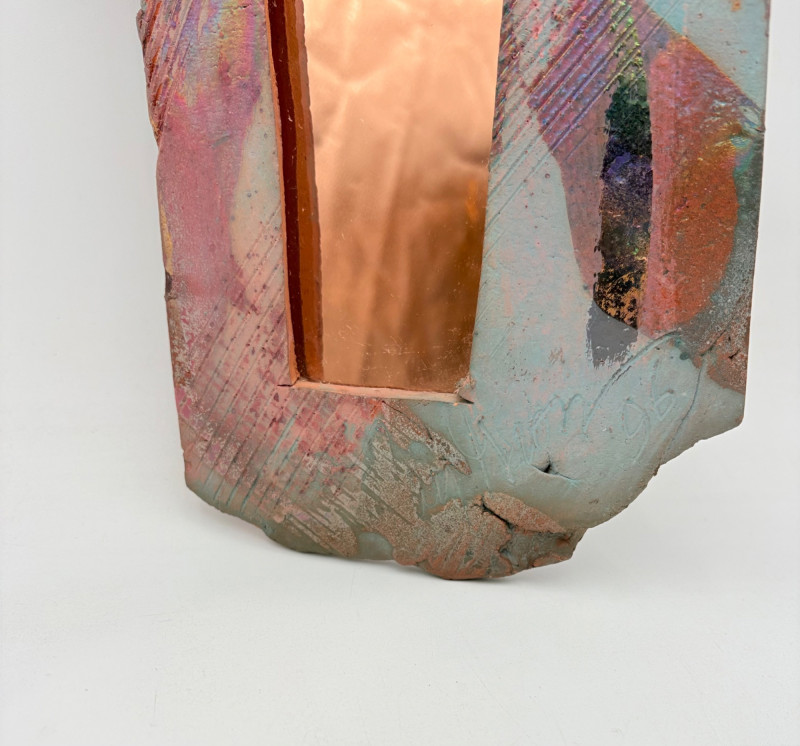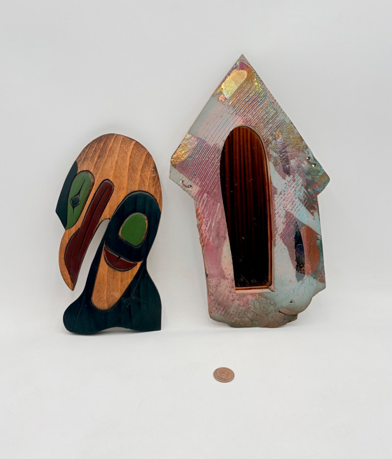 Lovely artist-made duo for your wall to add a burst of color and interest in a compact space. PNW Native style Wooden bird head with subtle coloring. Artist-initialed on verso, Measures 10" H x 6" W. Bronze-tone mirror with ceramic "house" framing. Glazing in multiple colors and some iridescent finish, Artist signed on lower right front. From 1996. Measures 14" H x 8" W.