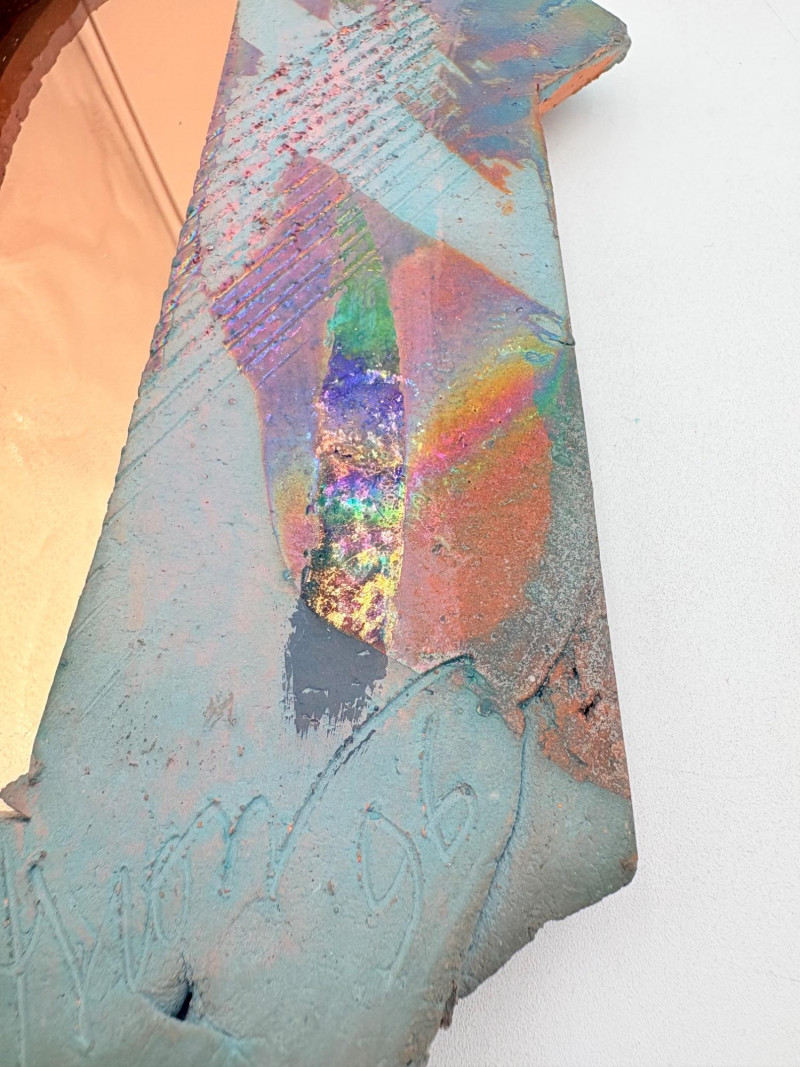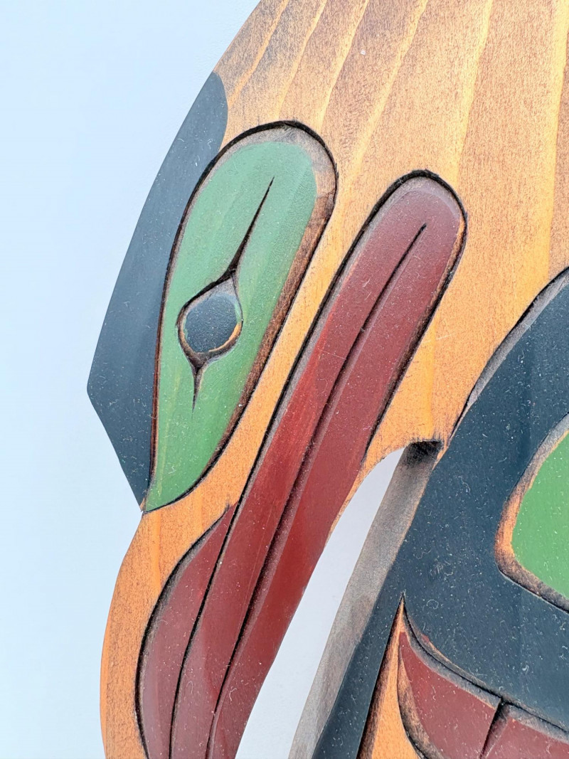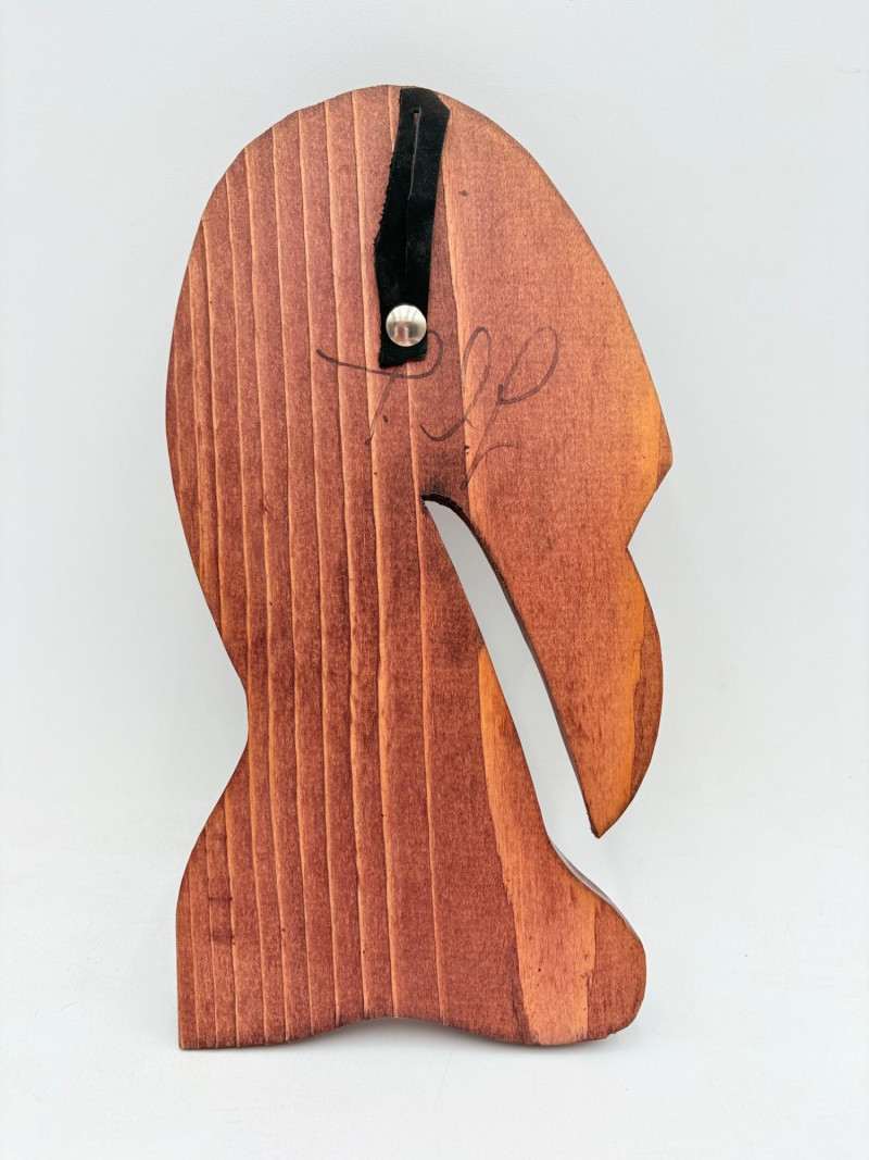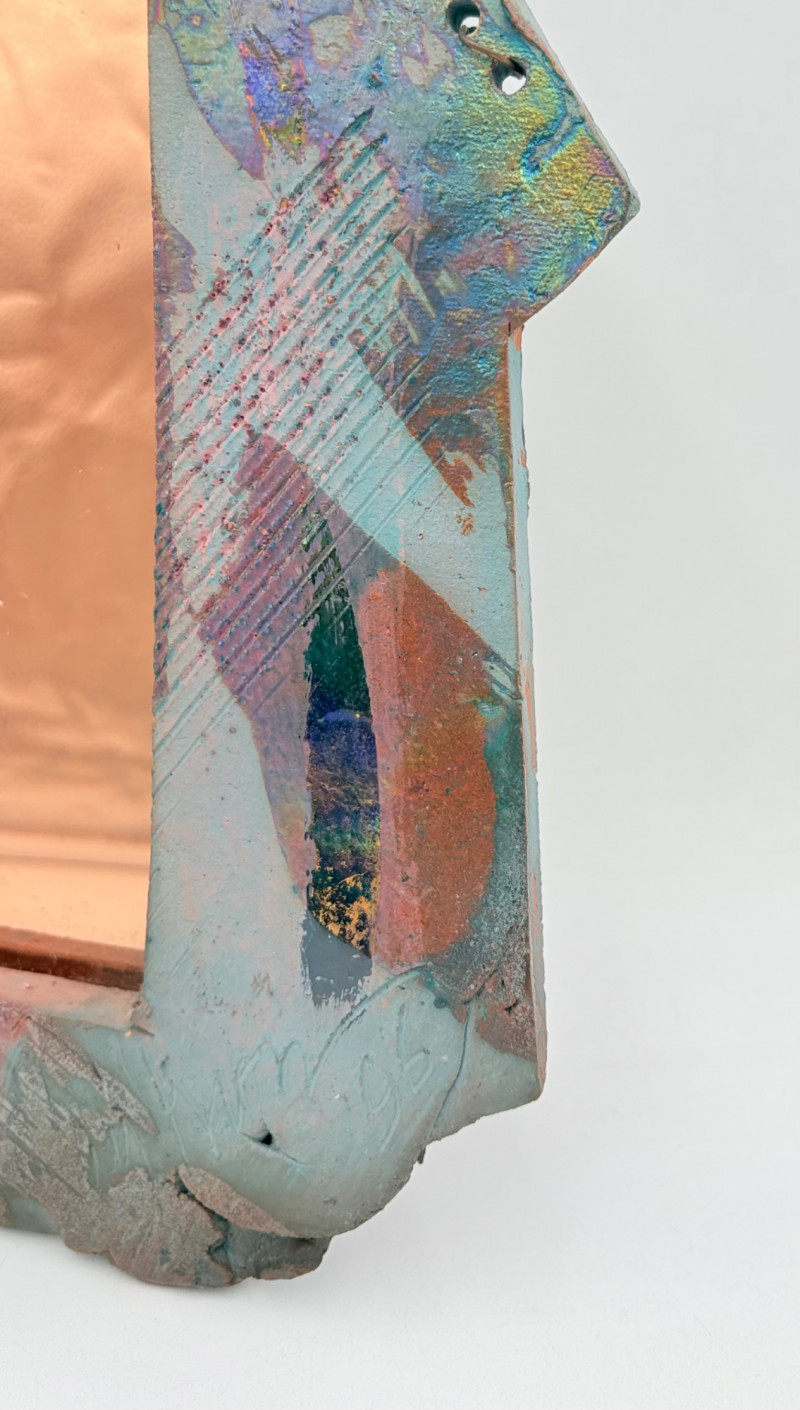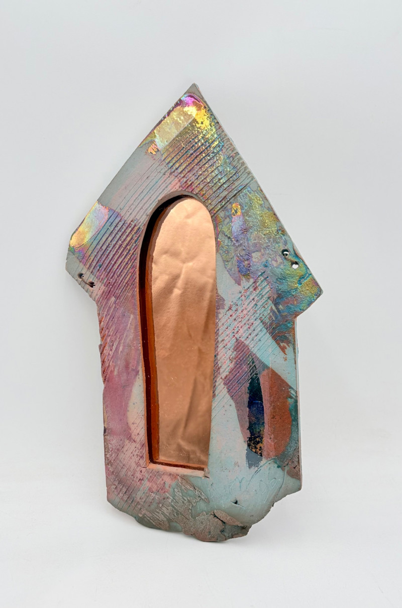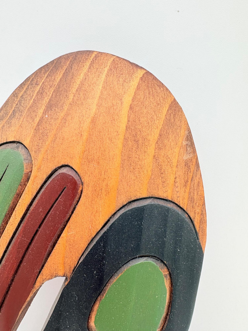 Lovely artist-made duo for your wall to add a burst of color and interest in a compact space. PNW Native style Wooden bird head with subtle coloring. Artist-initialed on verso, Measures 10" H x 6" W. Bronze-tone mirror with ceramic "house" framing. Glazing in multiple colors and some iridescent finish, Artist signed on lower right front. From 1996. Measures 14" H x 8" W.