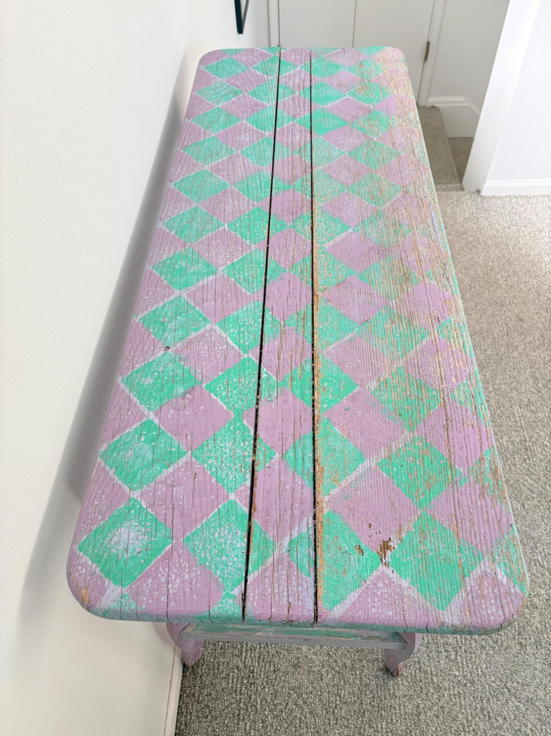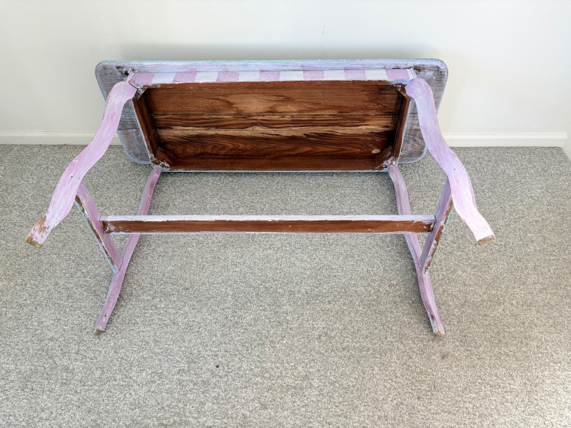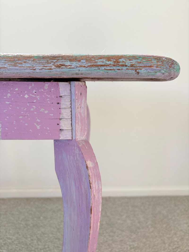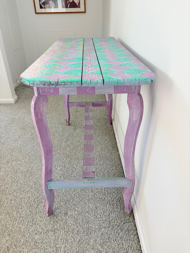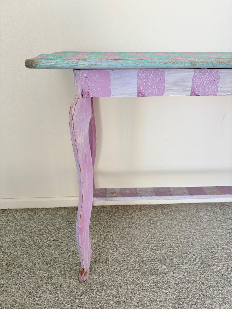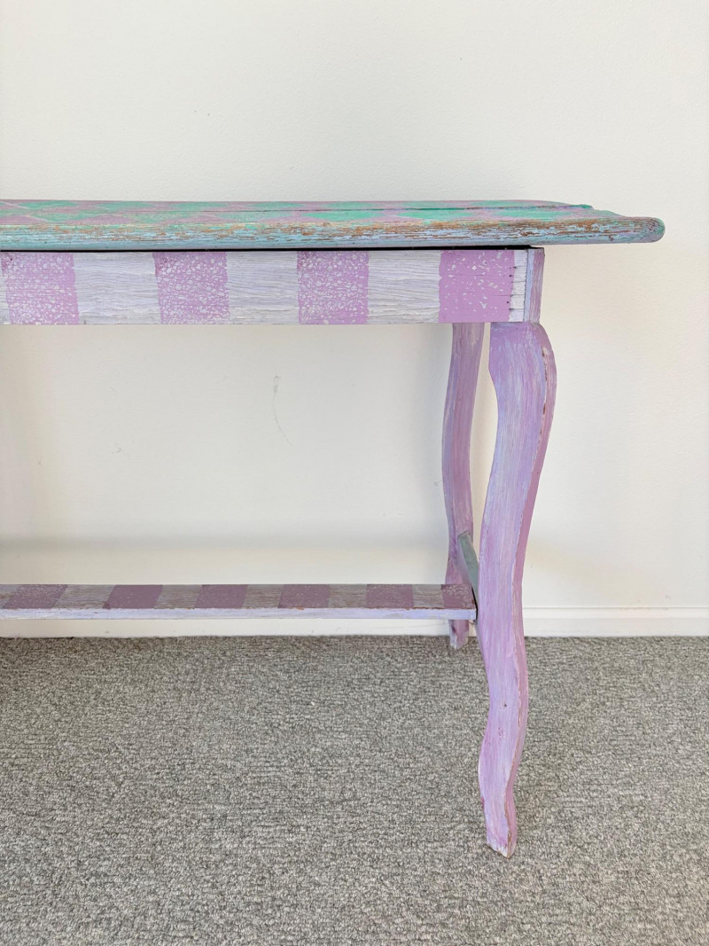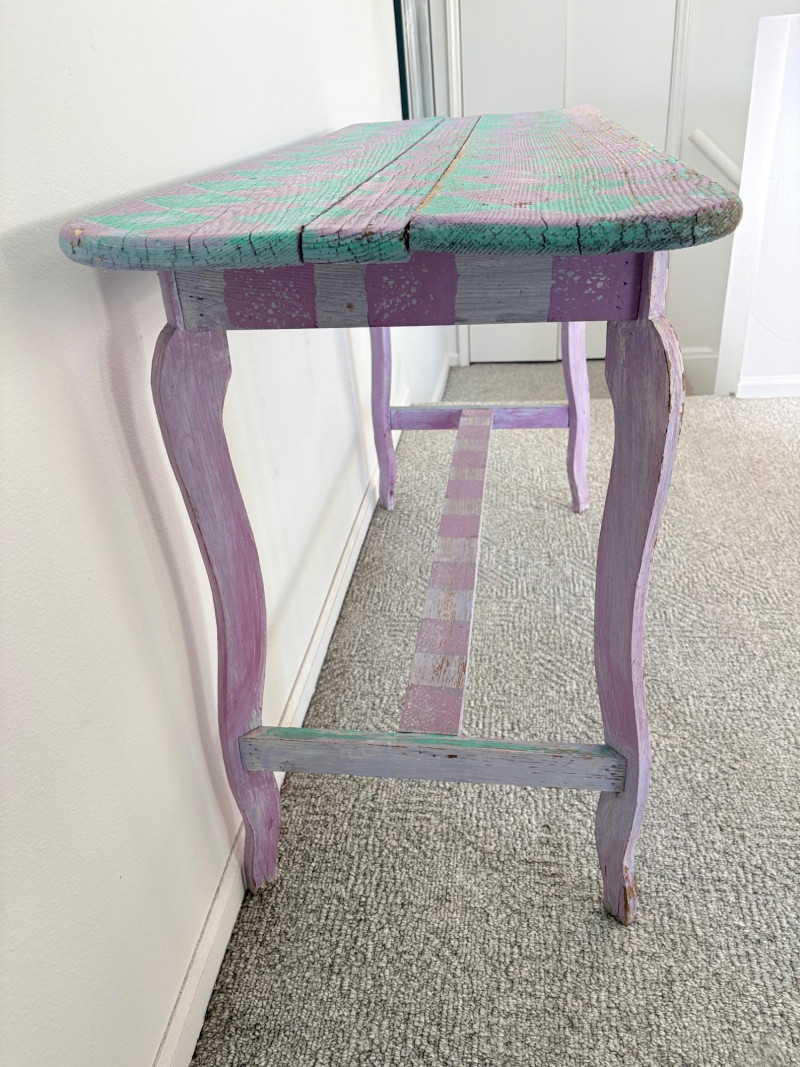 This is an antique console table with curved legs has been hand painted and distressed in green and two shades of purple. it has a stretcher bar on the lower section. This is definitely old, but is a wonderful rustic piece with a checked pattern that enhances its character. Measures 31" H x 47.5” W x 18" D. Aqua metal trashcan pairs nicely with table. Measures 14" H.