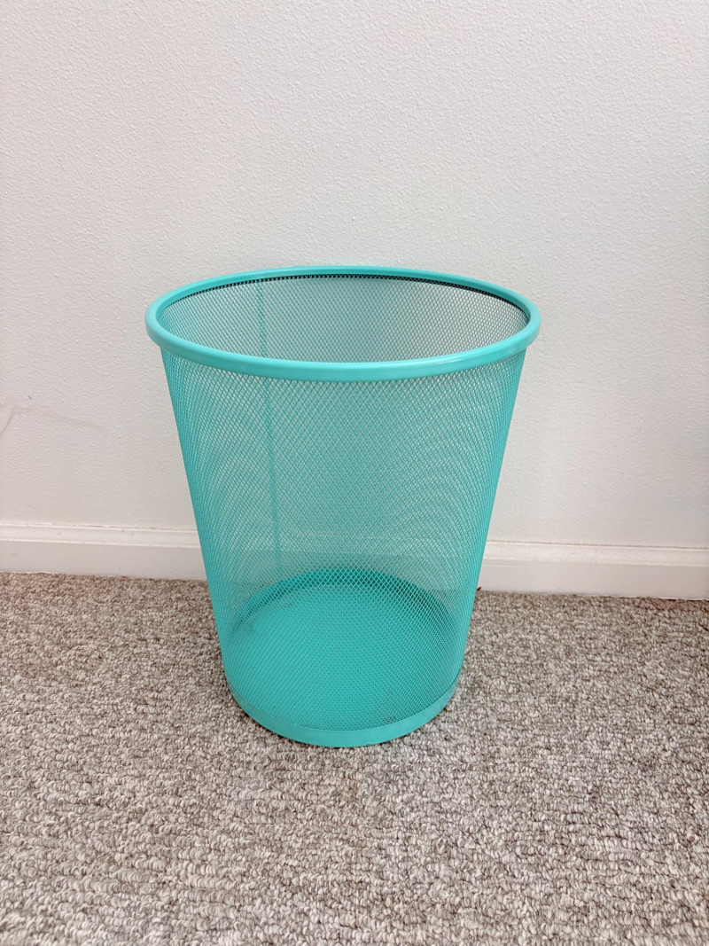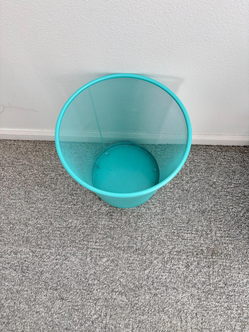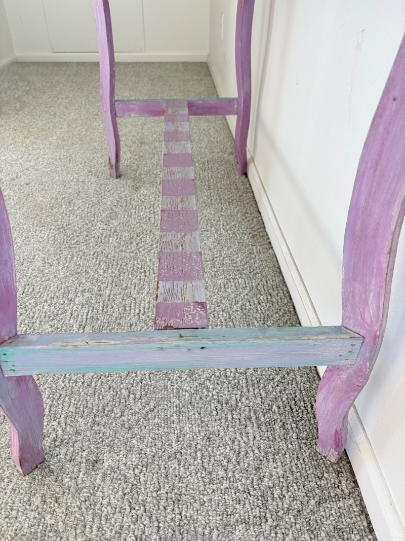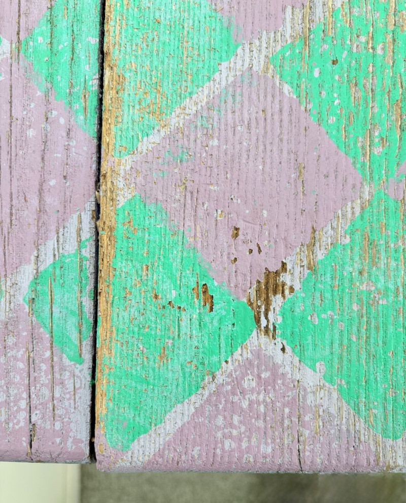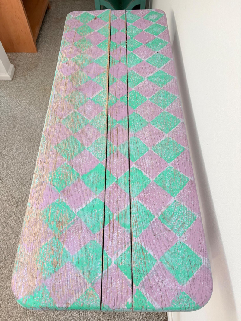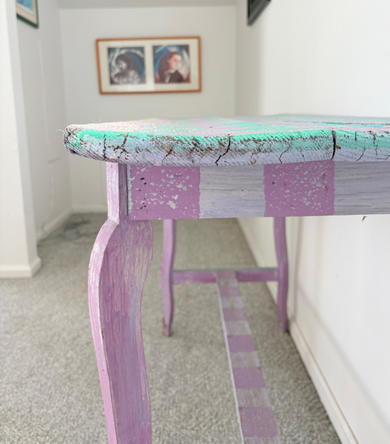 This is an antique console table with curved legs has been hand painted and distressed in green and two shades of purple. it has a stretcher bar on the lower section. This is definitely old, but is a wonderful rustic piece with a checked pattern that enhances its character. Measures 31" H x 47.5” W x 18" D. Aqua metal trashcan pairs nicely with table. Measures 14" H.