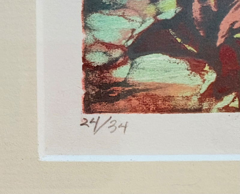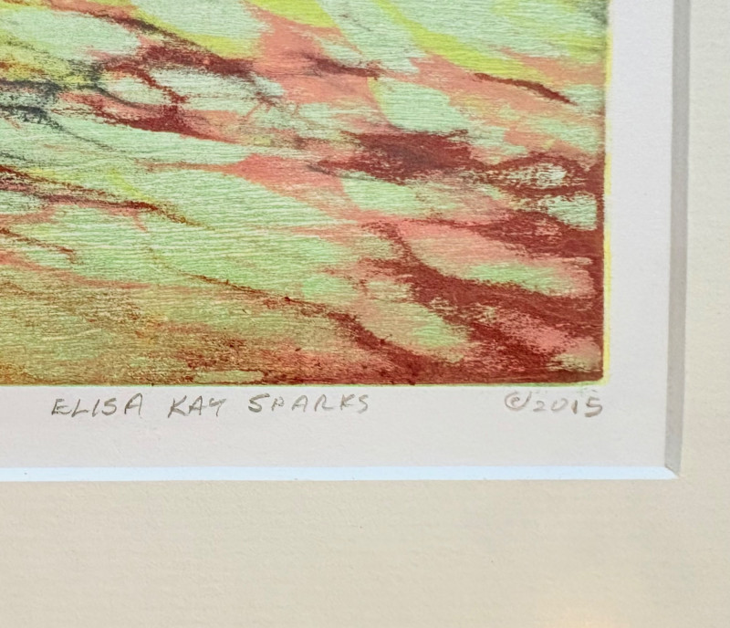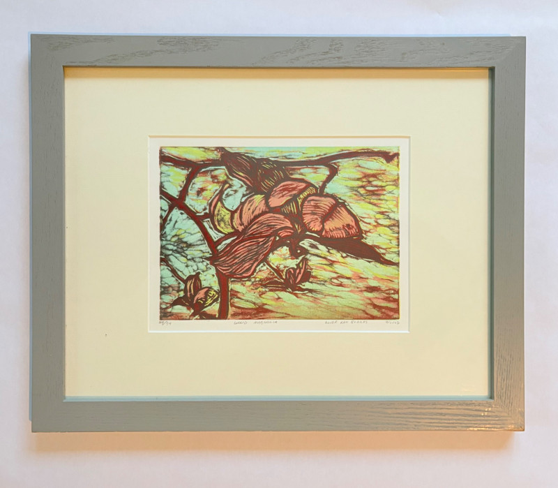 Lovely print in beautiful colors titled "Wood Magnolia" by artist Elisa Kay Sparks. It is #24 from an edition of 34 created in 2015. Neutral mat in a grey textured wooden frame. Artist signed and numbered in pencil on lower margin. Measures 16" H x 20" W framed.