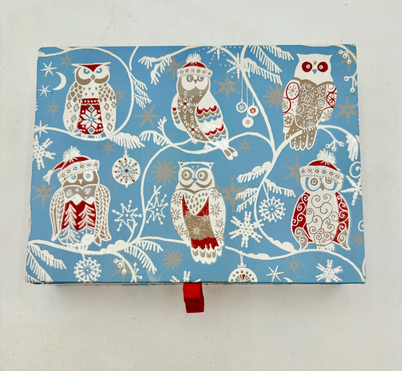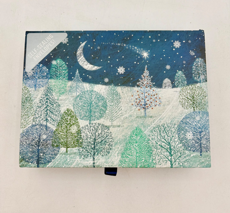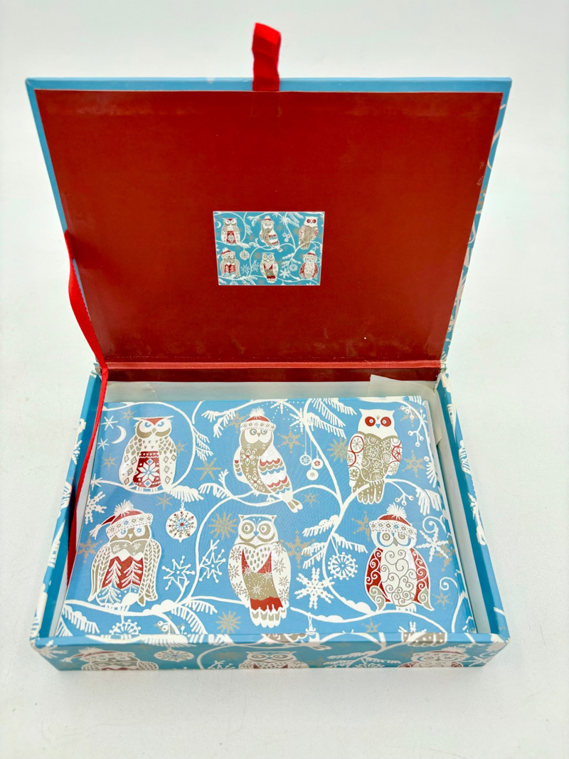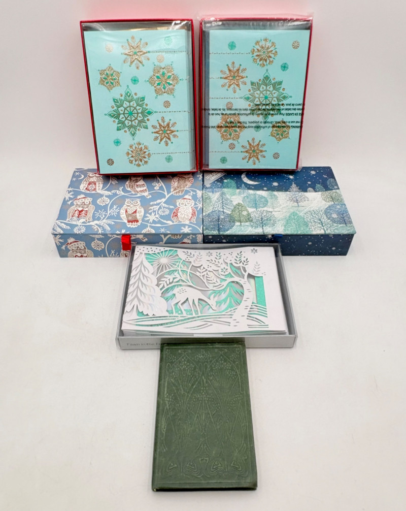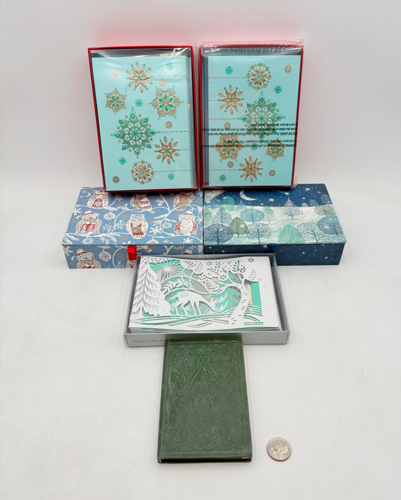 Fabulous assortment of Christmas cards - - 2 boxes (12 each) of teal & gold stars from Papyrus - 1 box (6 in all) of 3-D pop-up "Fawn in the Forest" from Museum of Modern Art - 8 "Midnight Clear" green trees & silver from Peter Pauper Press - 11 Owls in Christmas hats on blue from Peter Pauper Press + a blank Liberty of London address book with green leather cover (very slight wear noted)