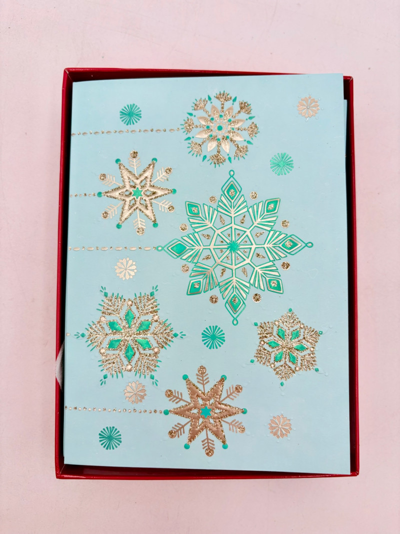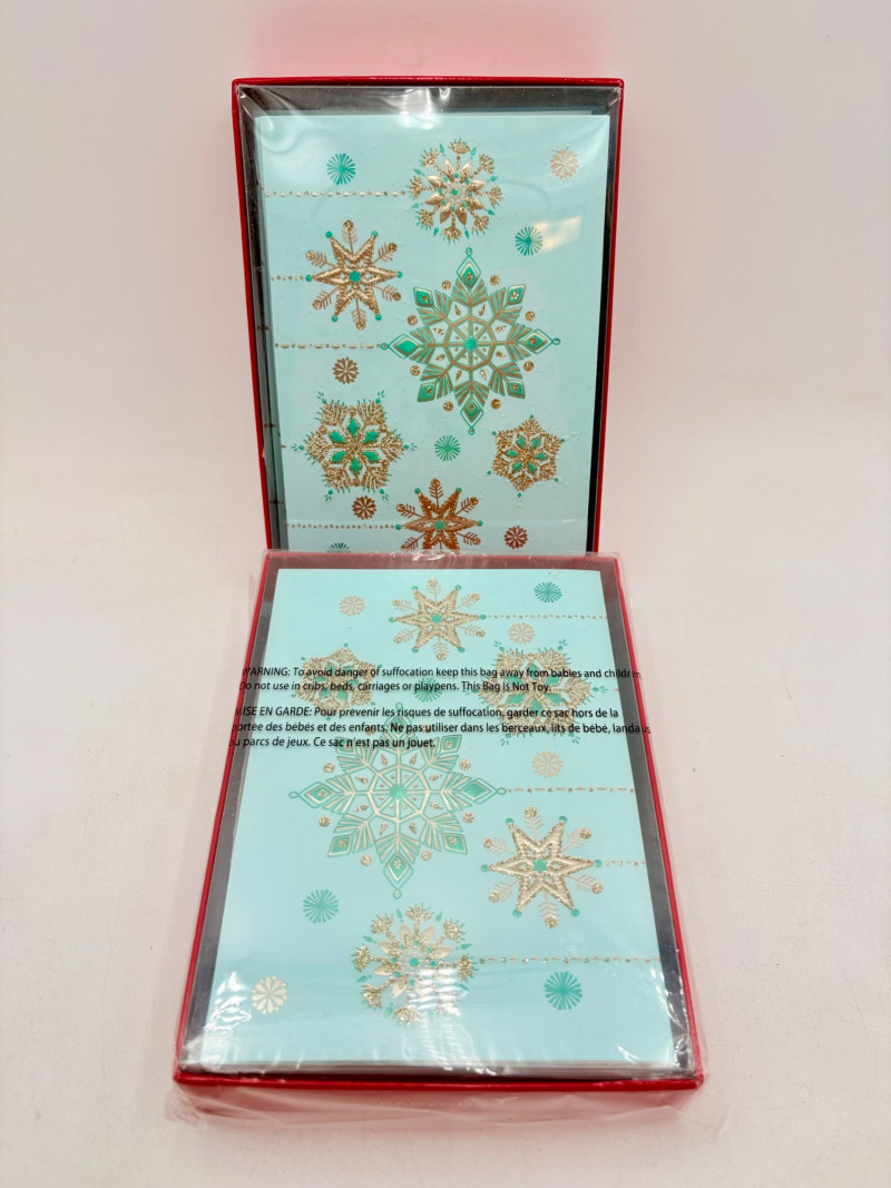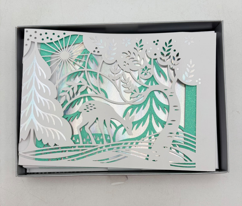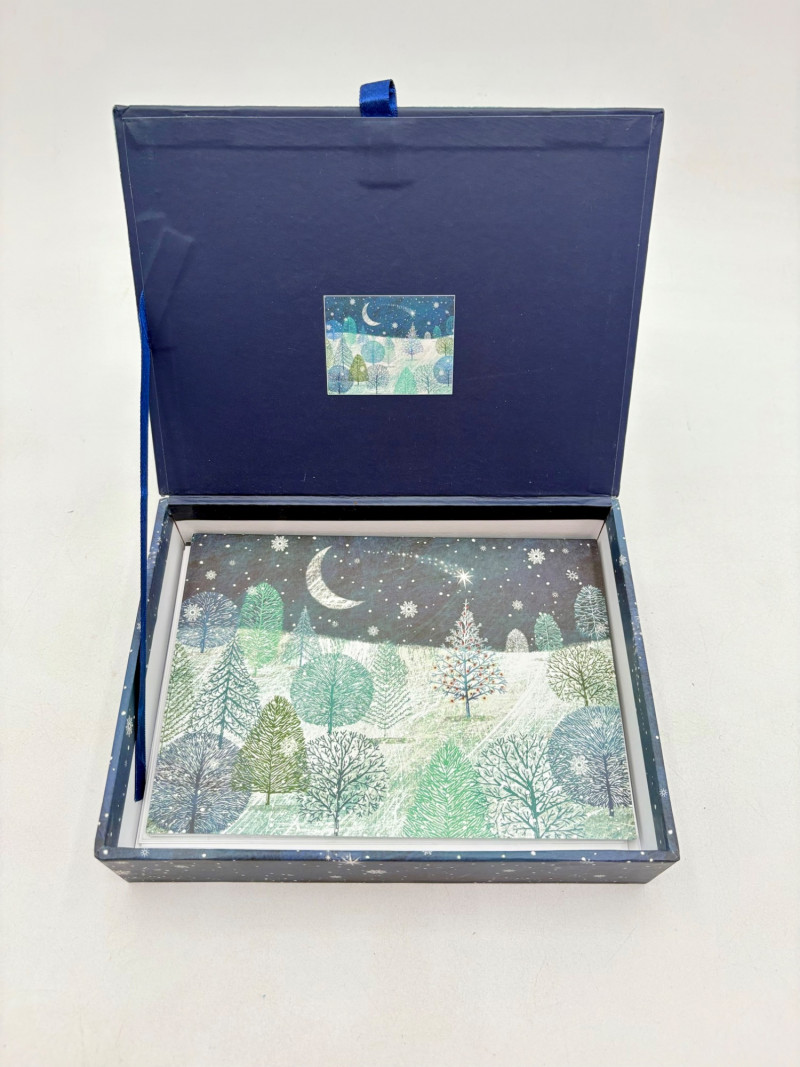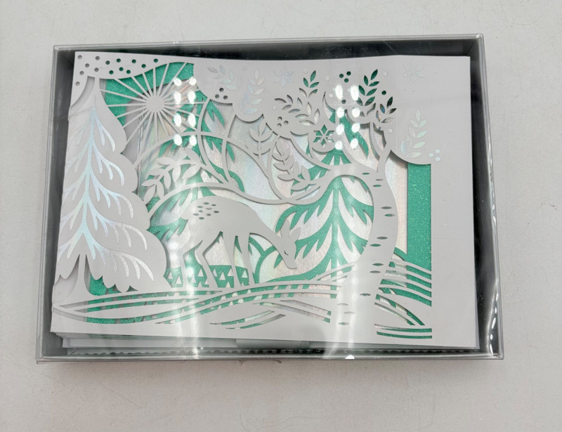 Fabulous assortment of Christmas cards - - 2 boxes (12 each) of teal & gold stars from Papyrus - 1 box (6 in all) of 3-D pop-up "Fawn in the Forest" from Museum of Modern Art - 8 "Midnight Clear" green trees & silver from Peter Pauper Press - 11 Owls in Christmas hats on blue from Peter Pauper Press + a blank Liberty of London address book with green leather cover (very slight wear noted)