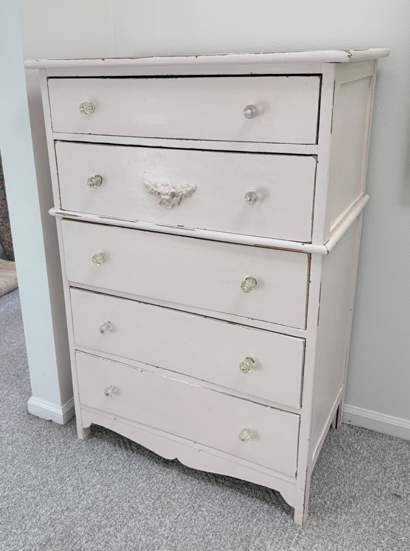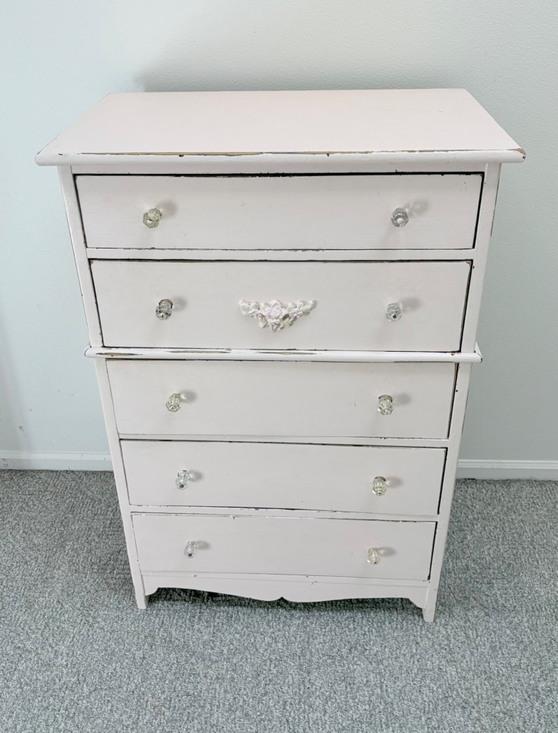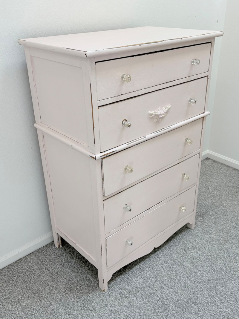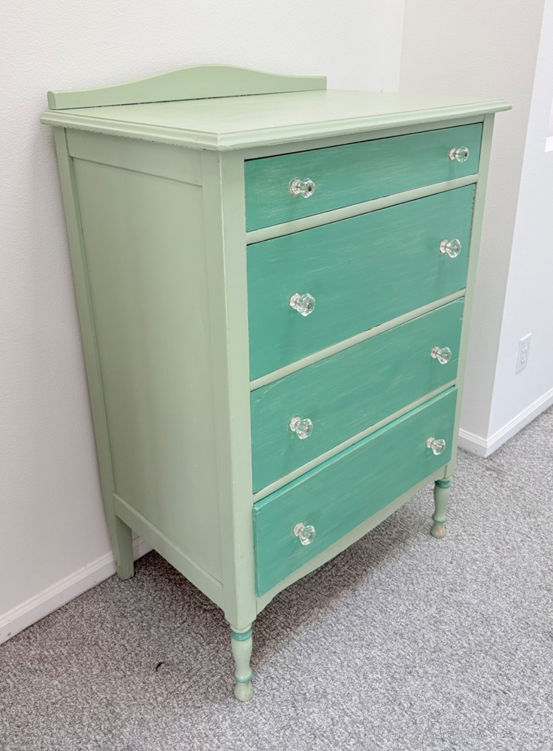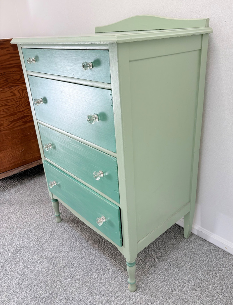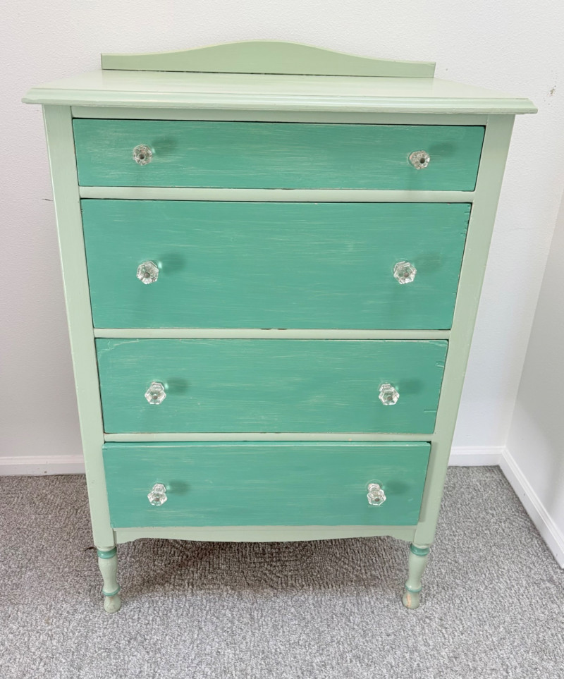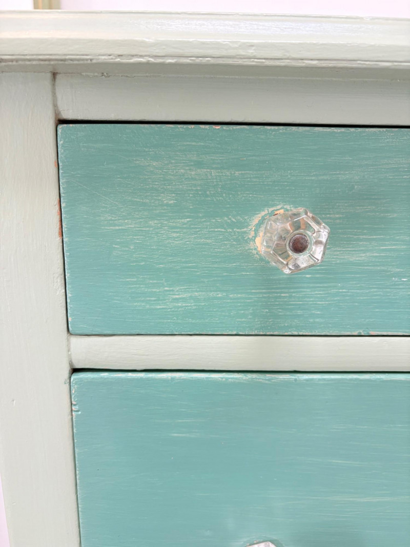 Pair of vintage/antique chests of drawers - both with a distressed finished earned rather than applied!, The pinkish one has had a bit more neglect than the green one. However, both are solid wood and have cut glass pulls. Pale pink chest of drawers has 5 drawers and shaped lower apron. Measures 43" H x 29.5" W x 19" D. Green two-tone chest of drawers has 4 drawers (with the top one being quite narrow), turned lower legs, and a small backsplash at the top. Measures 45" H including backstop x 31.5" W x 21" D. Please note that these are probably a DIY project for many buyers - they would be great for a storage room or garage but need a good scrub and some screwdriver work if you want them in your bedroom. Drawers are old with no guides, but very sturdy.