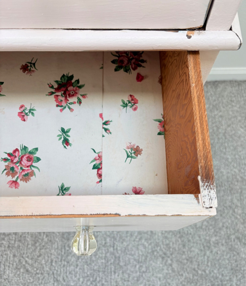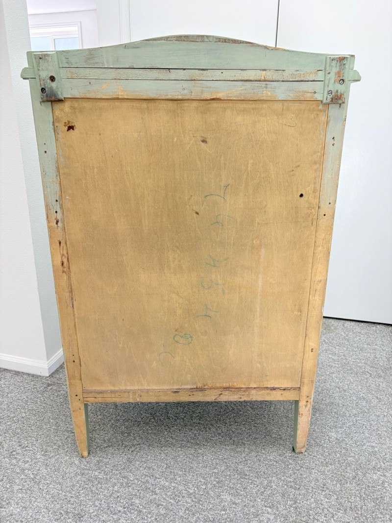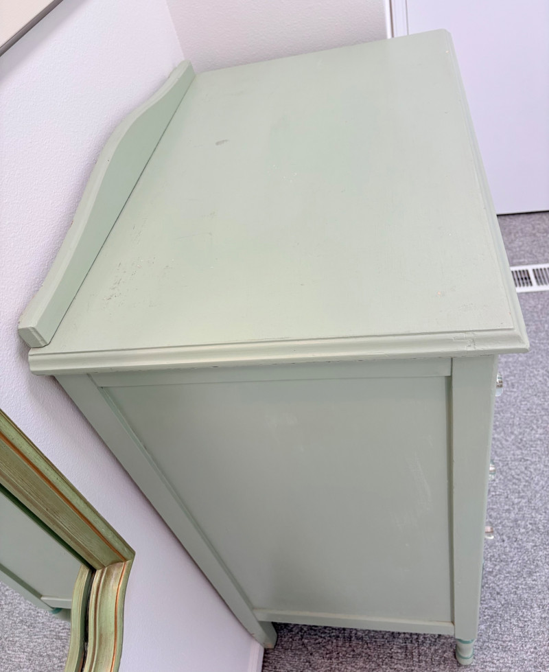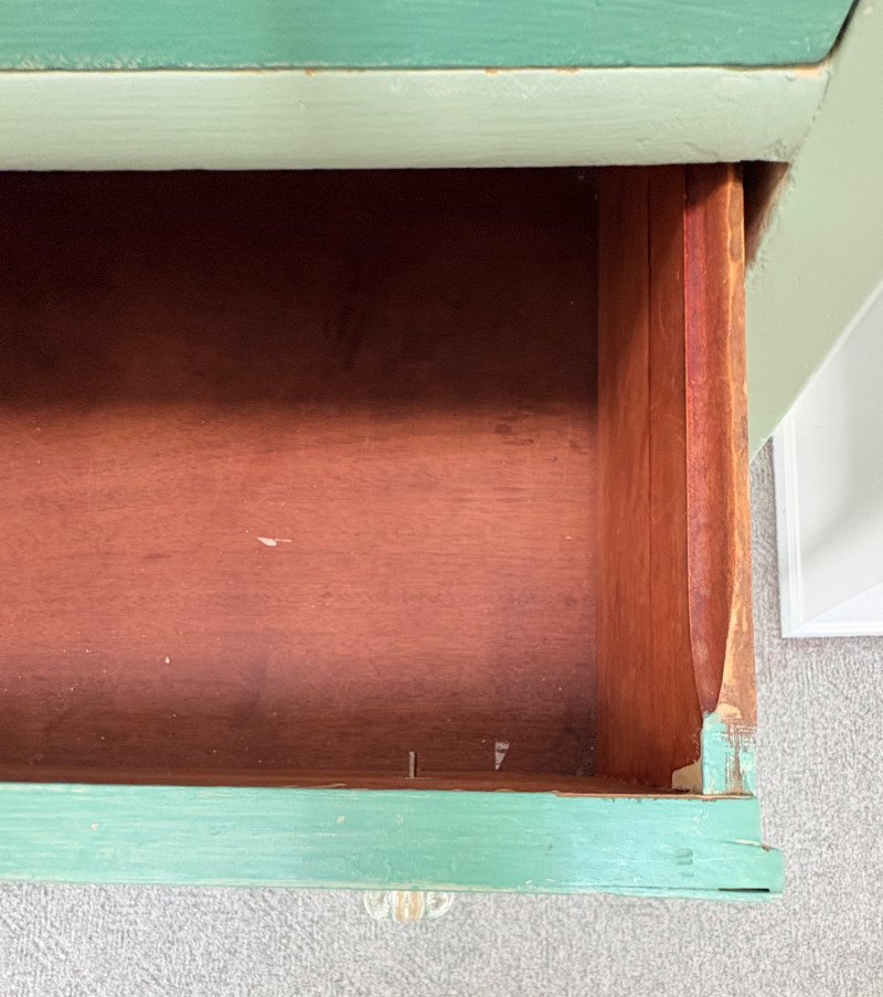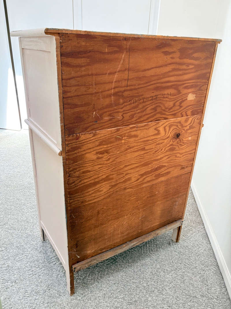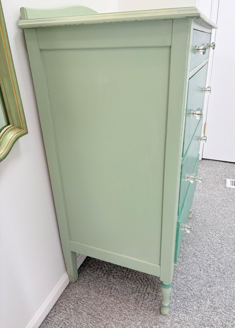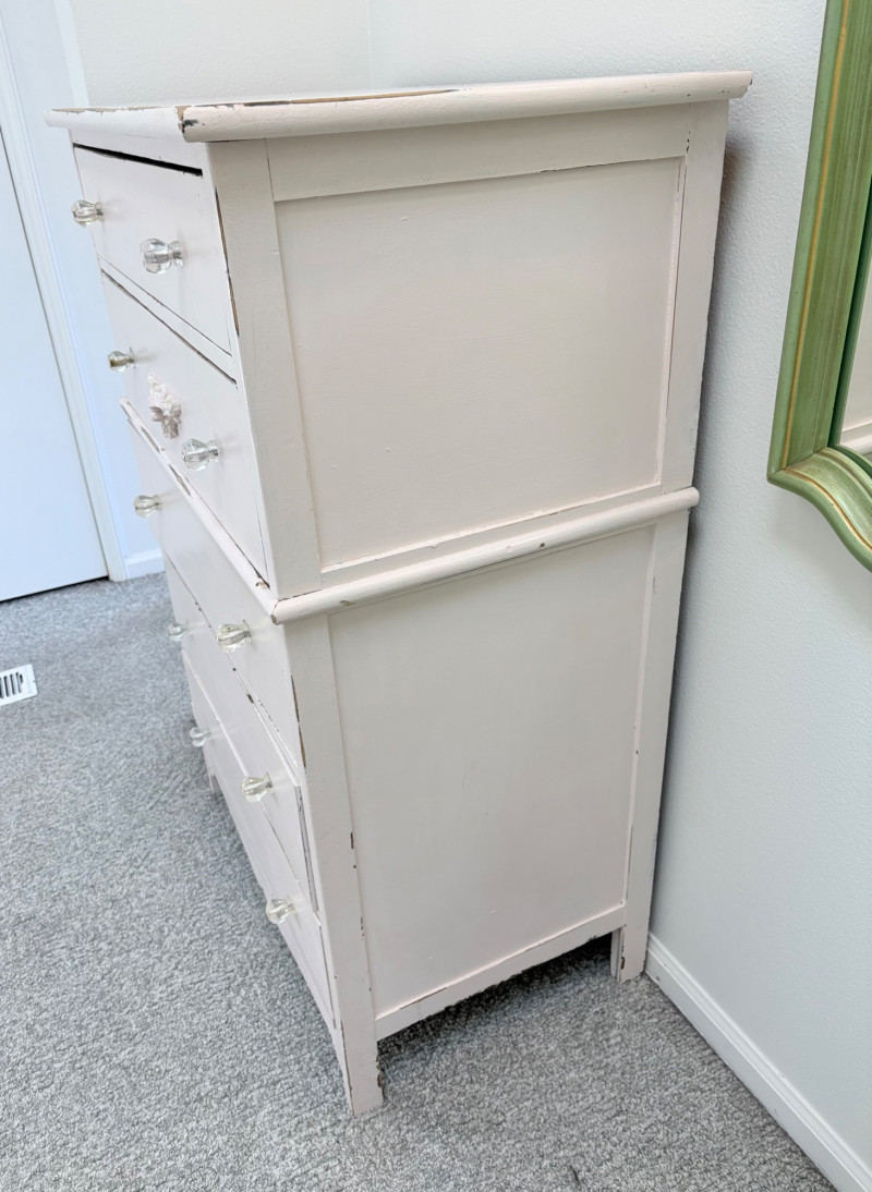 Pair of vintage/antique chests of drawers - both with a distressed finished earned rather than applied!, The pinkish one has had a bit more neglect than the green one. However, both are solid wood and have cut glass pulls. Pale pink chest of drawers has 5 drawers and shaped lower apron. Measures 43" H x 29.5" W x 19" D. Green two-tone chest of drawers has 4 drawers (with the top one being quite narrow), turned lower legs, and a small backsplash at the top. Measures 45" H including backstop x 31.5" W x 21" D. Please note that these are probably a DIY project for many buyers - they would be great for a storage room or garage but need a good scrub and some screwdriver work if you want them in your bedroom. Drawers are old with no guides, but very sturdy.