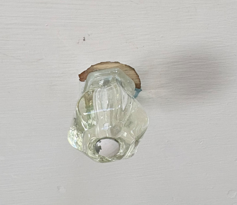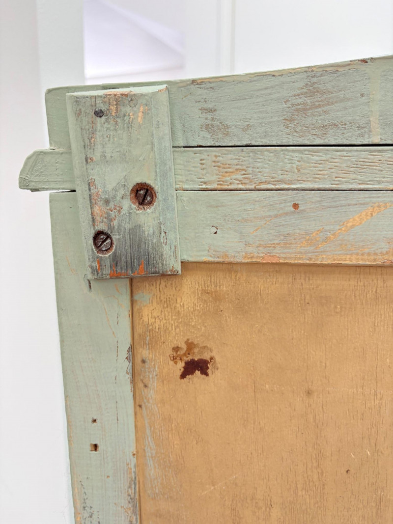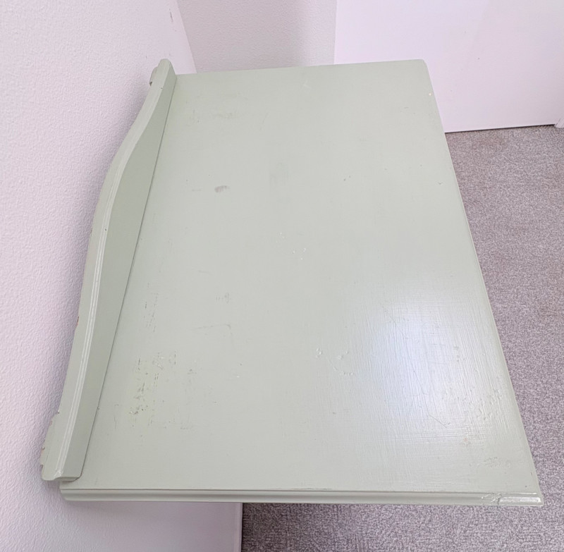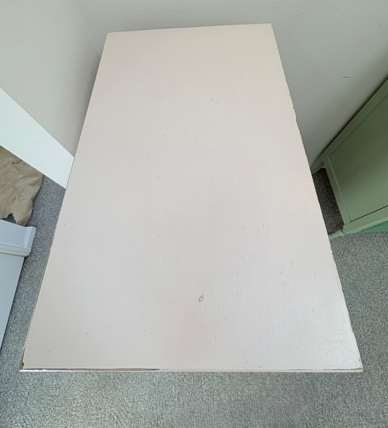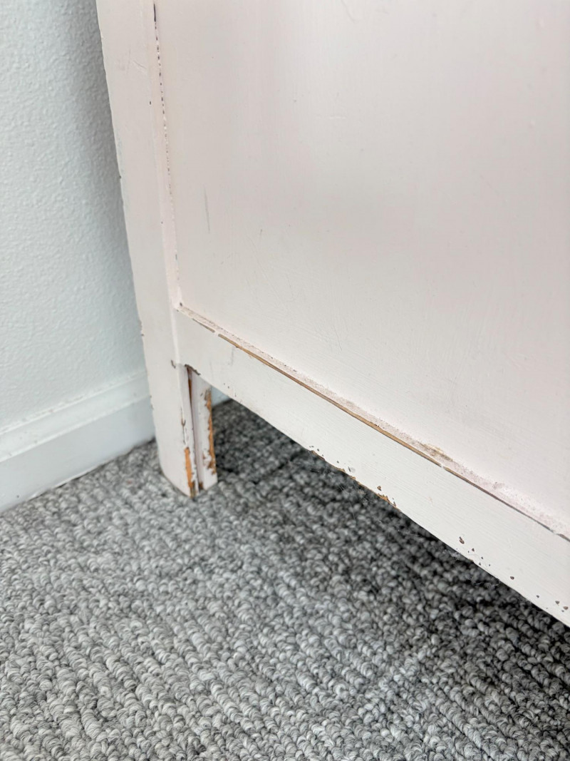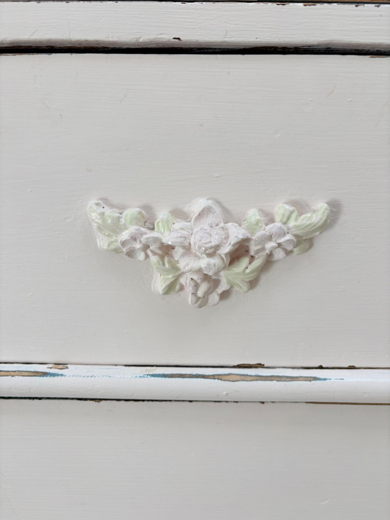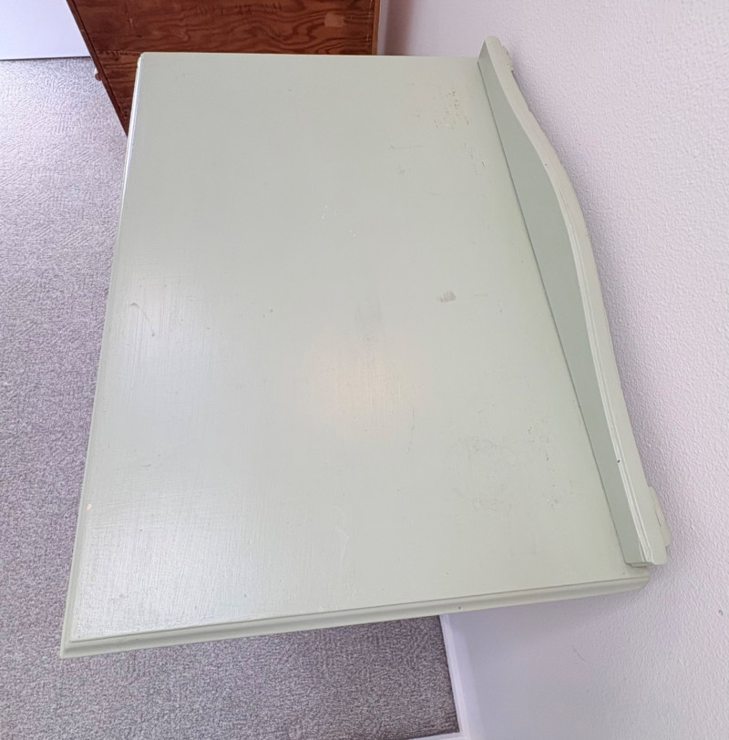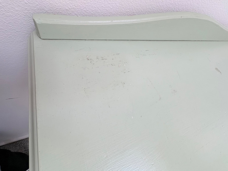 Pair of vintage/antique chests of drawers - both with a distressed finished earned rather than applied!, The pinkish one has had a bit more neglect than the green one. However, both are solid wood and have cut glass pulls. Pale pink chest of drawers has 5 drawers and shaped lower apron. Measures 43" H x 29.5" W x 19" D. Green two-tone chest of drawers has 4 drawers (with the top one being quite narrow), turned lower legs, and a small backsplash at the top. Measures 45" H including backstop x 31.5" W x 21" D. Please note that these are probably a DIY project for many buyers - they would be great for a storage room or garage but need a good scrub and some screwdriver work if you want them in your bedroom. Drawers are old with no guides, but very sturdy.