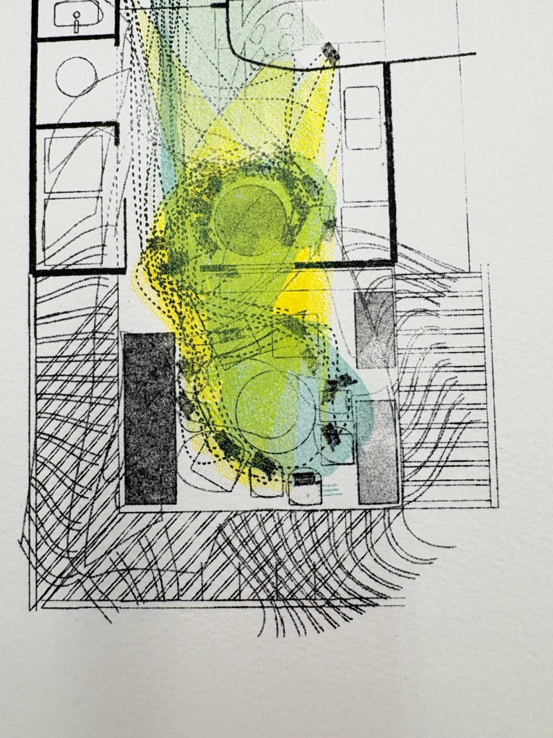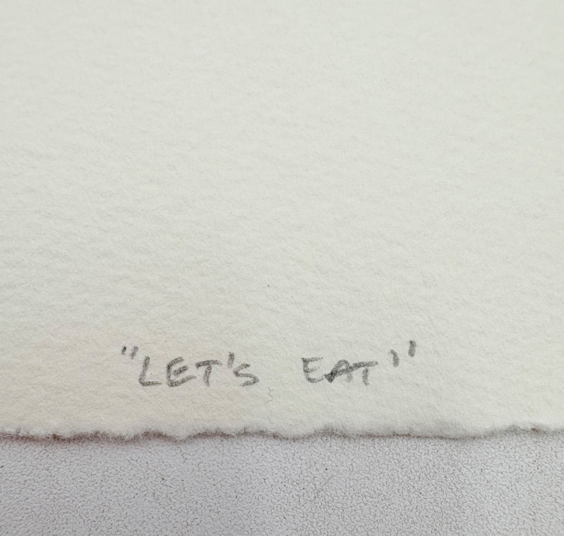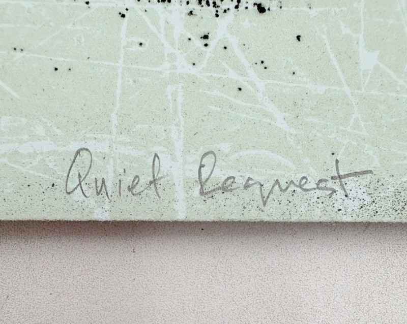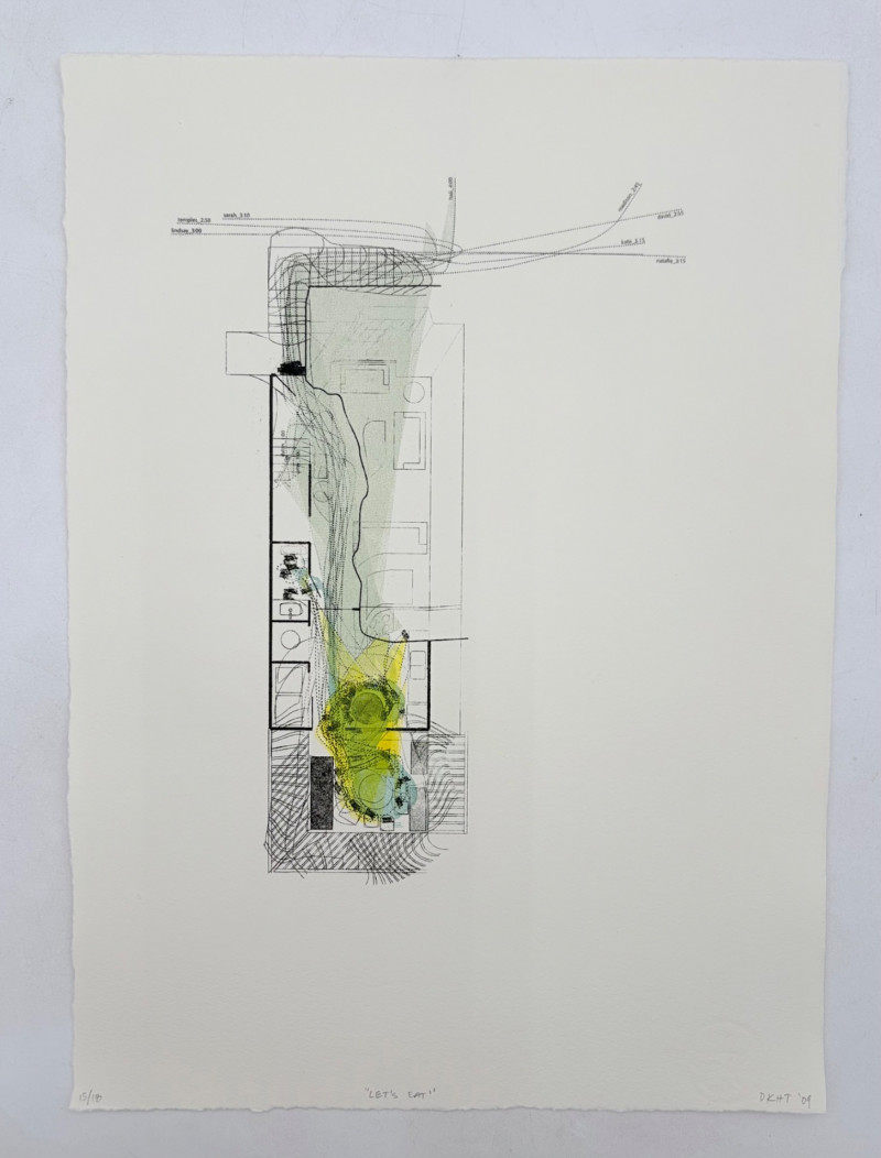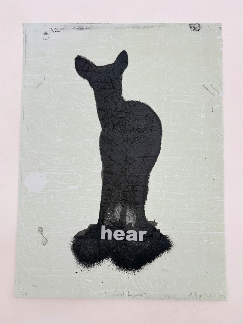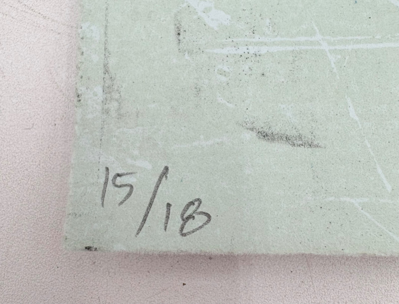 "Let's Eat" print in fine line with a wash of color by DKHT (Dylan Thomas). This is #15 of an edition of 18. Measures 15" H x 11" W unframed. "Quiet Request" print in black on green with silhouette by Marty Epp-Carter. This is #15 of an edition of 18. Measures 15" H x 11" W unframed. Both pieces from the Theme = Identity Portfolio published in 2009. Both are signed & numbered by the artist in pencil.