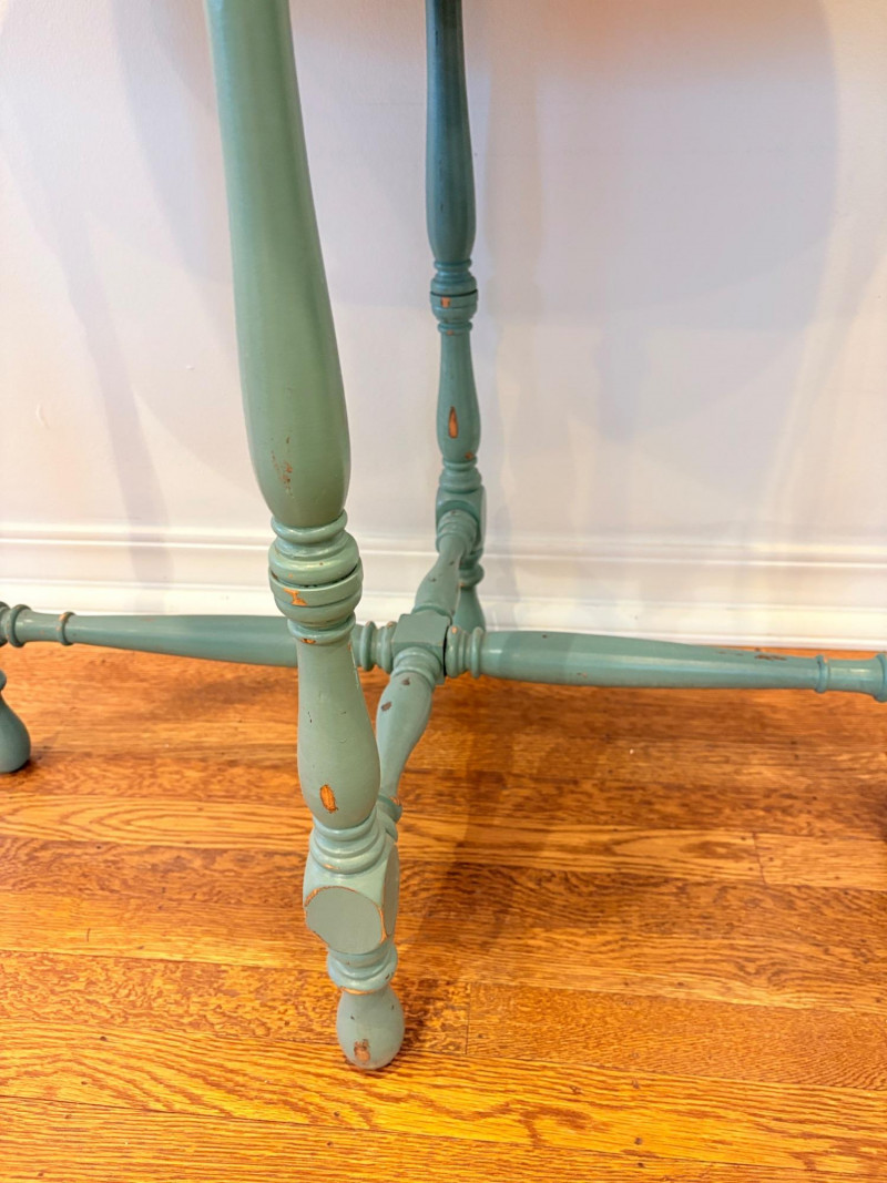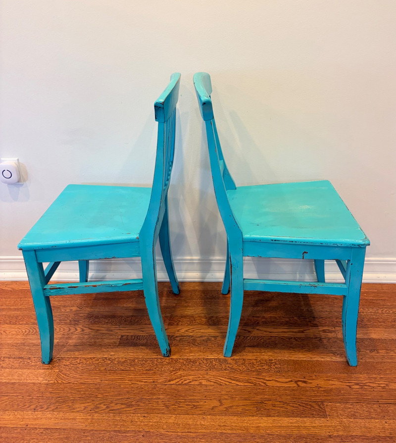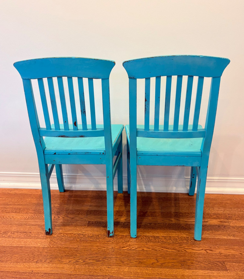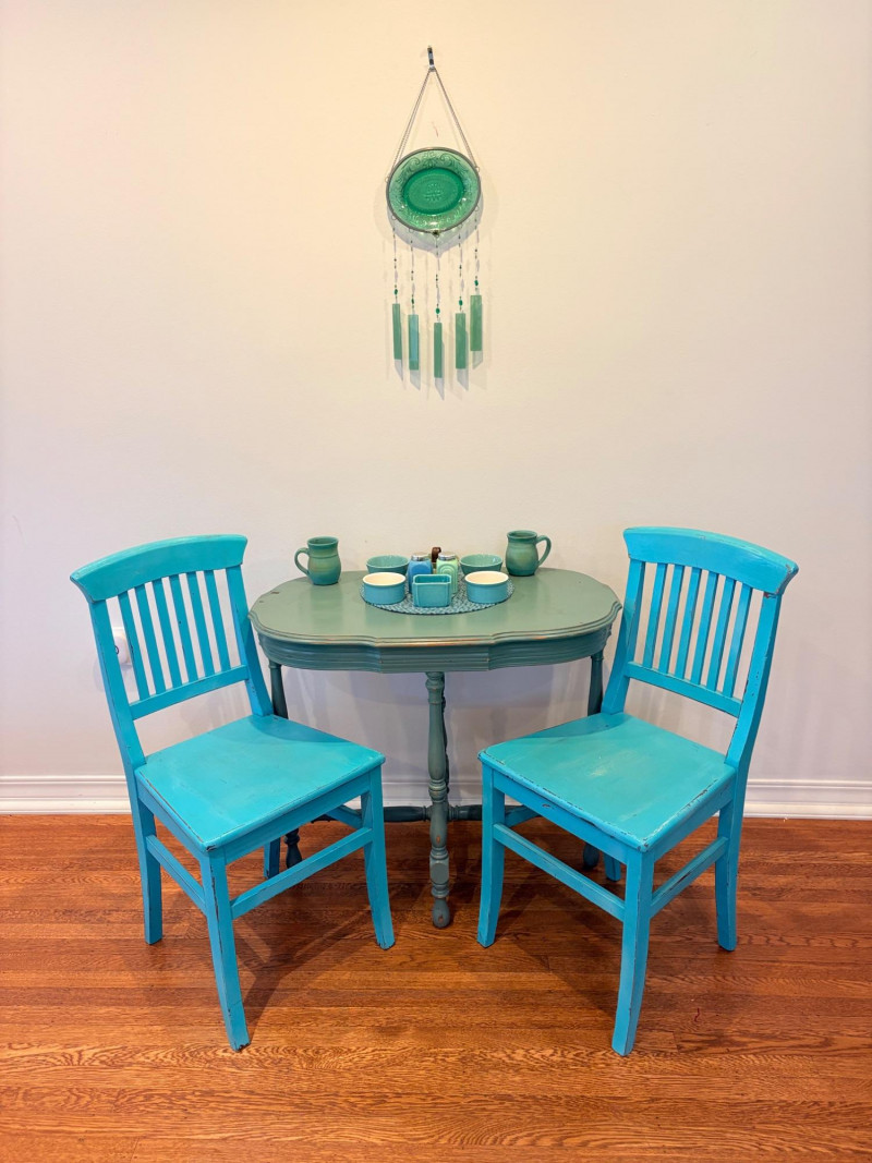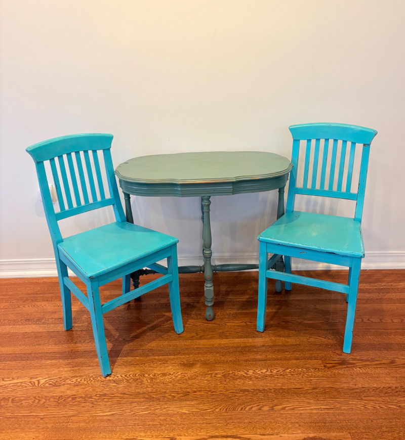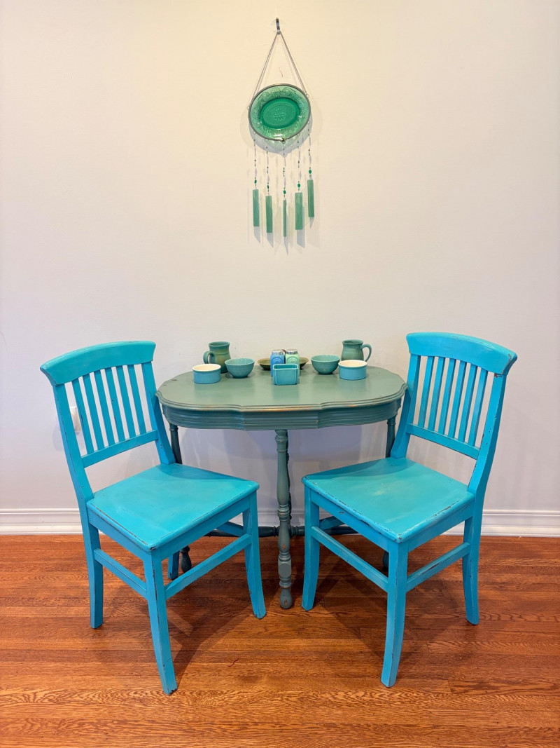 This lot is a room to go. You’ve got everything you need for a little snack table in brilliant teal and green. Lot includes distressed table and chairs, glass wall ornament, and dishes as shown. Bright teal wooden chairs measure 36" H x 17.5" W x 19" D. Both are old but sturdy and show their age. Turned-leg table with lots of detailing has lower stretcher brace and routed top. Measures 29" H x 33" W x 21" D.. Like the chairs, this is definitely antique but still serviceable. Table top items include salt and pepper shakers, 2 ramekins, a sugar packet holder, 2 hand-turned ceramic cups, 2 two small bowls, and a handcrafted green and brown serving dish. Hanging wall ornament made from the antique glass plate measures approximately 25" from top of chain to bottom of glass dangles.