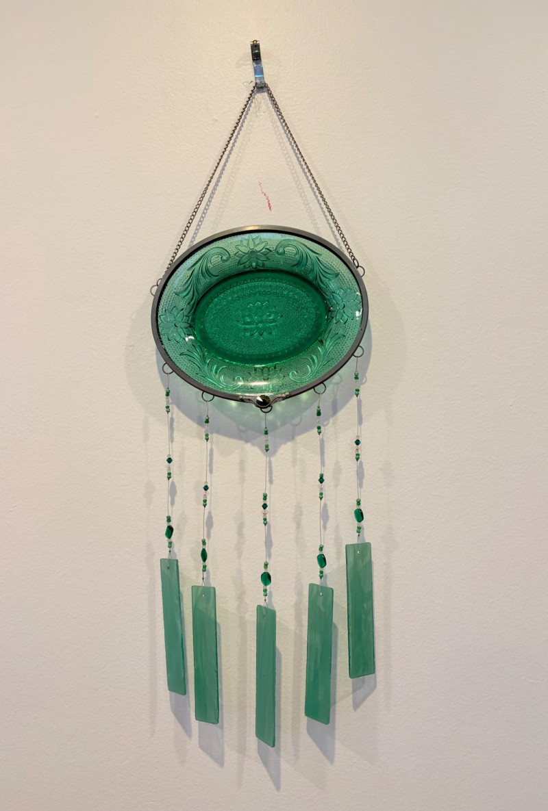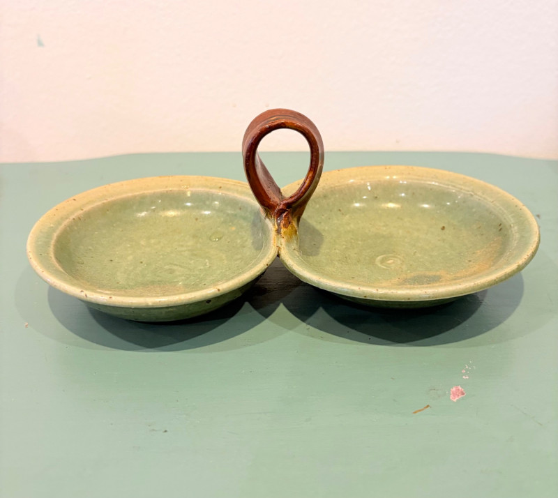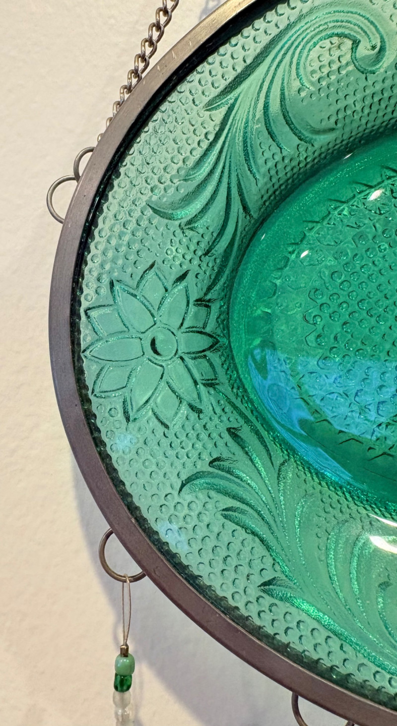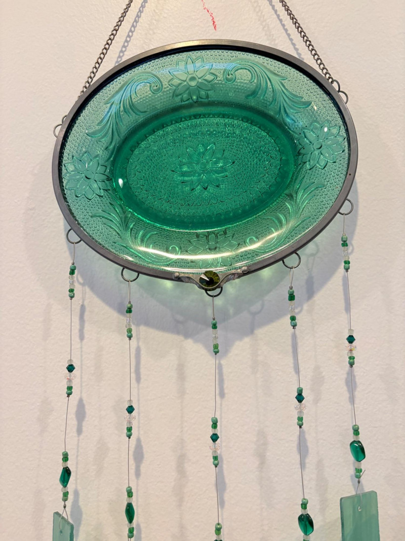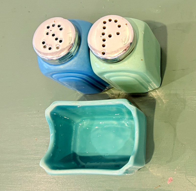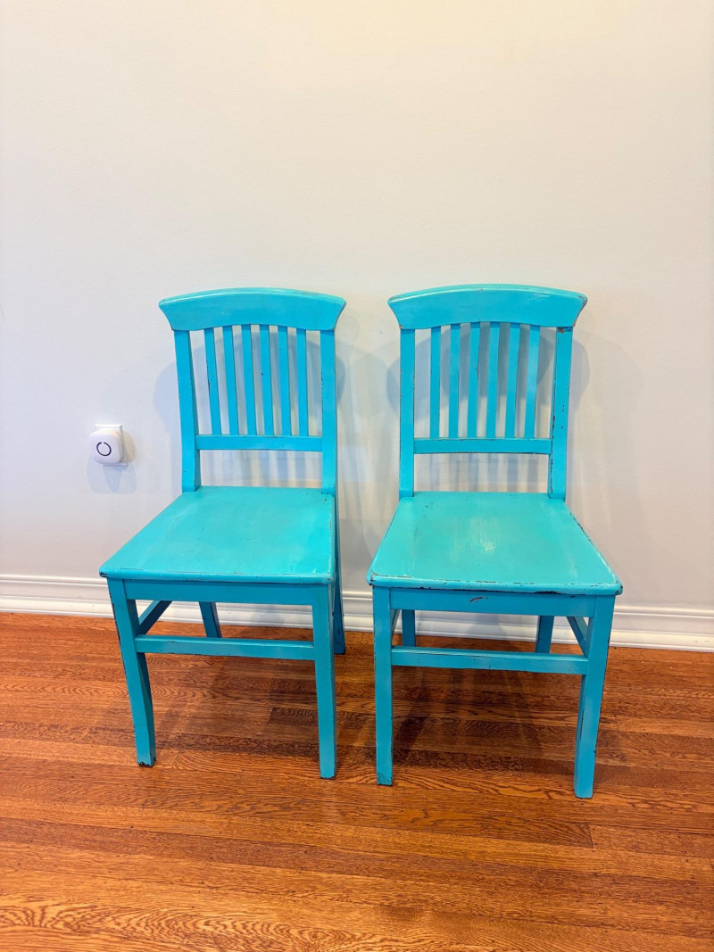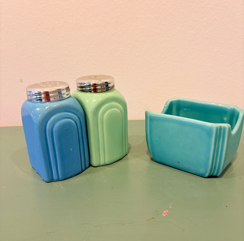 This lot is a room to go. You’ve got everything you need for a little snack table in brilliant teal and green. Lot includes distressed table and chairs, glass wall ornament, and dishes as shown. Bright teal wooden chairs measure 36" H x 17.5" W x 19" D. Both are old but sturdy and show their age. Turned-leg table with lots of detailing has lower stretcher brace and routed top. Measures 29" H x 33" W x 21" D.. Like the chairs, this is definitely antique but still serviceable. Table top items include salt and pepper shakers, 2 ramekins, a sugar packet holder, 2 hand-turned ceramic cups, 2 two small bowls, and a handcrafted green and brown serving dish. Hanging wall ornament made from the antique glass plate measures approximately 25" from top of chain to bottom of glass dangles.