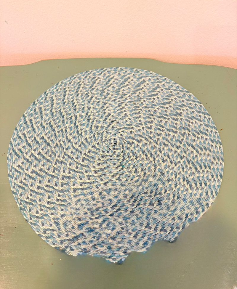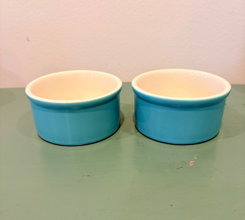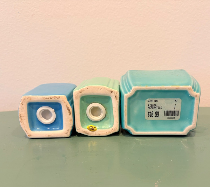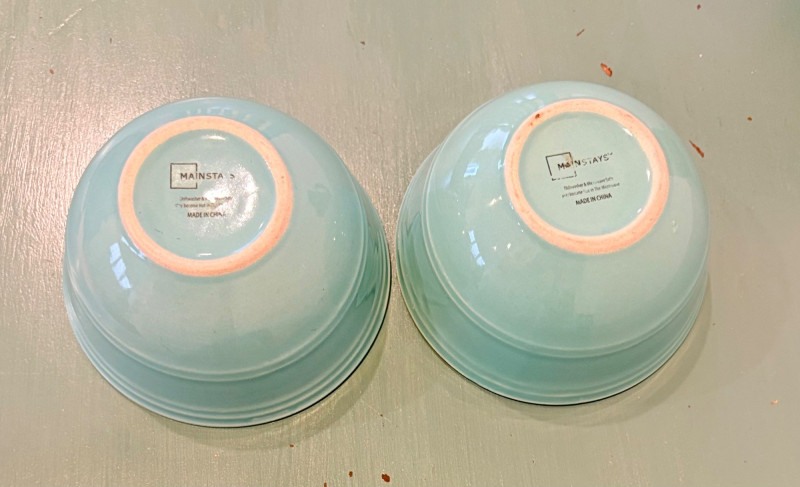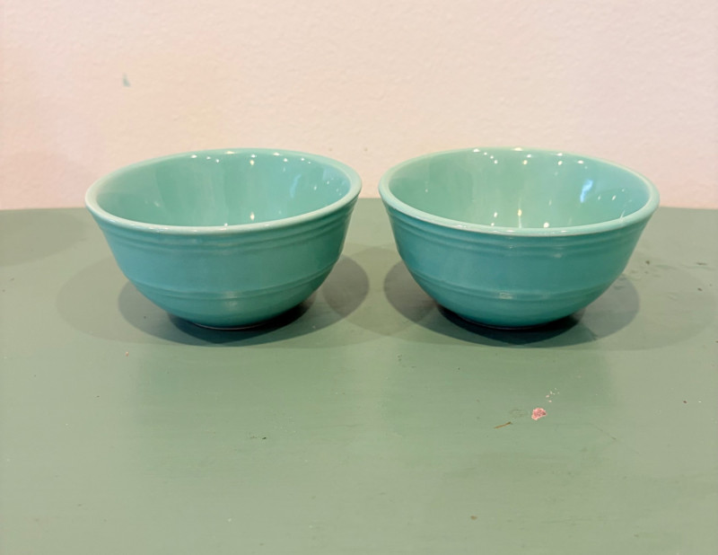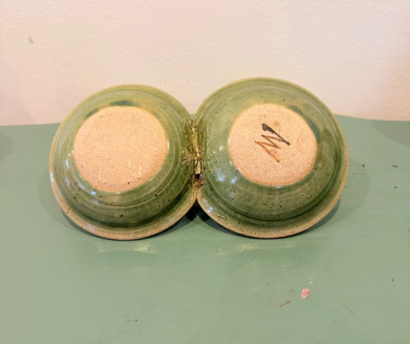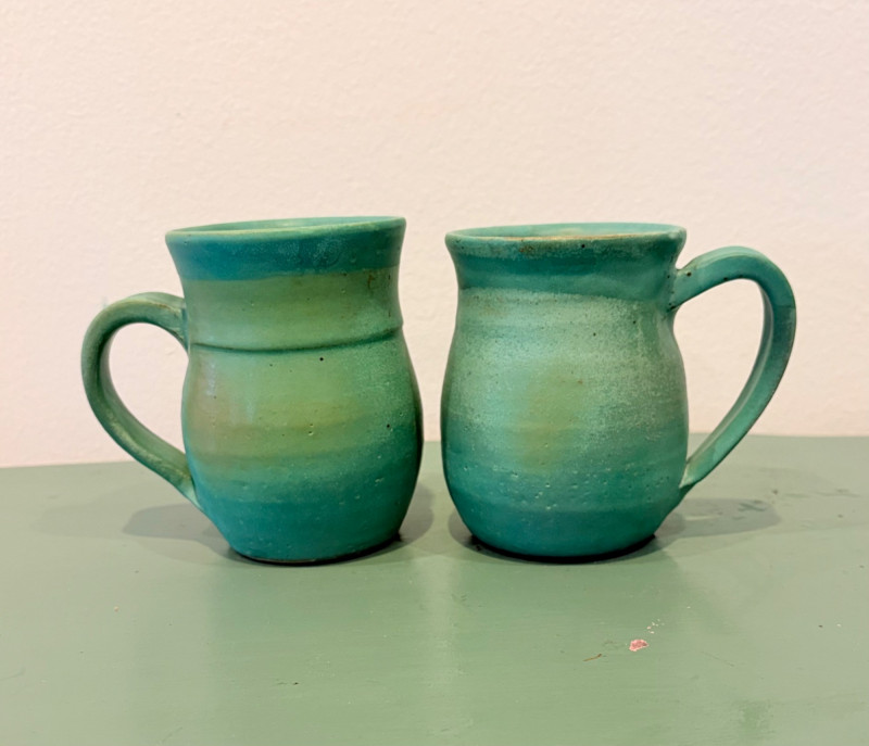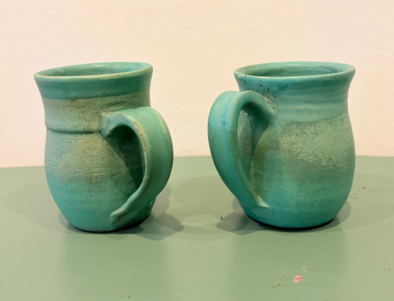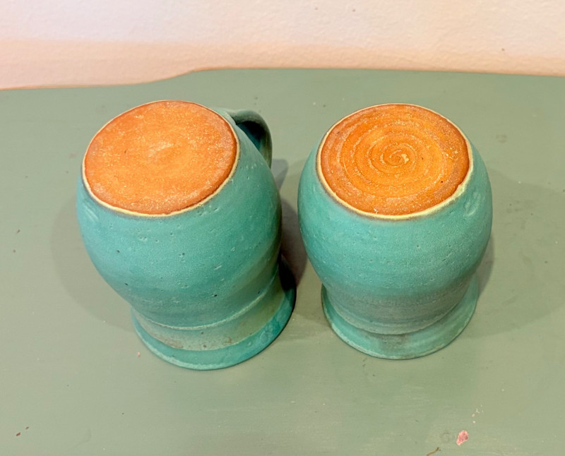 This lot is a room to go. You’ve got everything you need for a little snack table in brilliant teal and green. Lot includes distressed table and chairs, glass wall ornament, and dishes as shown. Bright teal wooden chairs measure 36" H x 17.5" W x 19" D. Both are old but sturdy and show their age. Turned-leg table with lots of detailing has lower stretcher brace and routed top. Measures 29" H x 33" W x 21" D.. Like the chairs, this is definitely antique but still serviceable. Table top items include salt and pepper shakers, 2 ramekins, a sugar packet holder, 2 hand-turned ceramic cups, 2 two small bowls, and a handcrafted green and brown serving dish. Hanging wall ornament made from the antique glass plate measures approximately 25" from top of chain to bottom of glass dangles.