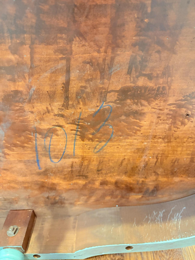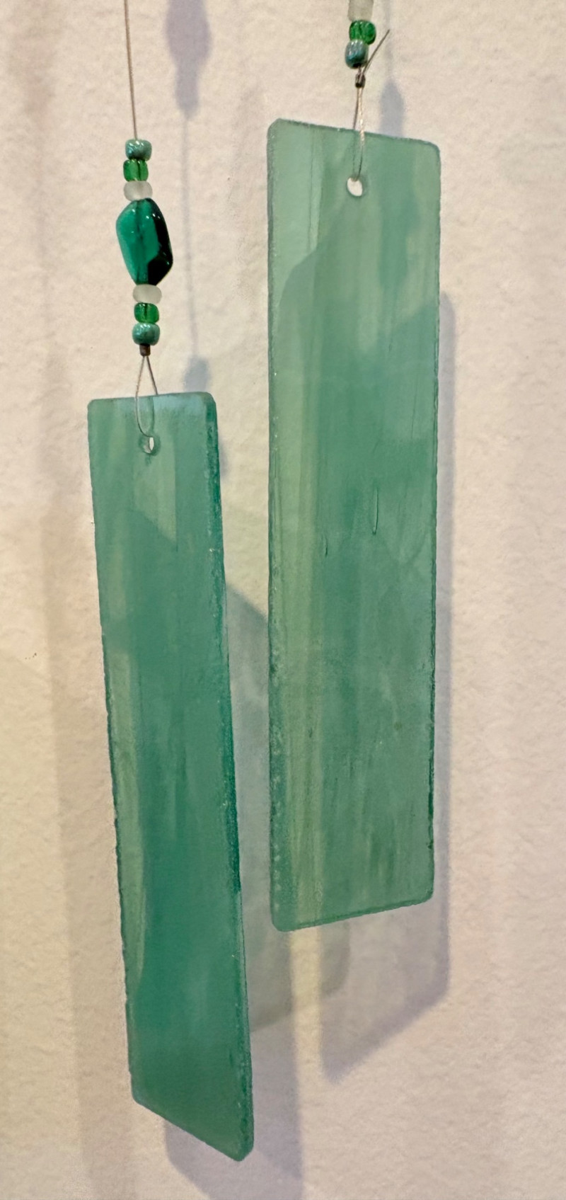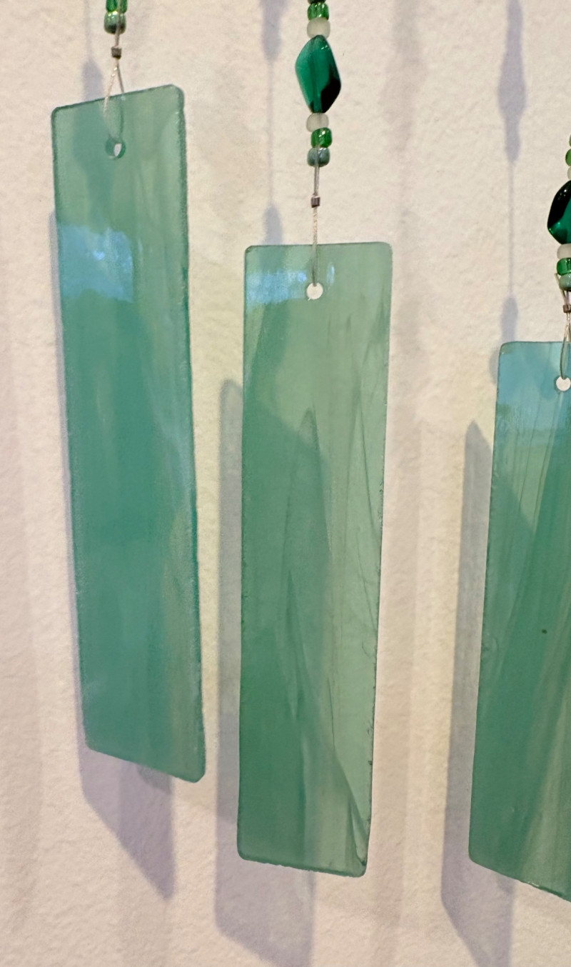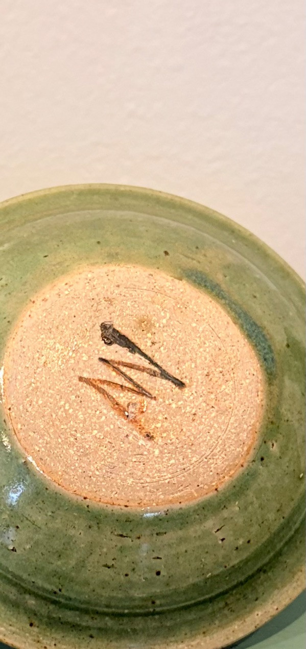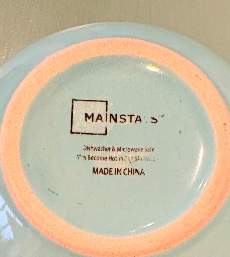 This lot is a room to go. You’ve got everything you need for a little snack table in brilliant teal and green. Lot includes distressed table and chairs, glass wall ornament, and dishes as shown. Bright teal wooden chairs measure 36" H x 17.5" W x 19" D. Both are old but sturdy and show their age. Turned-leg table with lots of detailing has lower stretcher brace and routed top. Measures 29" H x 33" W x 21" D.. Like the chairs, this is definitely antique but still serviceable. Table top items include salt and pepper shakers, 2 ramekins, a sugar packet holder, 2 hand-turned ceramic cups, 2 two small bowls, and a handcrafted green and brown serving dish. Hanging wall ornament made from the antique glass plate measures approximately 25" from top of chain to bottom of glass dangles.