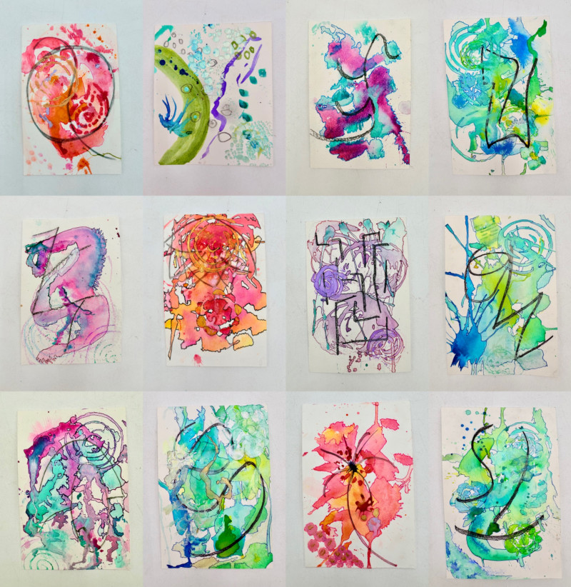 12 different small works in paint and ink on heavy