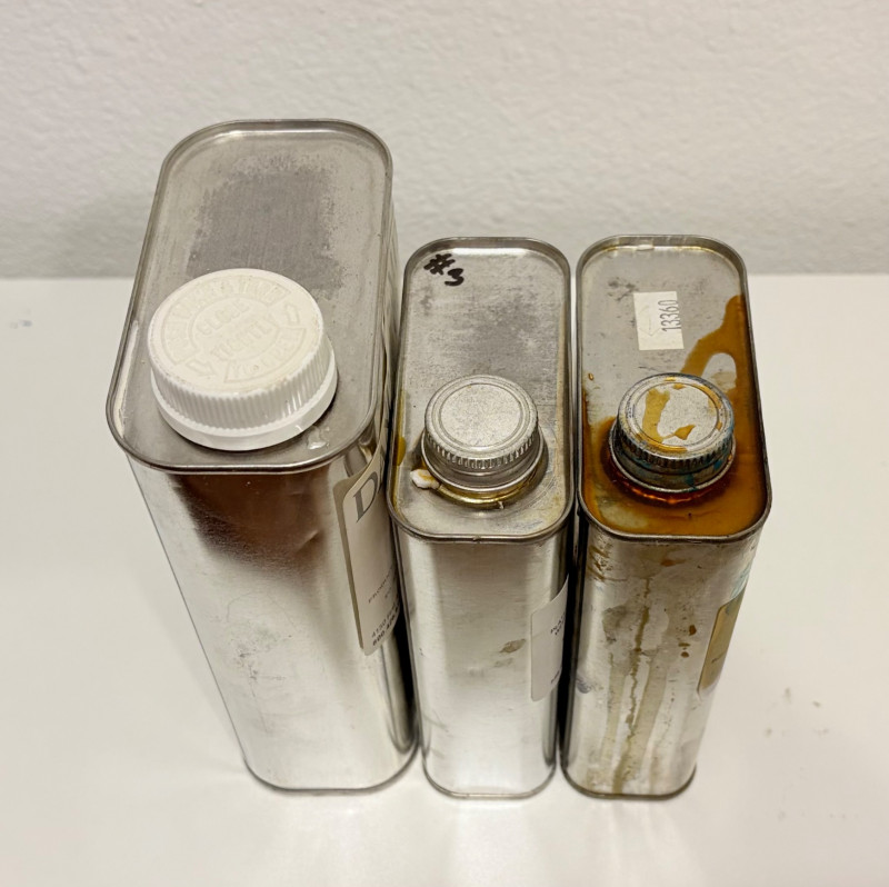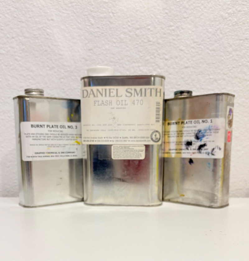 We have three different oils for ink reduction - all are full or nearly full. Daniel Smith Flash Oil 470 ink reducer (1 quart) - feels full. Graphic Chemical & Ink Company Burnt Plate Oil #1 - feels about 3/4 or more full. Graphic Chemical & Ink Company Burnt Plate Oil #3.- feels about 3/4 or more full. Note that the 2 burnt oil containers have no volume listed on them - see photo comparing them with the Daniel Smith quart container.