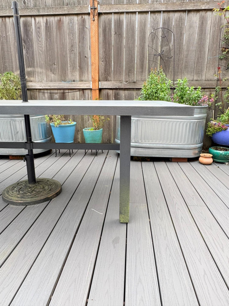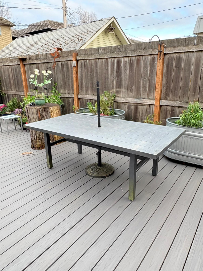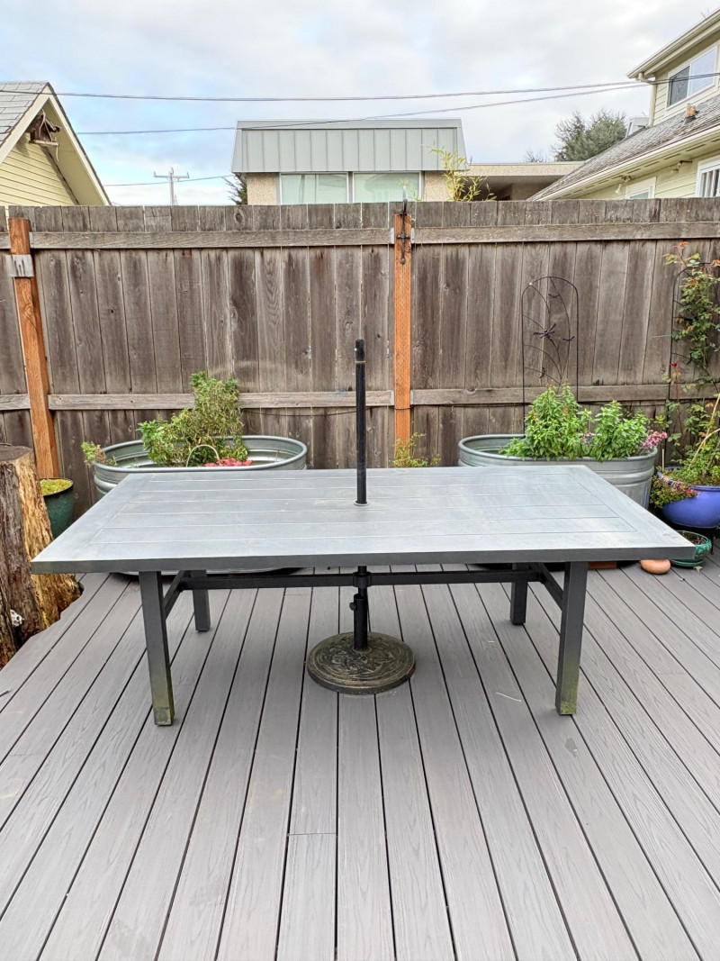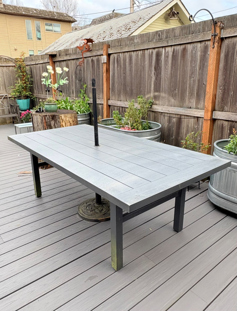 Sleek, gray metal outdoor table. Minimalist "planked" look makes it subtly stylish. It does show some slight wear – (see last two photos for most egregious areas), but would be fabulous for outdoor dining or plant display. Has umbrella hole in the middle and comes with umbrella stand - you just need to supply the umbrella. In need of a good scrub to look truly wonderful. (We have one that is in "OK" condition if you would like it in light blue - please ask at pickup and we will fetch it for you.) Measures 28.5" H x 84" L x 42.5" D.