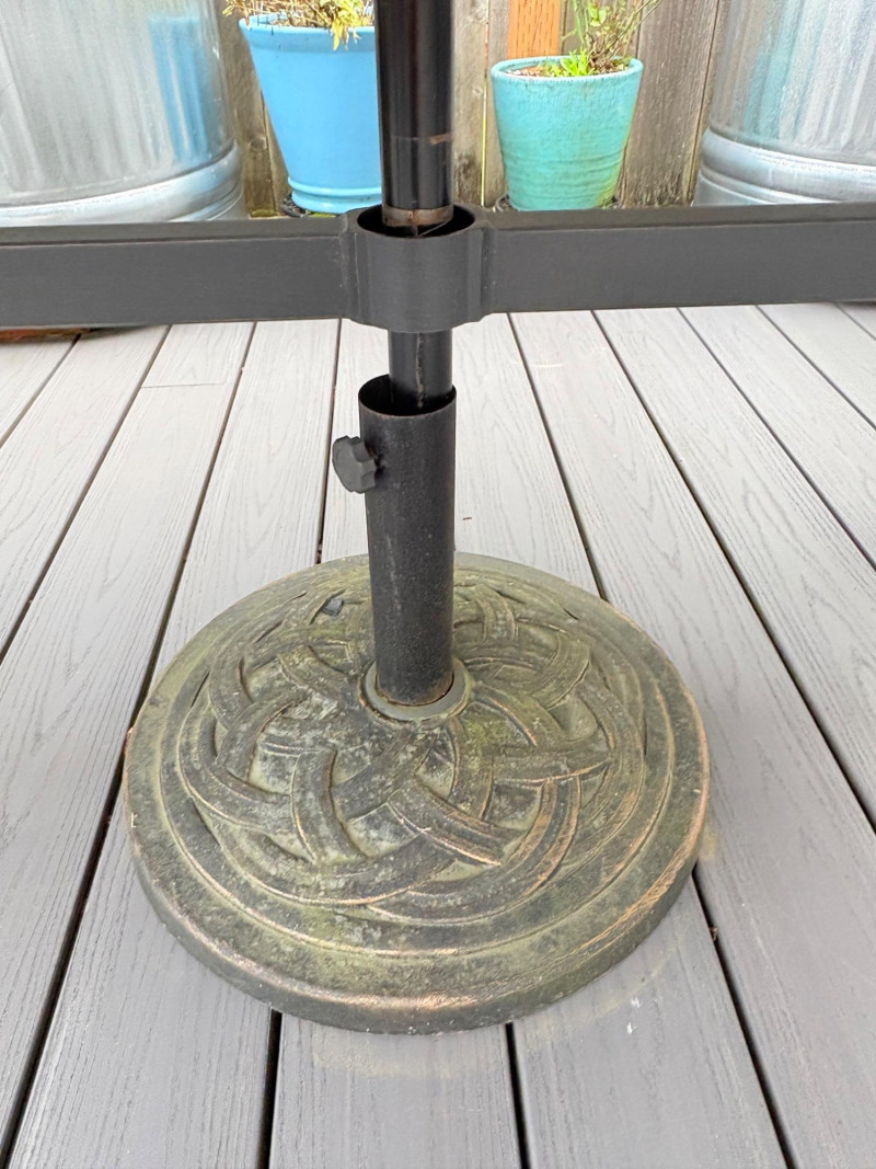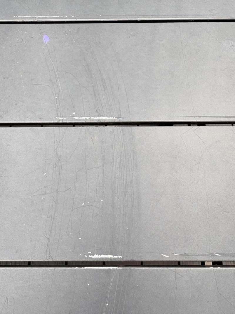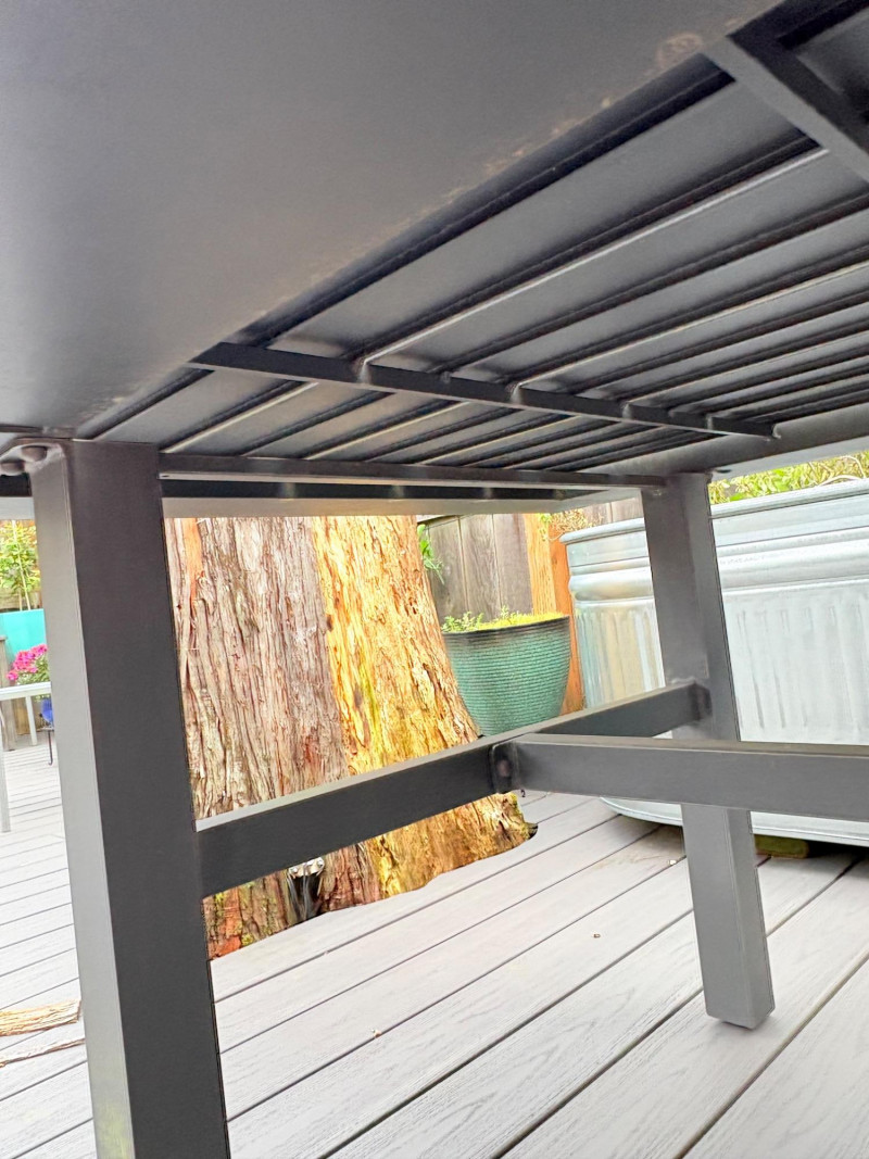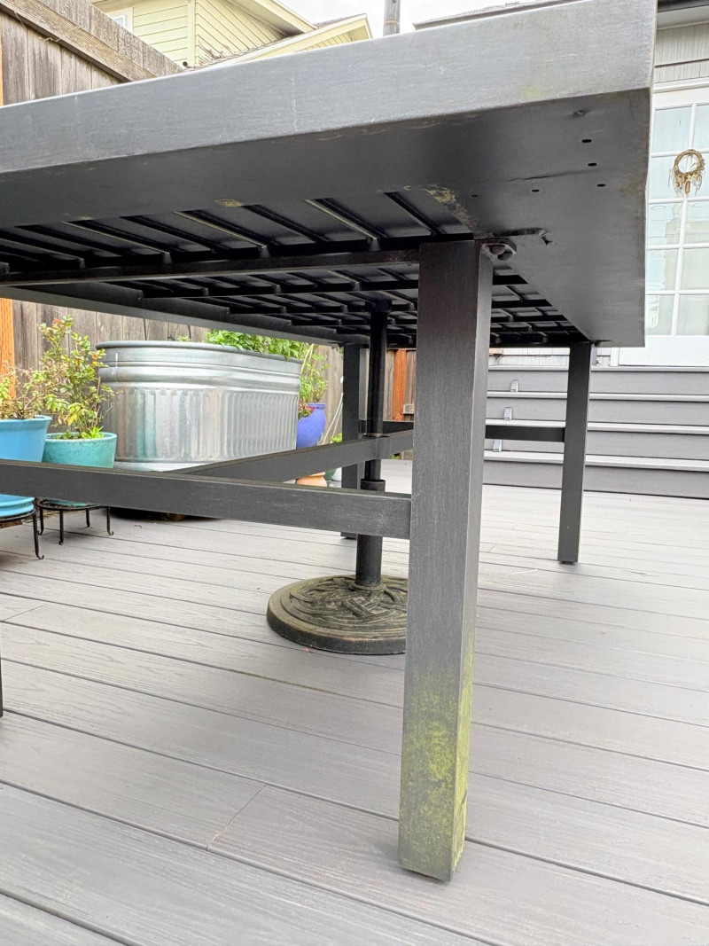 Sleek, gray metal outdoor table. Minimalist "planked" look makes it subtly stylish. It does show some slight wear – (see last two photos for most egregious areas), but would be fabulous for outdoor dining or plant display. Has umbrella hole in the middle and comes with umbrella stand - you just need to supply the umbrella. In need of a good scrub to look truly wonderful. (We have one that is in "OK" condition if you would like it in light blue - please ask at pickup and we will fetch it for you.) Measures 28.5" H x 84" L x 42.5" D.