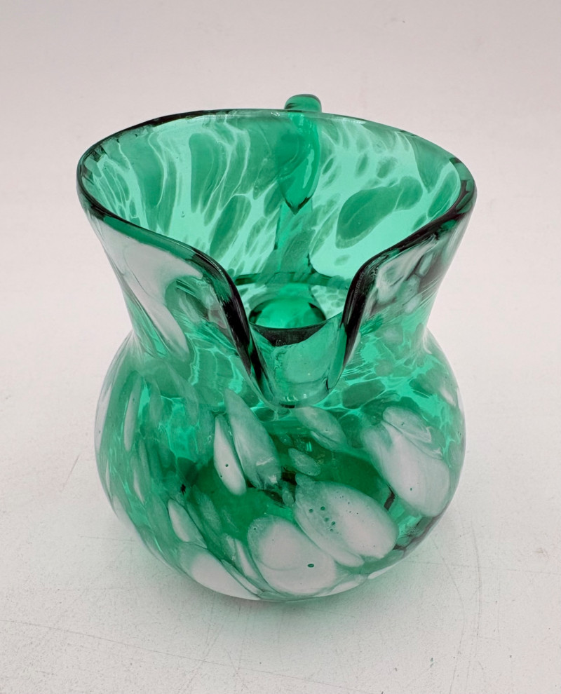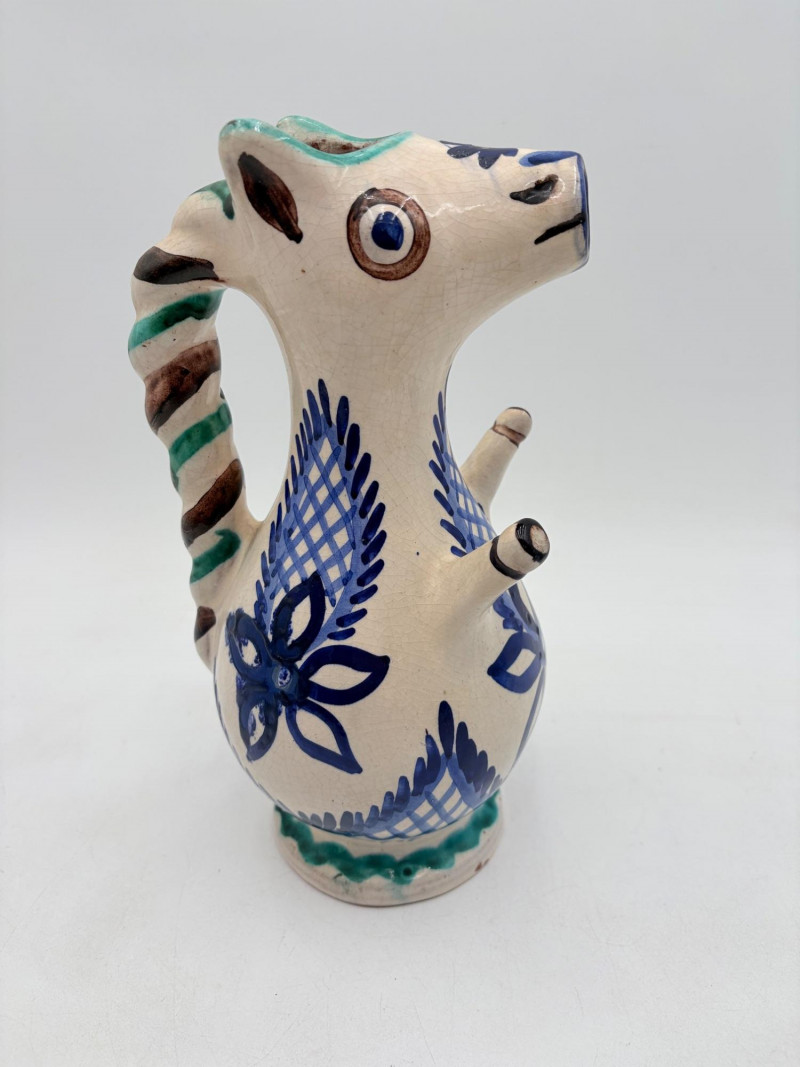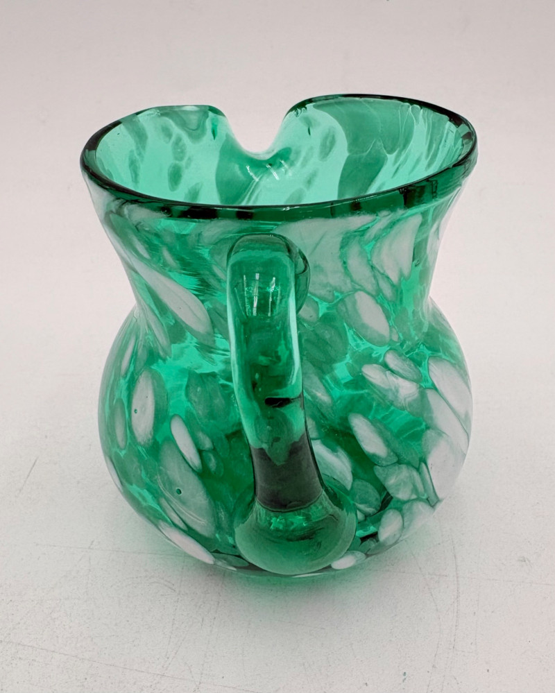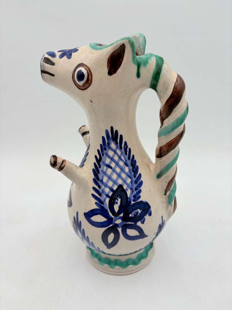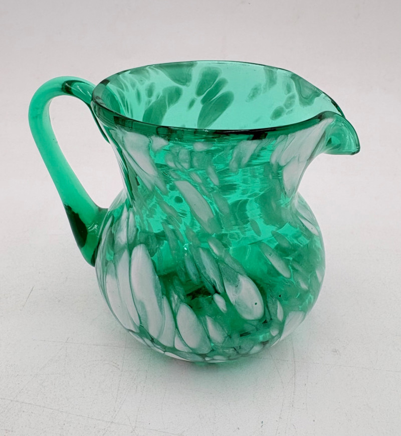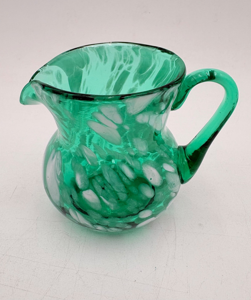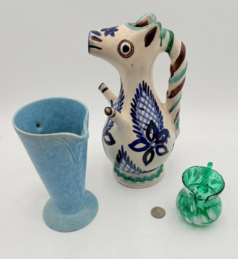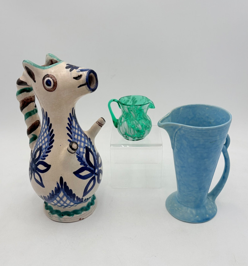 3 vintage pitchers of wildly differing styles, colors, and purposes! Vintage Greek horse-shaped earthenware jug from a workshop on Lesbos; probably from the village of Agiasos which is known for its traditional pottery in this style. Measures 11" H. Vintage Wade Heath Pottery of England deco-style pitcher with matte blue mottled glaze. (Flaxman Ware line) Measures 8" H. Handblown small glass creamer pitcher with white splatter design. Artist unknown. Measures 3" H.