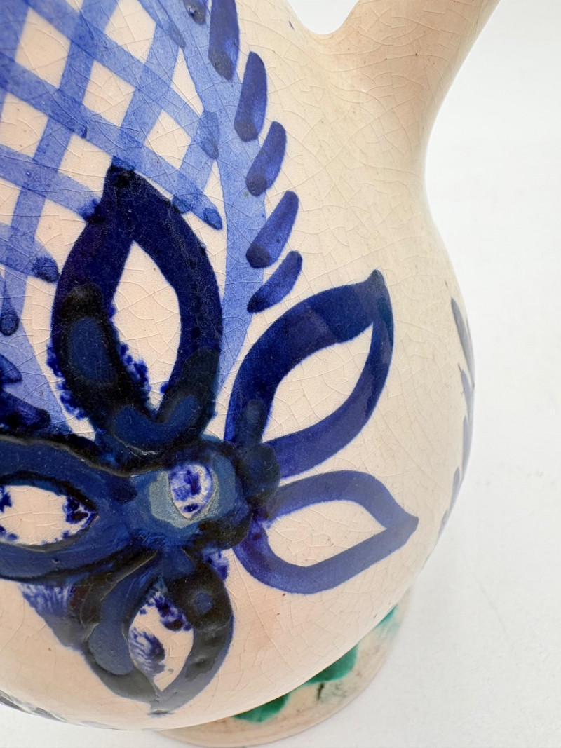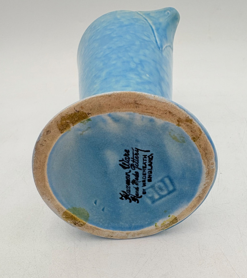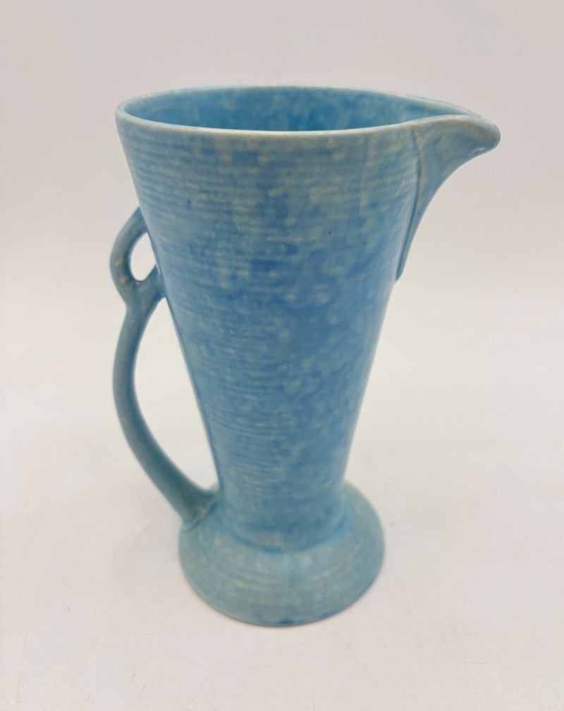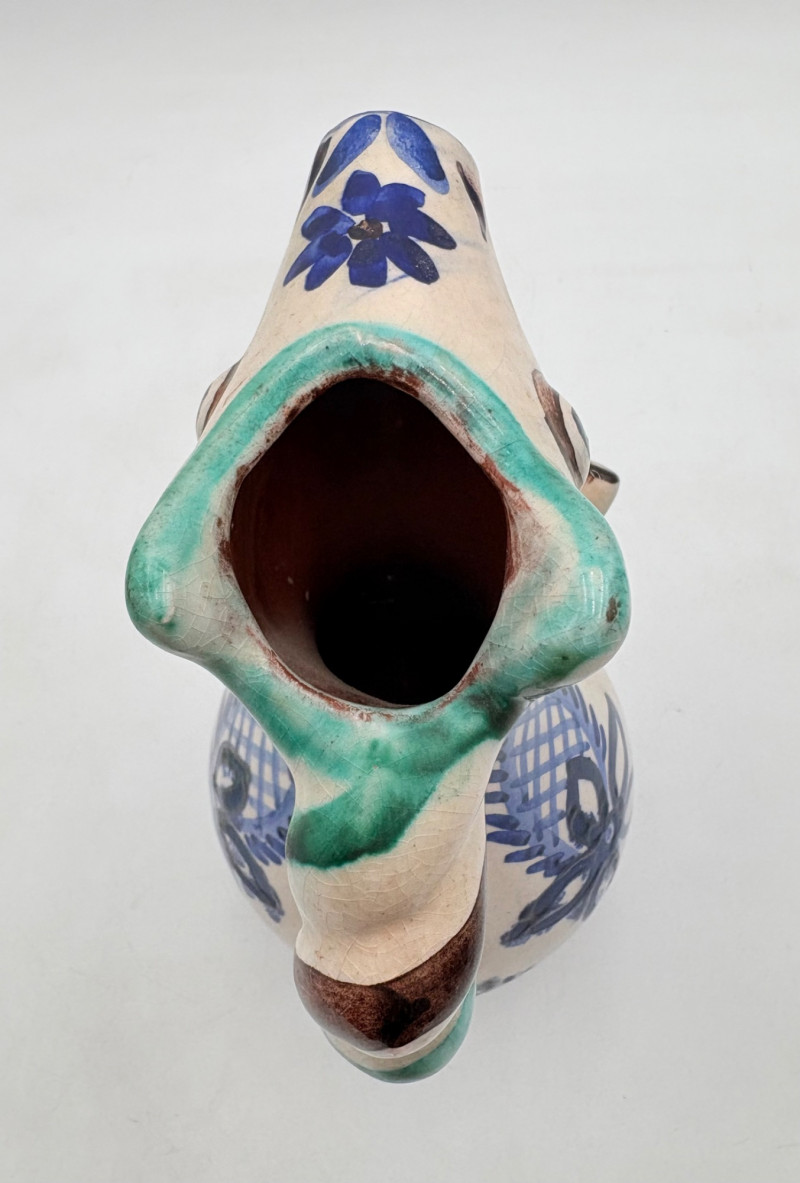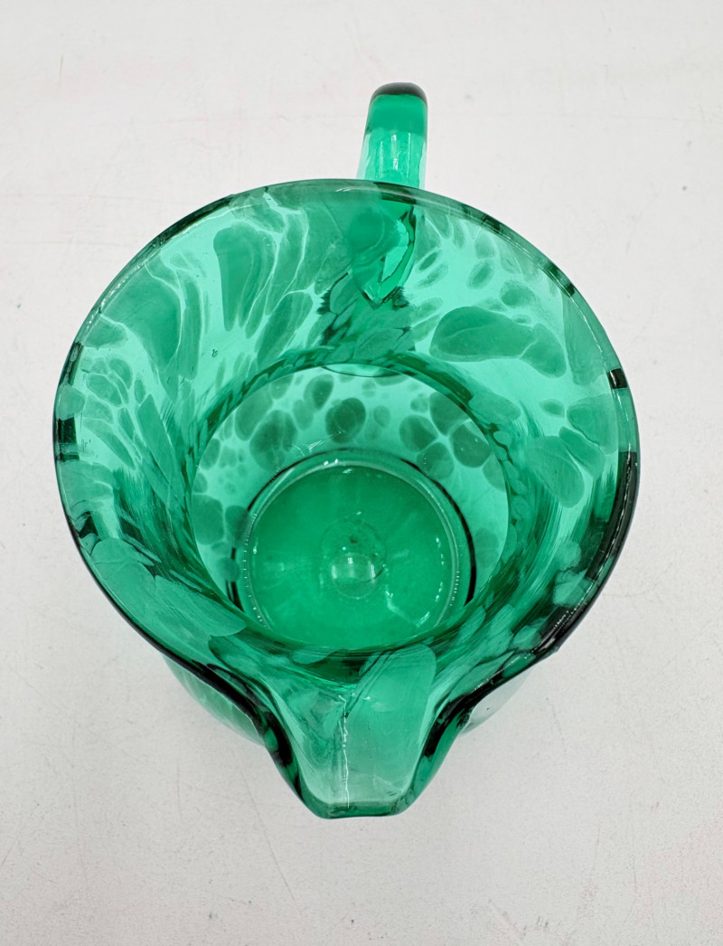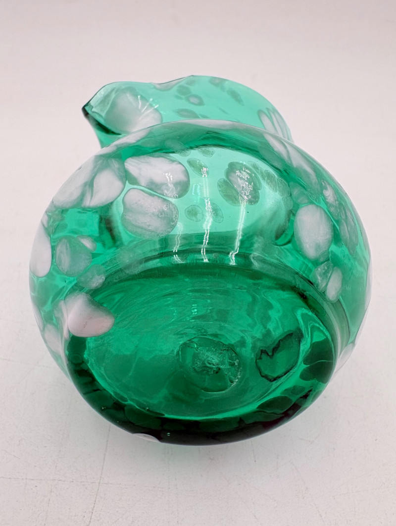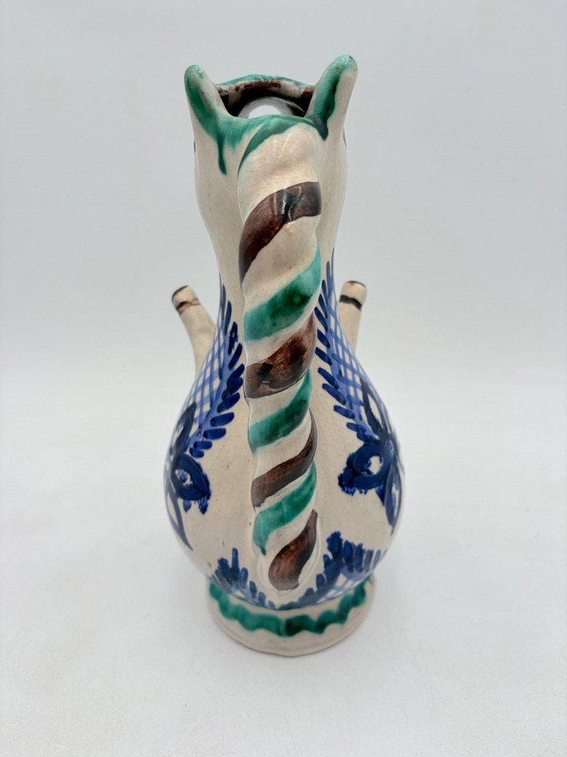 3 vintage pitchers of wildly differing styles, colors, and purposes! Vintage Greek horse-shaped earthenware jug from a workshop on Lesbos; probably from the village of Agiasos which is known for its traditional pottery in this style. Measures 11" H. Vintage Wade Heath Pottery of England deco-style pitcher with matte blue mottled glaze. (Flaxman Ware line) Measures 8" H. Handblown small glass creamer pitcher with white splatter design. Artist unknown. Measures 3" H.