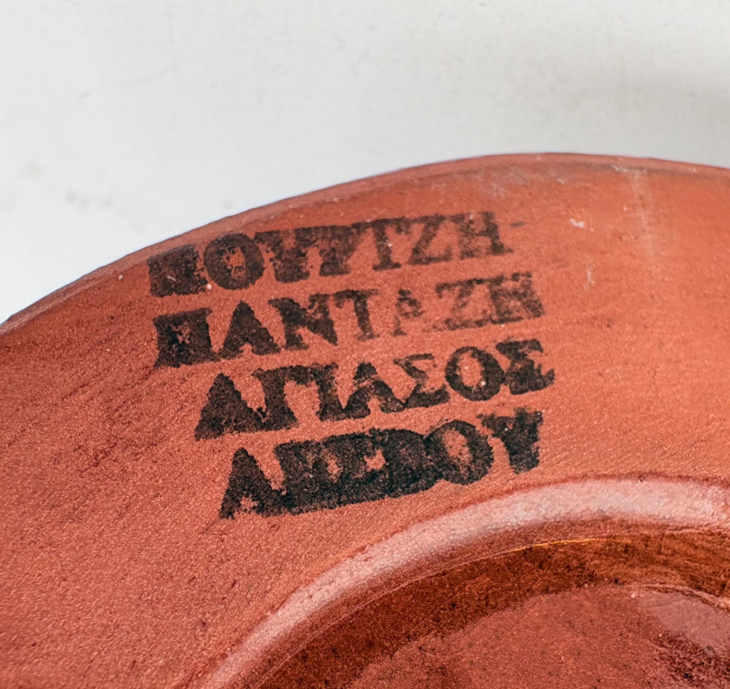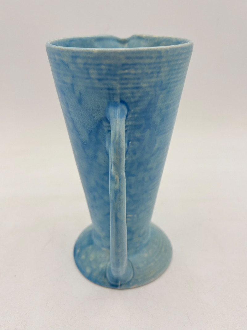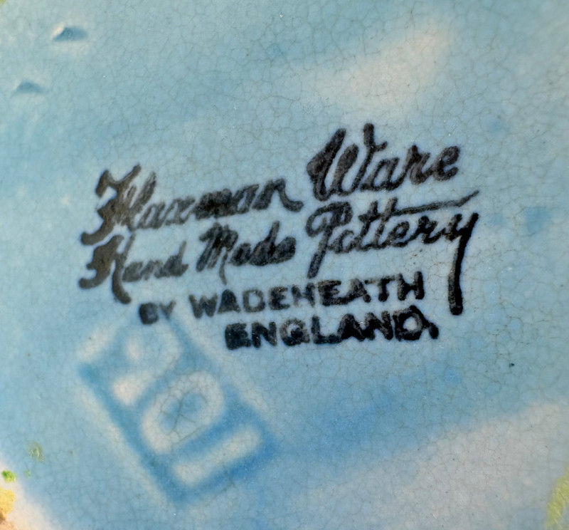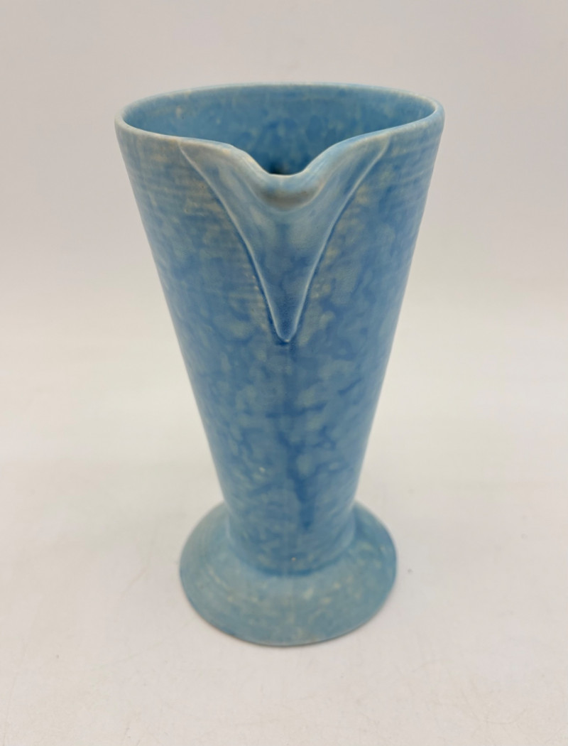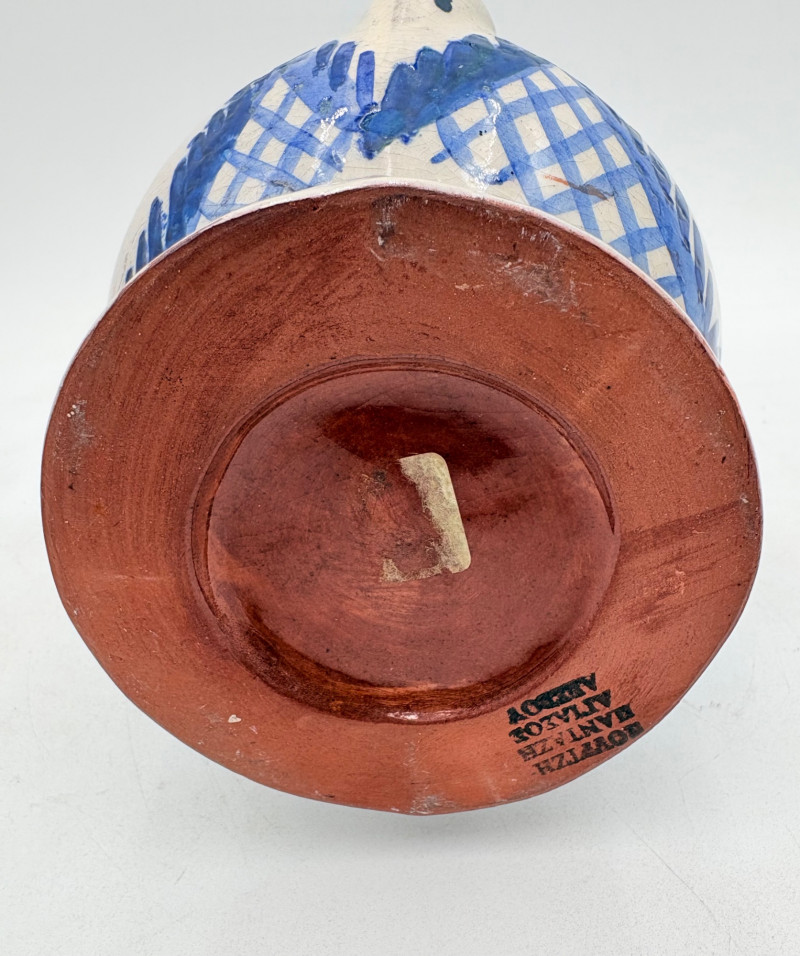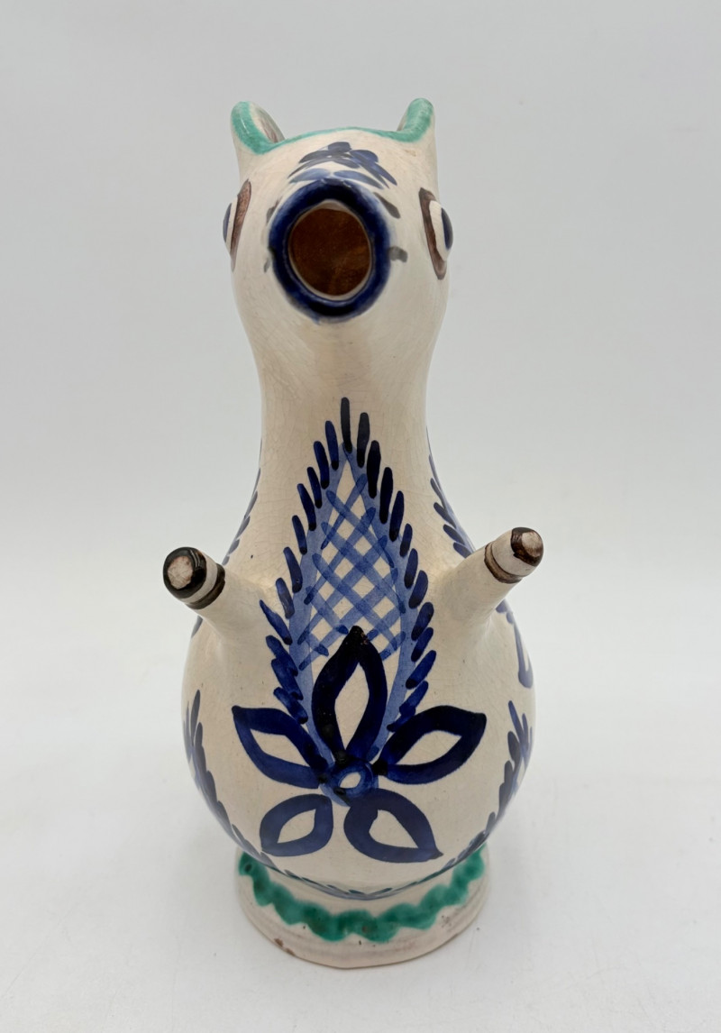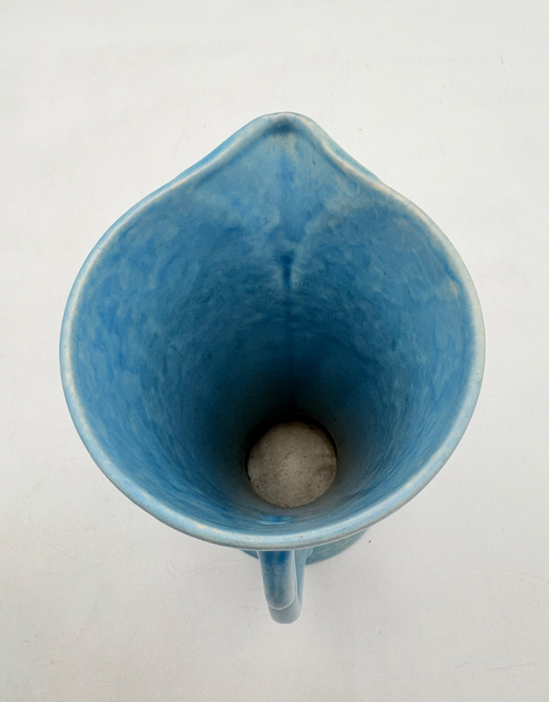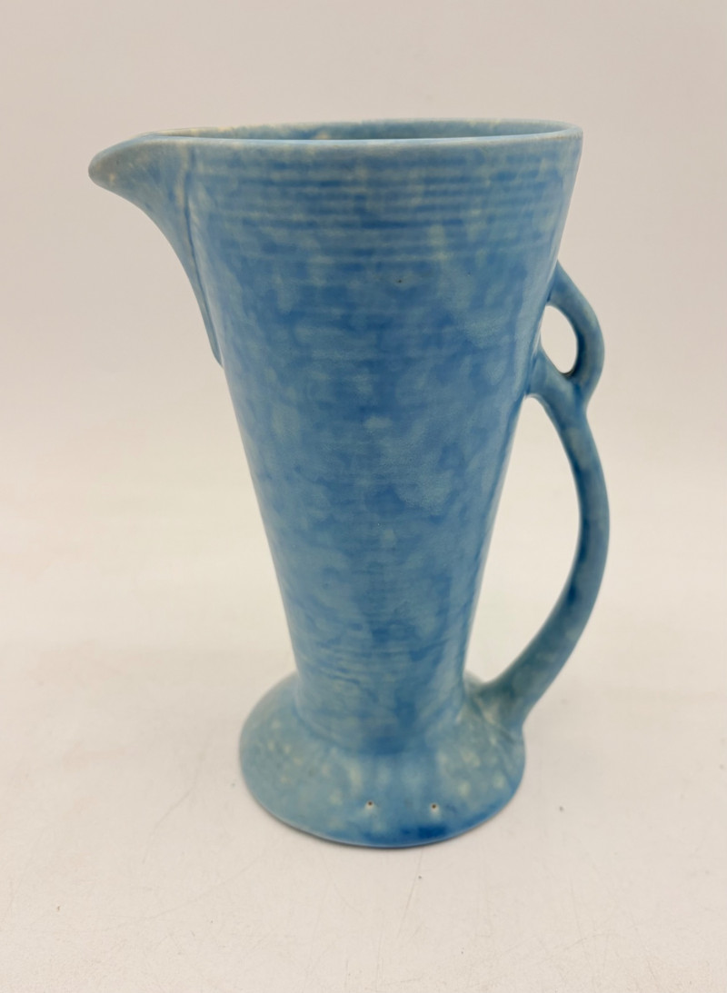 3 vintage pitchers of wildly differing styles, colors, and purposes! Vintage Greek horse-shaped earthenware jug from a workshop on Lesbos; probably from the village of Agiasos which is known for its traditional pottery in this style. Measures 11" H. Vintage Wade Heath Pottery of England deco-style pitcher with matte blue mottled glaze. (Flaxman Ware line) Measures 8" H. Handblown small glass creamer pitcher with white splatter design. Artist unknown. Measures 3" H.