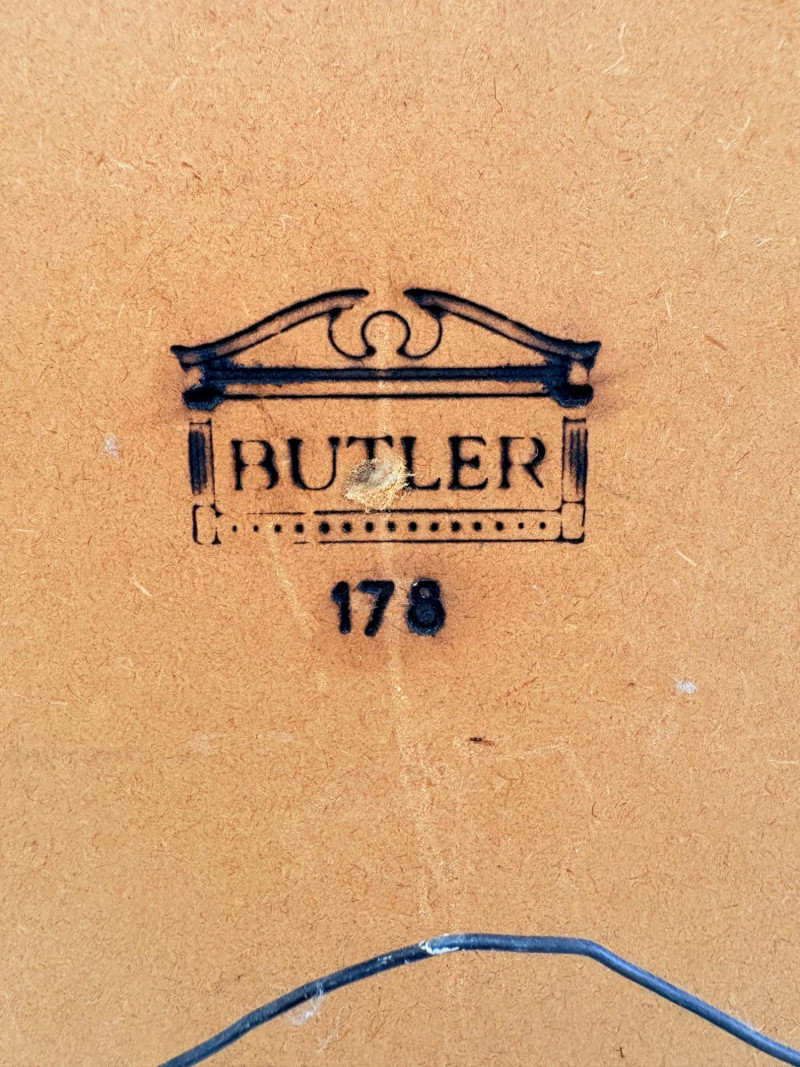 Vintage heavy-weight mirror from Butler. This puppy is stout! Curved top profile and less curved bottom profile with thick wooden frame. Narrow band of gold around a nicely shaped frame profile. Heavy-duty mounting with wire. In excellent shape for its age with only slight surface wear in one spot - see last photo. Measures 46" H x 16.25" W x 1.5" D. Note that color is washed out in some photos - closer darker tone photos.