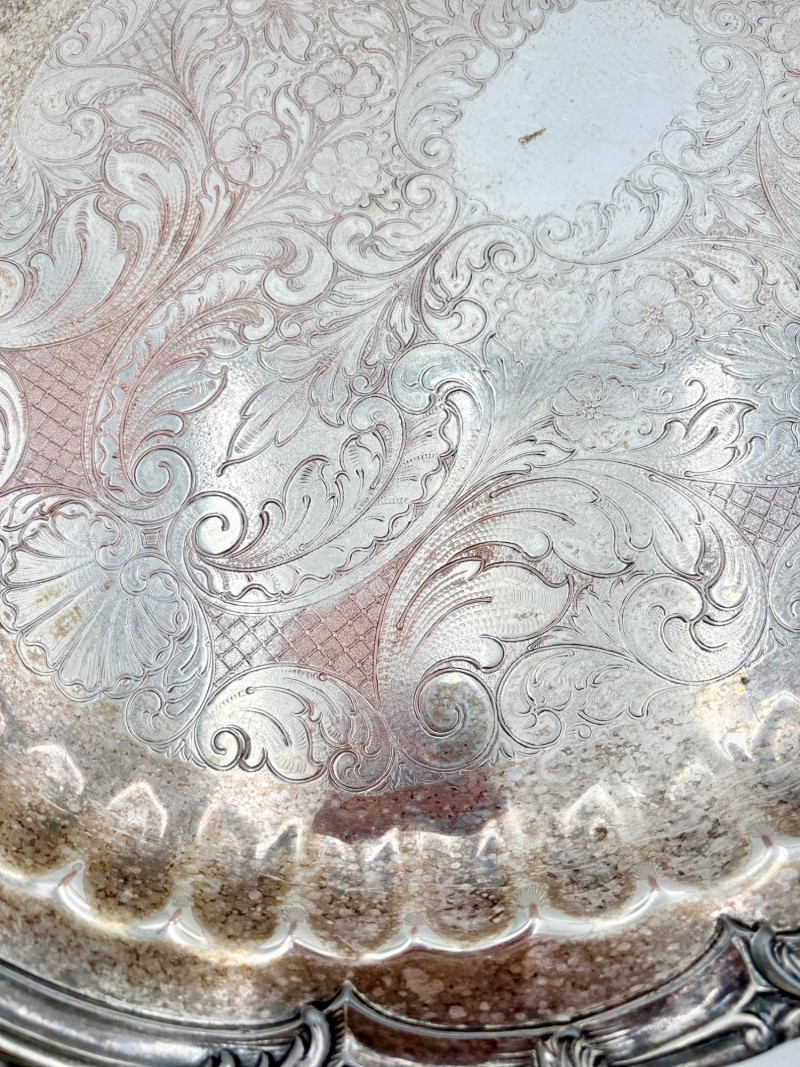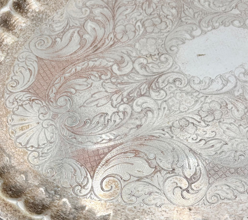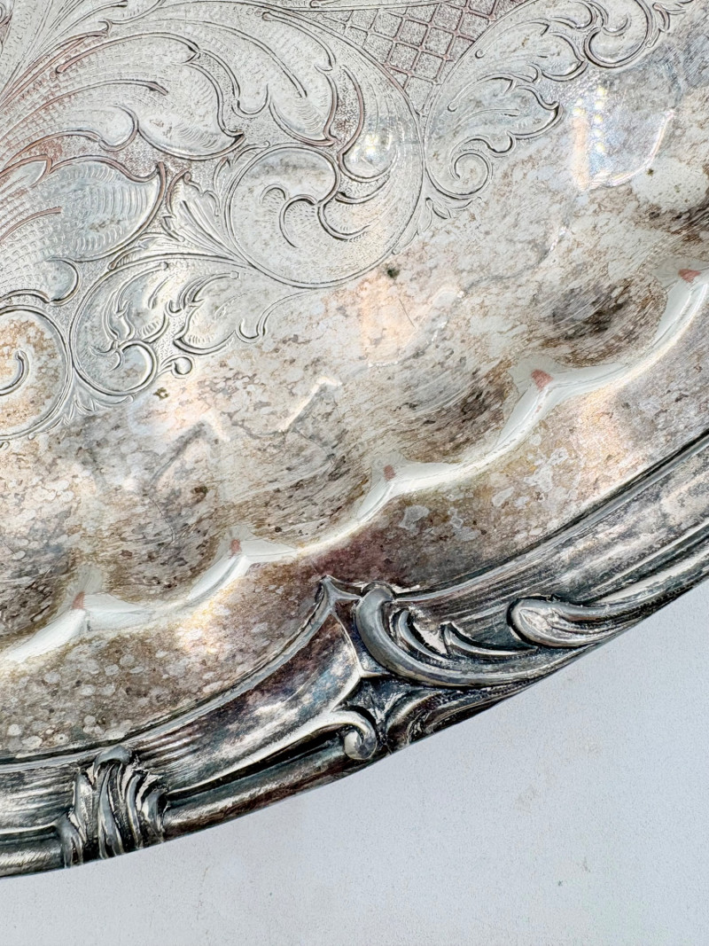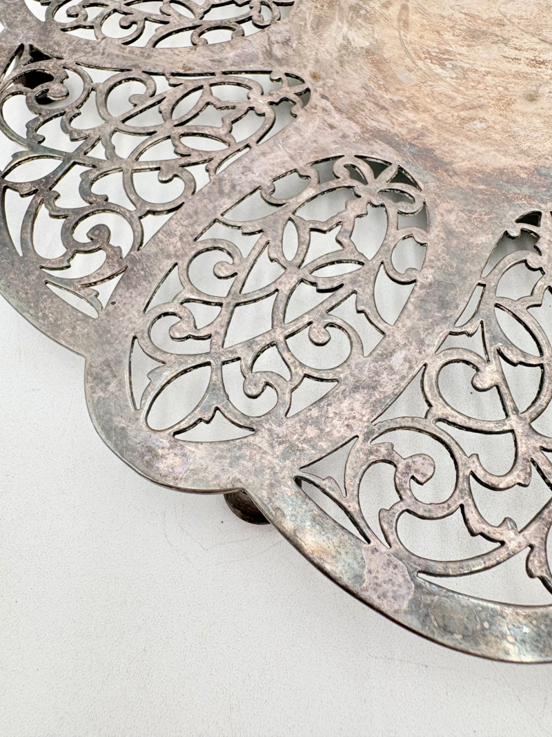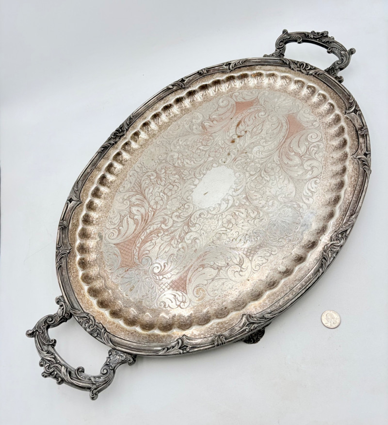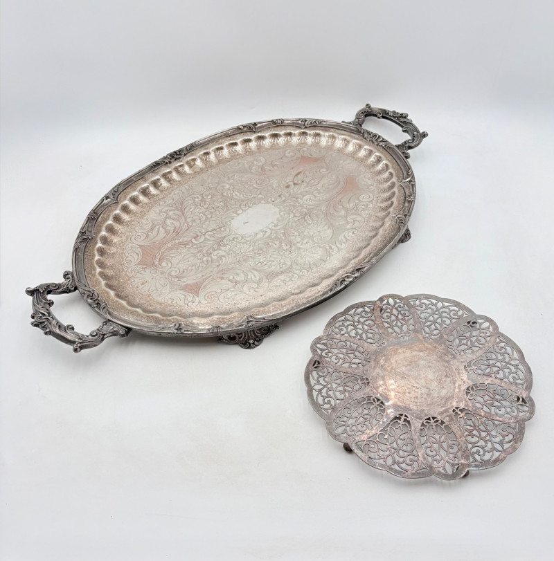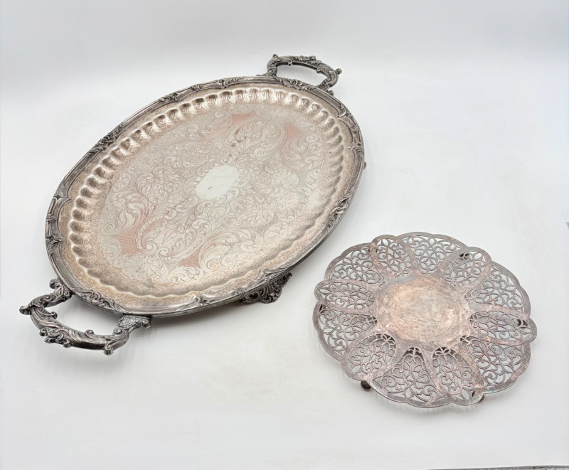 Two great serving pieces that could use a little TLC, but have a lot of character as is! Very large platter has incising and elaborate feet/handles. Silverplate over copper (it's quite heavy). Measures 1.5" H x 28" L x 17" W. Silverplate footed pierced plate from International Silver has ornate cut-outs and measures .5" H x 10.5" diameter.