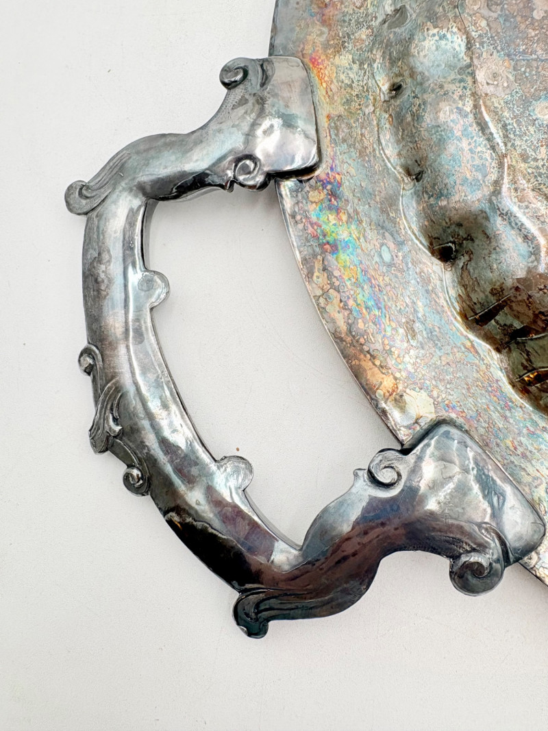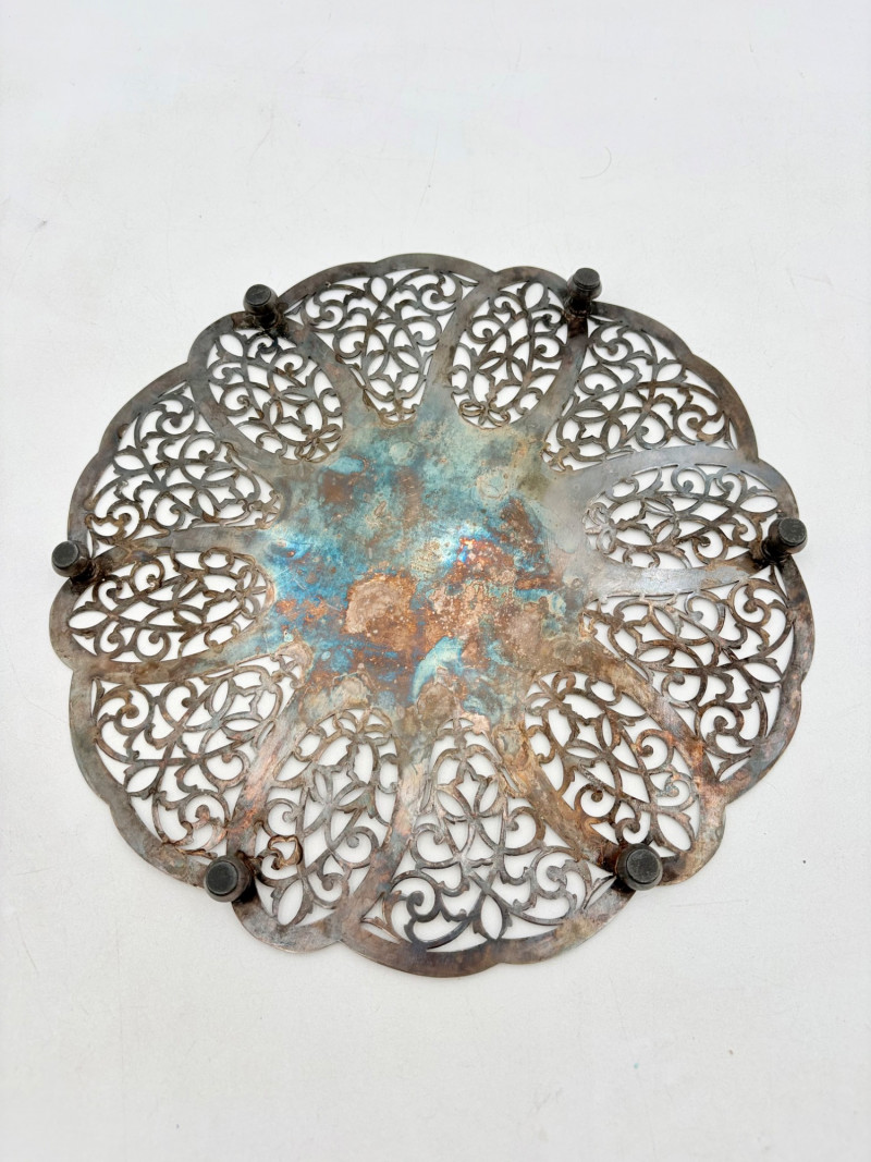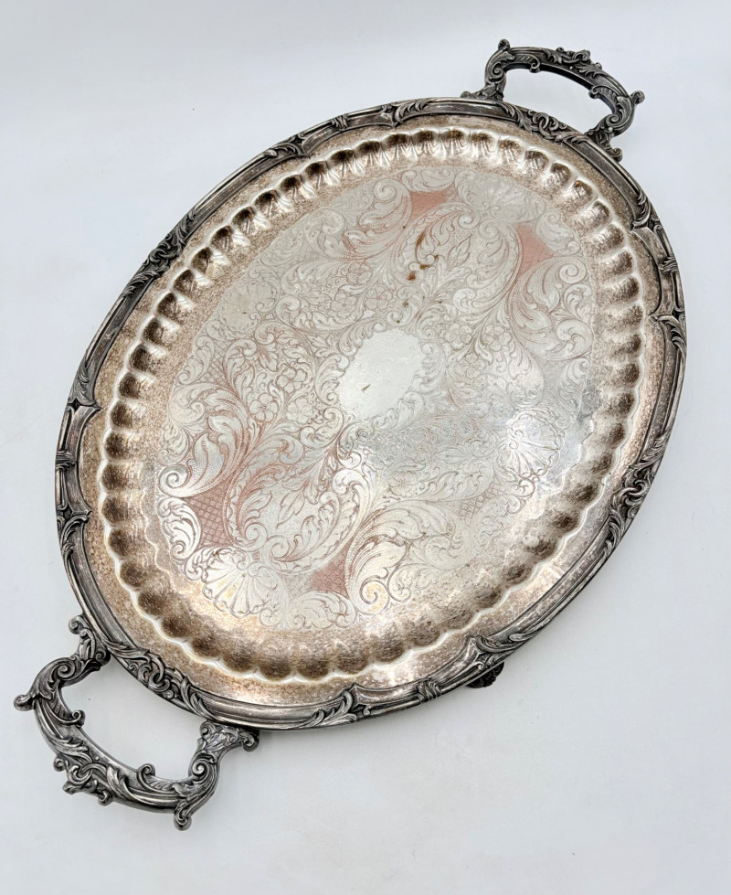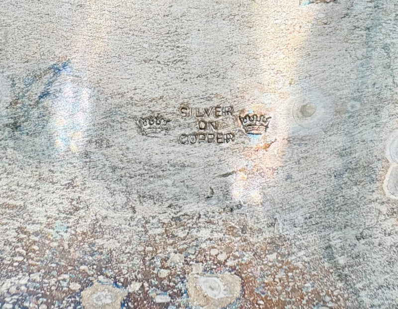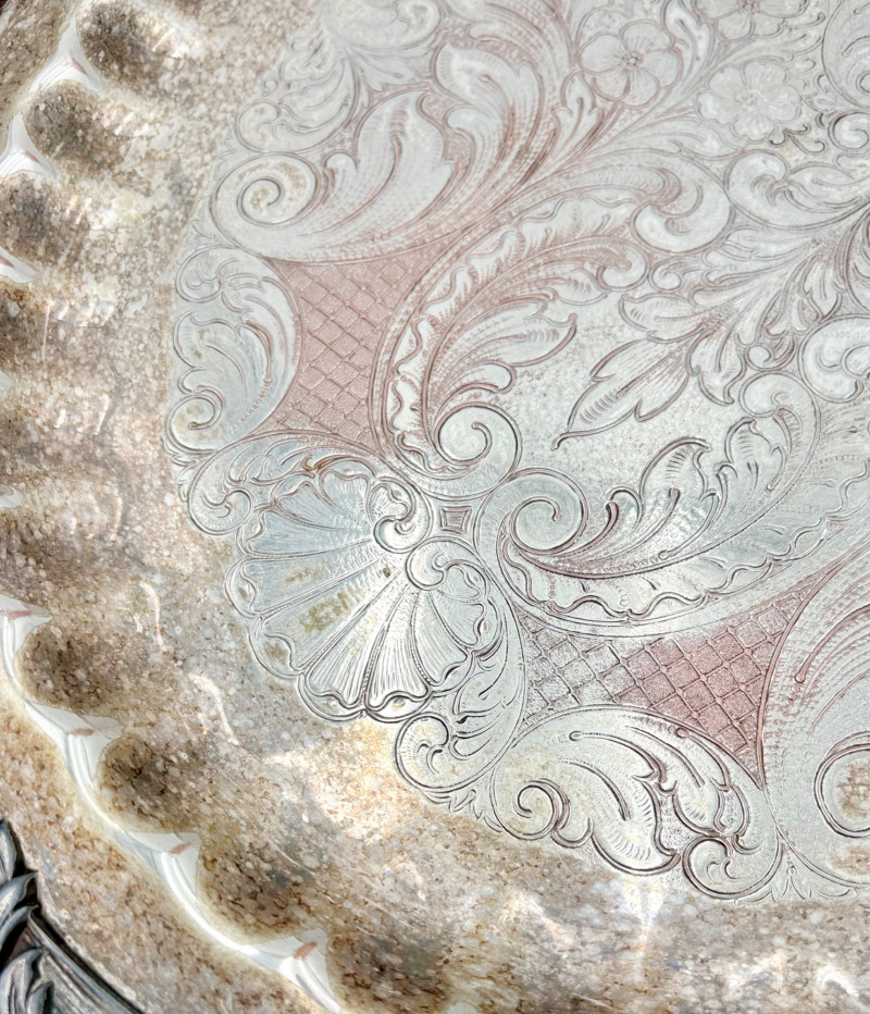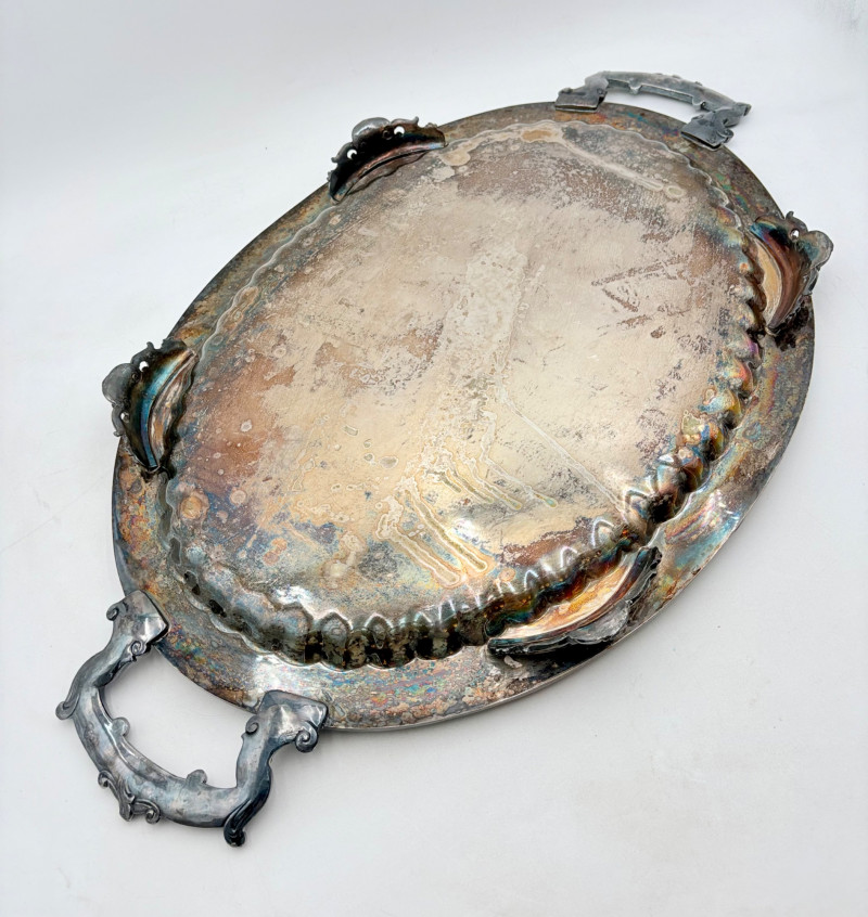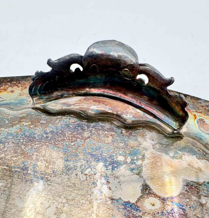 Two great serving pieces that could use a little TLC, but have a lot of character as is! Very large platter has incising and elaborate feet/handles. Silverplate over copper (it's quite heavy). Measures 1.5" H x 28" L x 17" W. Silverplate footed pierced plate from International Silver has ornate cut-outs and measures .5" H x 10.5" diameter.