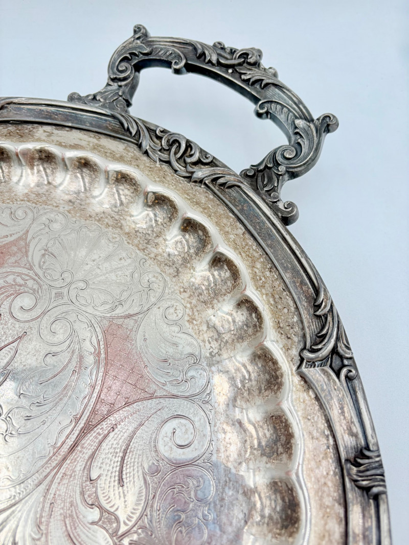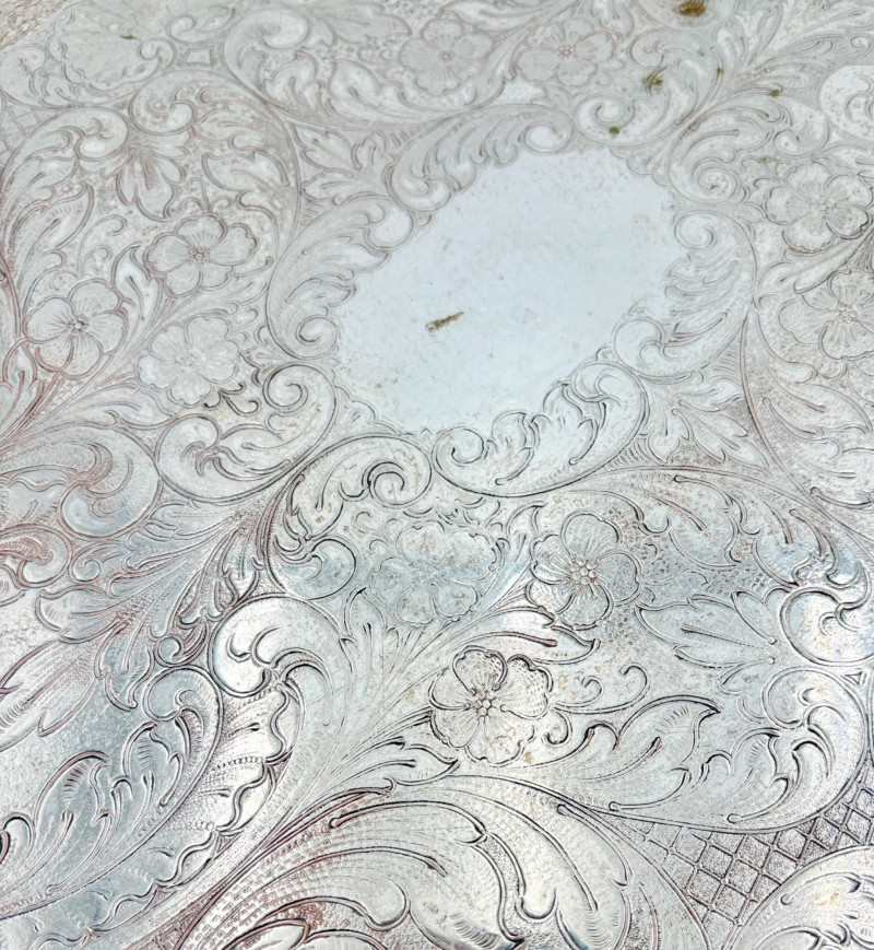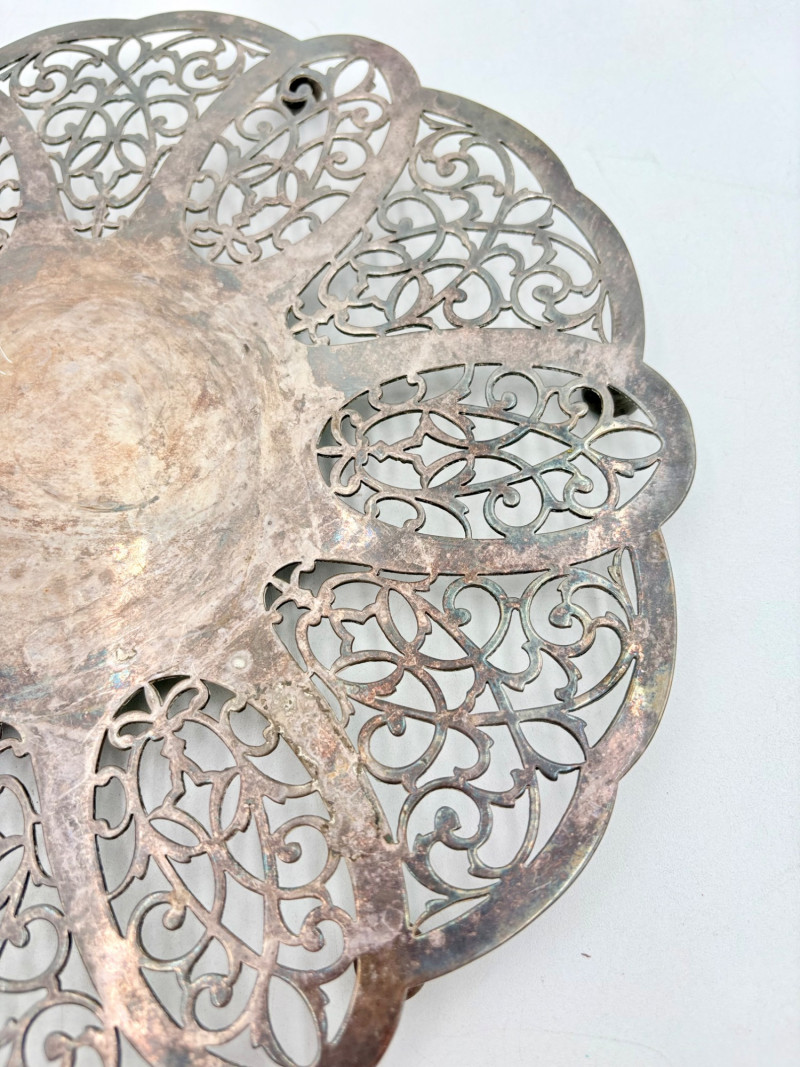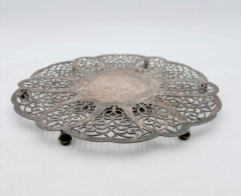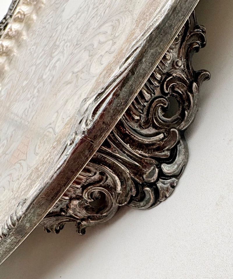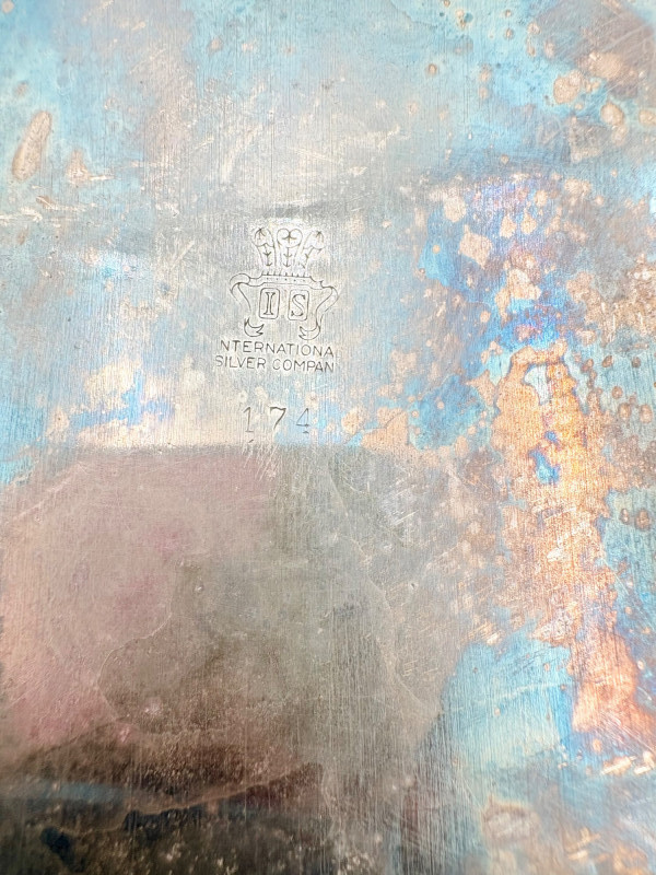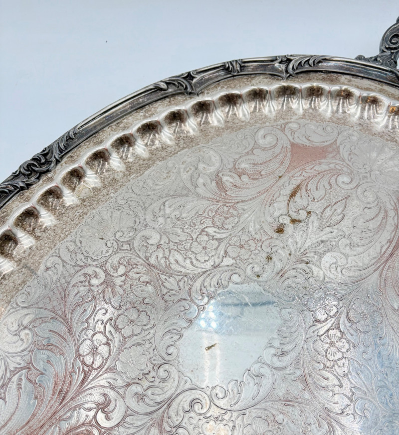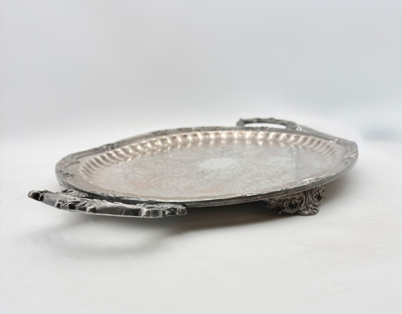 Two great serving pieces that could use a little TLC, but have a lot of character as is! Very large platter has incising and elaborate feet/handles. Silverplate over copper (it's quite heavy). Measures 1.5" H x 28" L x 17" W. Silverplate footed pierced plate from International Silver has ornate cut-outs and measures .5" H x 10.5" diameter.