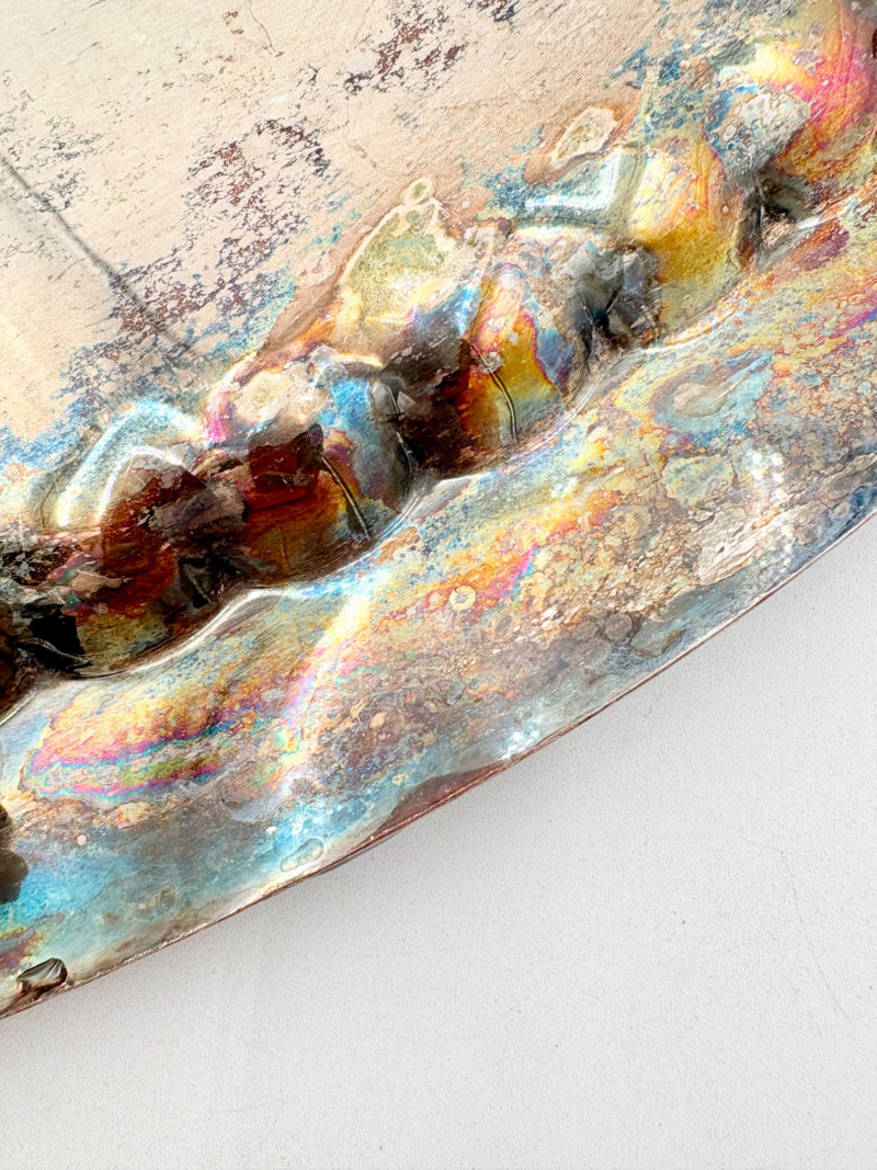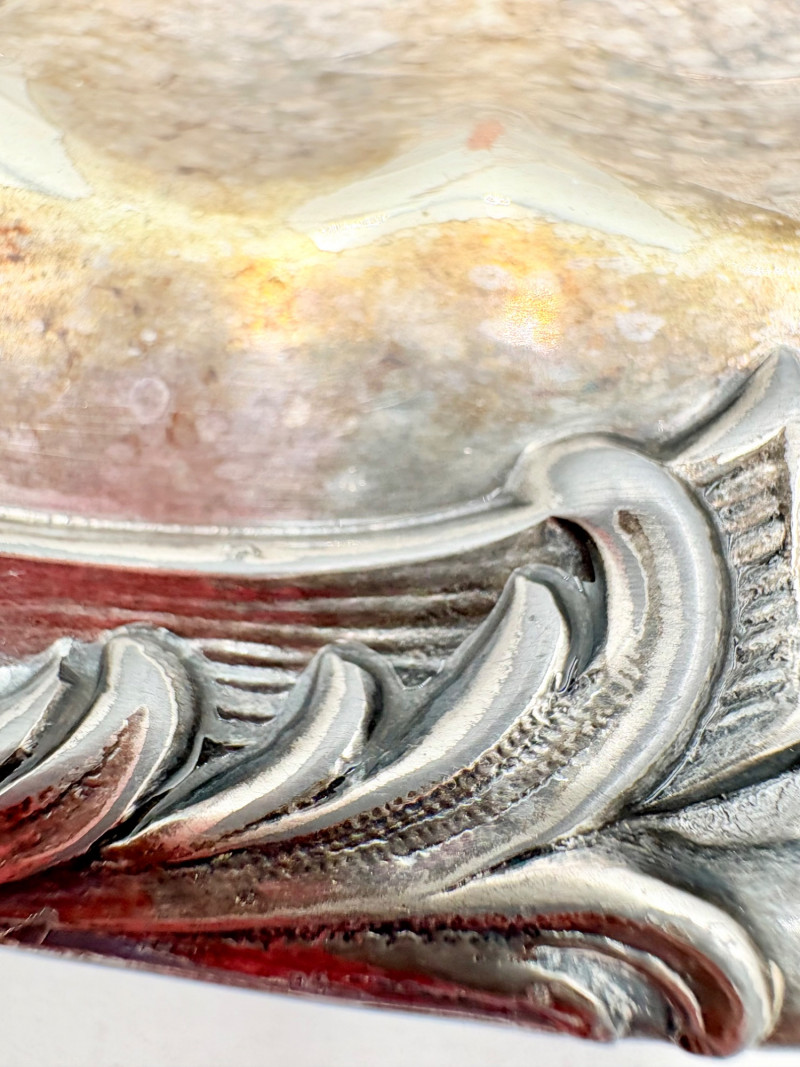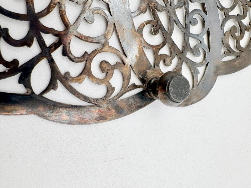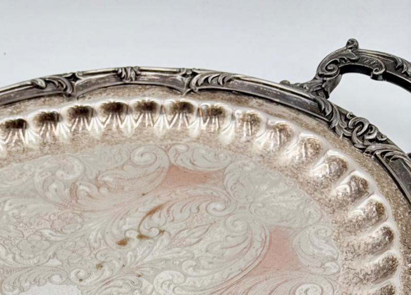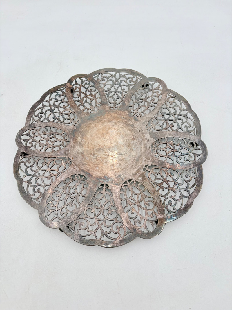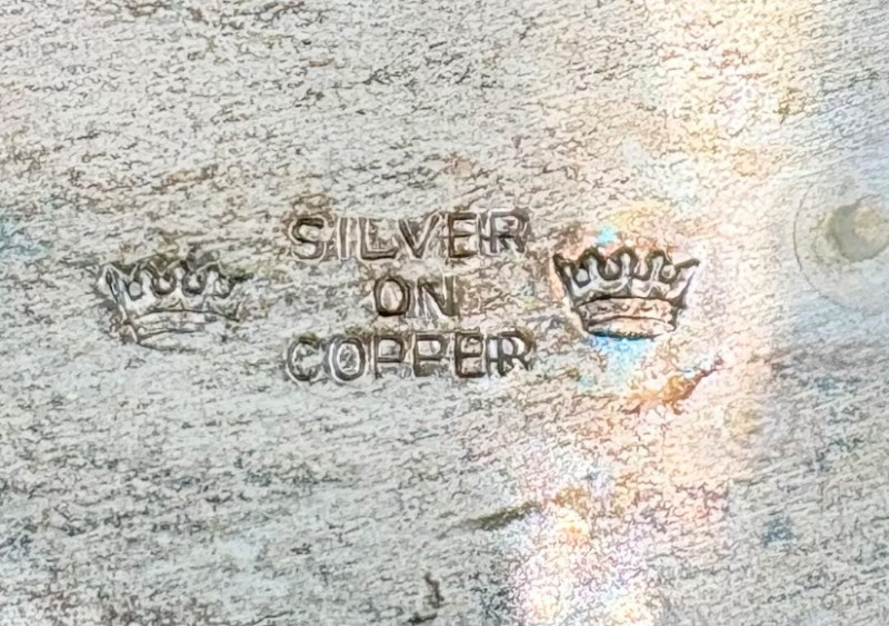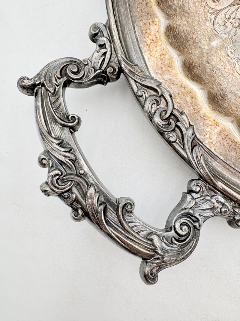 Two great serving pieces that could use a little TLC, but have a lot of character as is! Very large platter has incising and elaborate feet/handles. Silverplate over copper (it's quite heavy). Measures 1.5" H x 28" L x 17" W. Silverplate footed pierced plate from International Silver has ornate cut-outs and measures .5" H x 10.5" diameter.