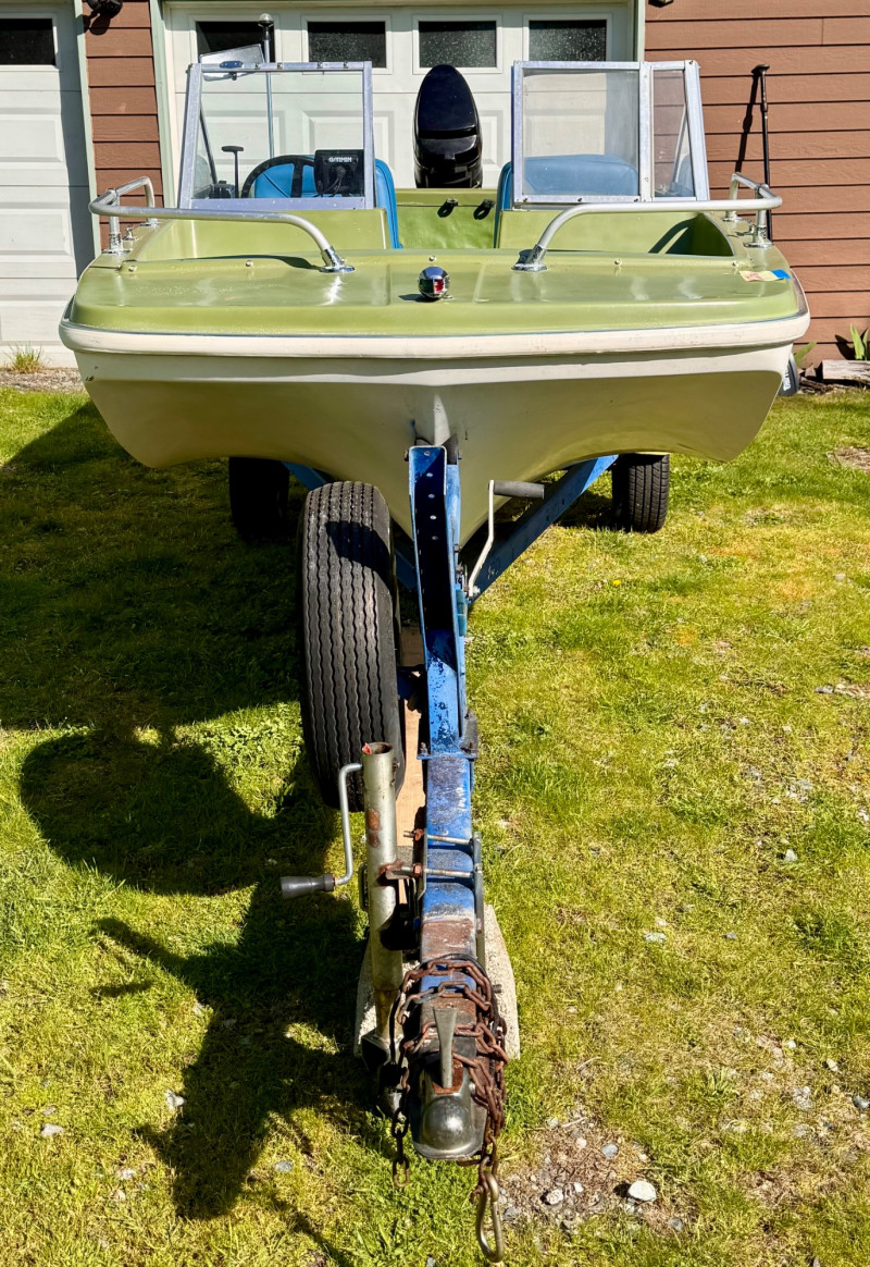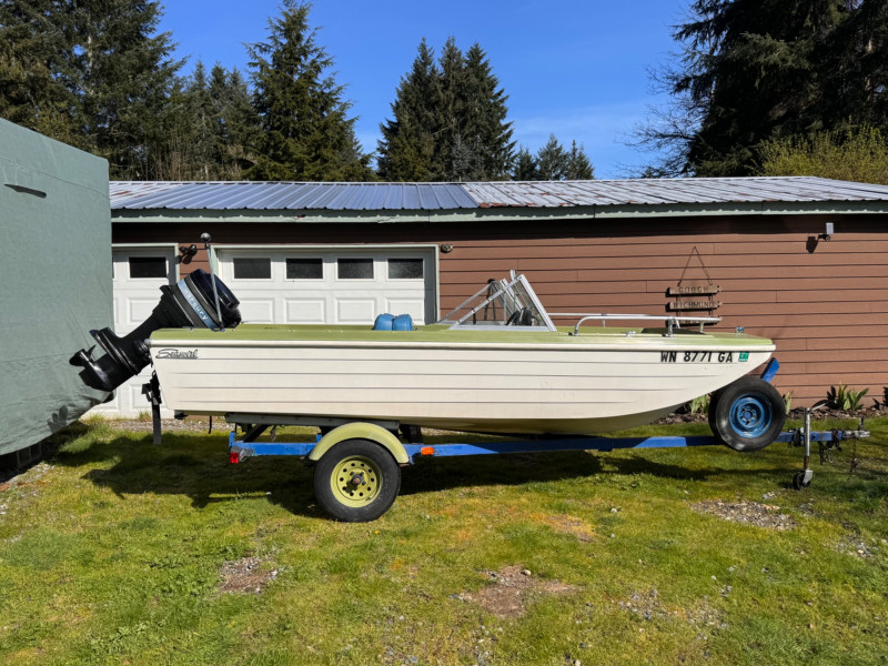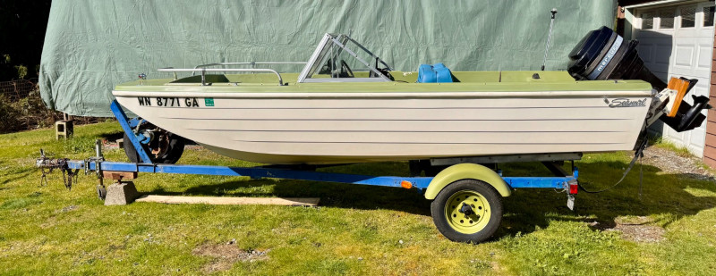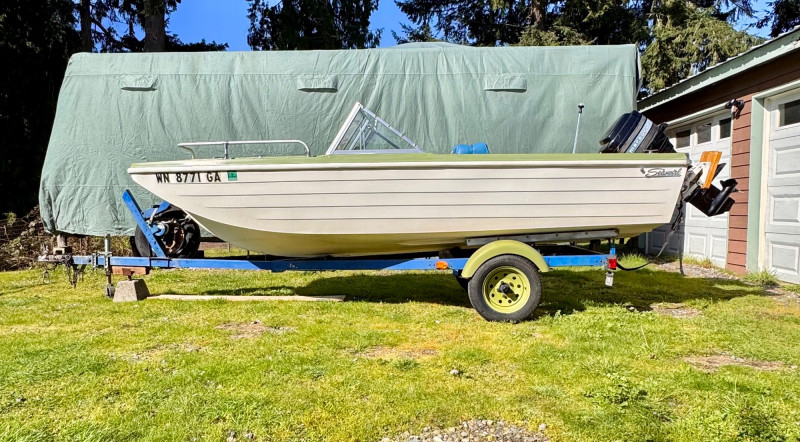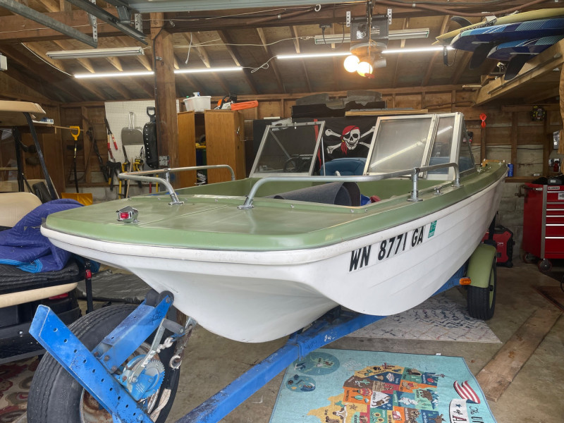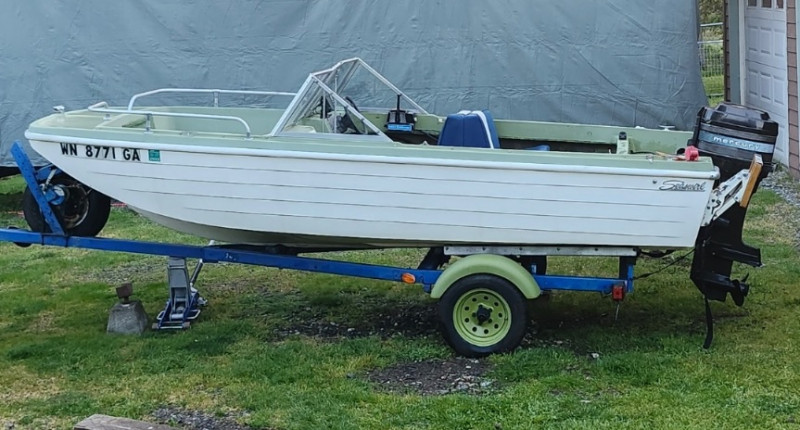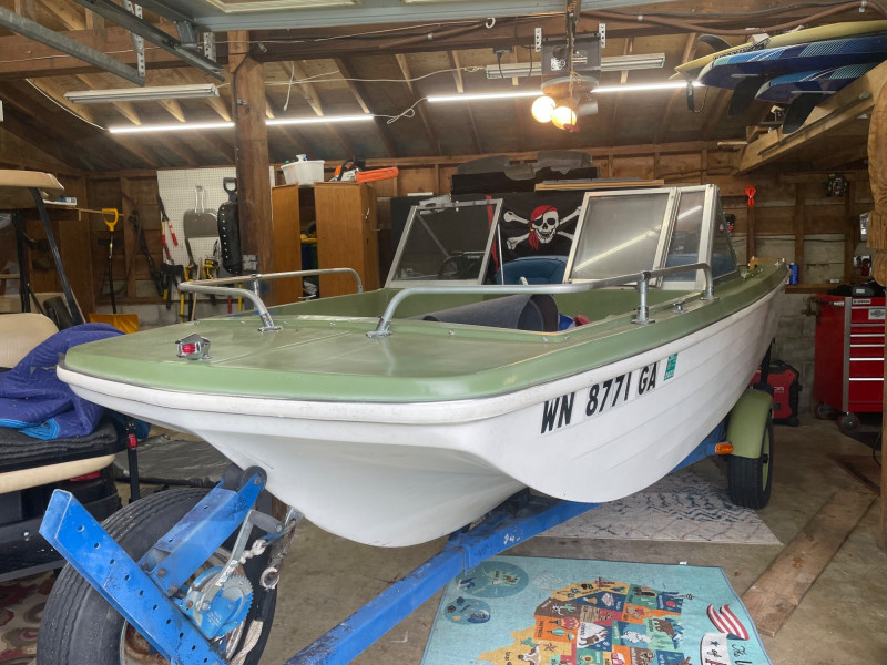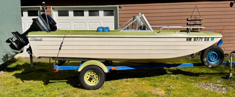 Boat: Trailer: Blue frame with green wheels, set up for immediate towing 1971 BRC Seawhirl Cascade 14' fiberglass boat, sold with a State of Washington title, paired with a 1961 EZLD trailer, also titled. This classic runabout features a Mercury outboard gas motor and the clean, lightweight hull design Seawhirl was known for. The package includes a generous assortment of boating and crabbing accessories: four new adult life vests, one child vest, seat cushion floats, two brand‑new crab pots with floats, beach towels, blanket, first aid kit, flashlight, flag, and a fitted boat cover. A ready‑to‑go recreational setup for lake or Puget Sound use. Paddles not included. 1971 BRC Seawhirl Cascade Fiberglass Boat with State of Washington Title Manufacturer By - WASHINGTON HOMEMADE BOATS 14' with Outboard Gas Motor 1961 EZLD Boat Trailer with State of Washington Title May need an Impeller.1971 BRC Seawhirl “Cascade” Fiberglass Boat + 1961 EZLD Trailer + Accessories