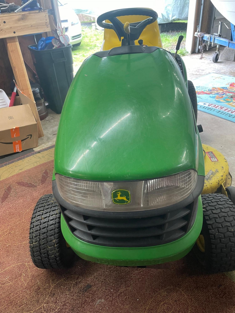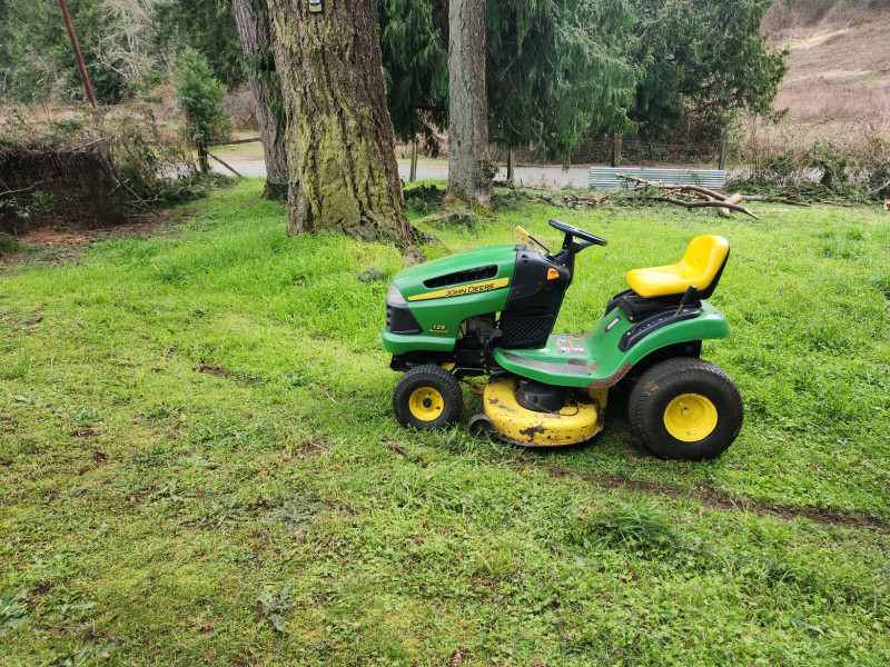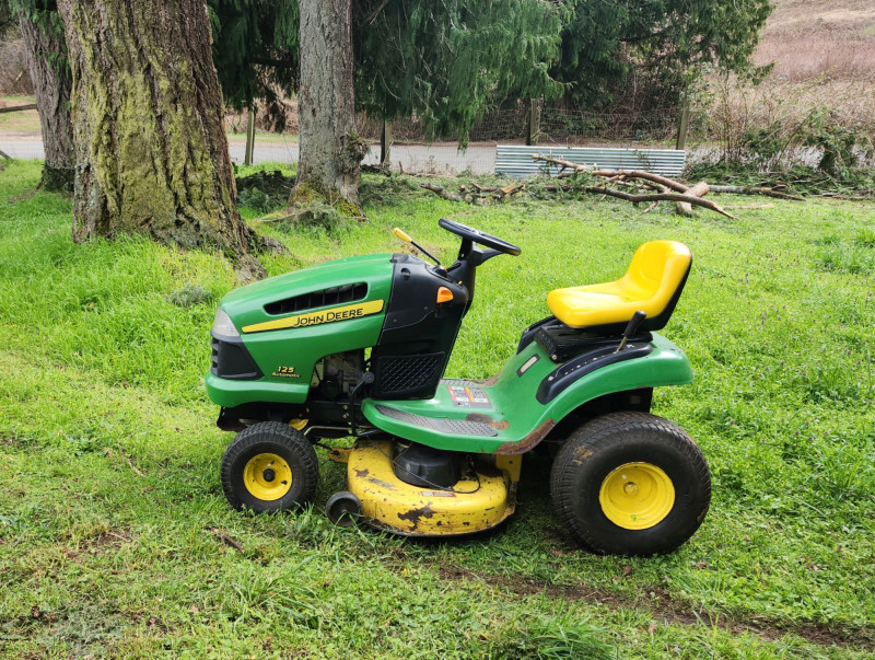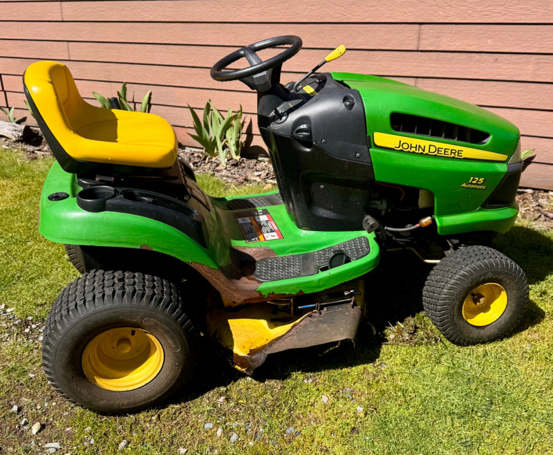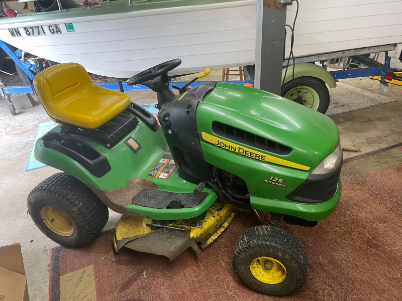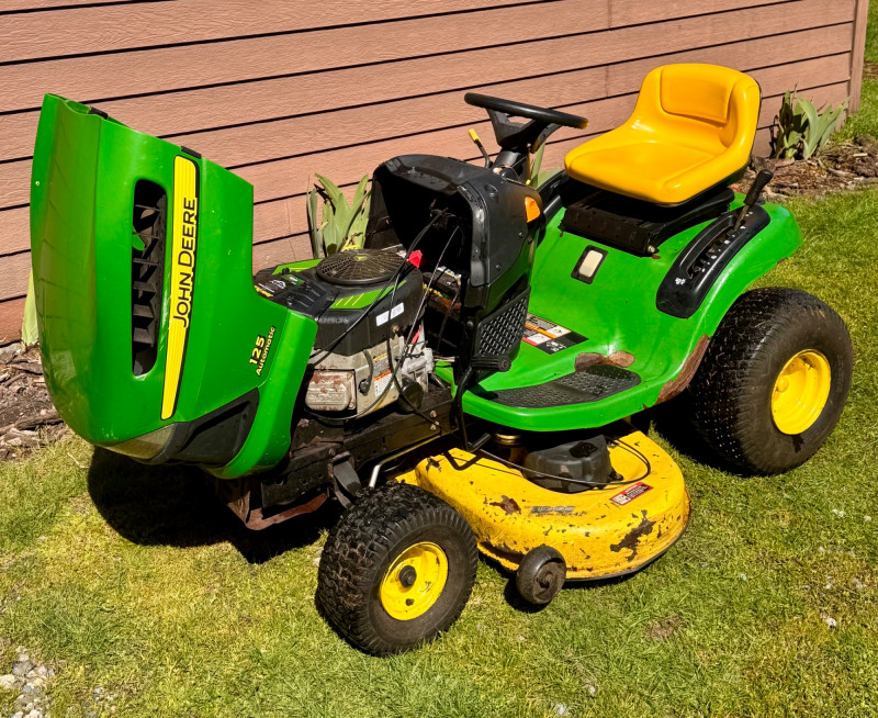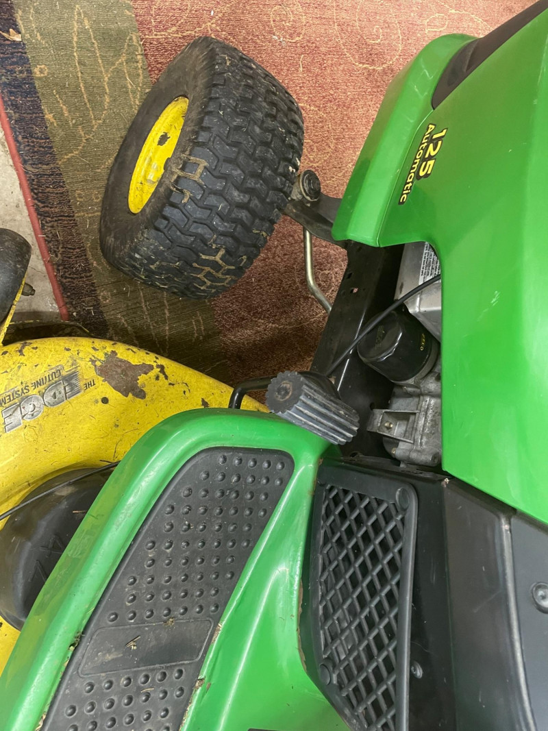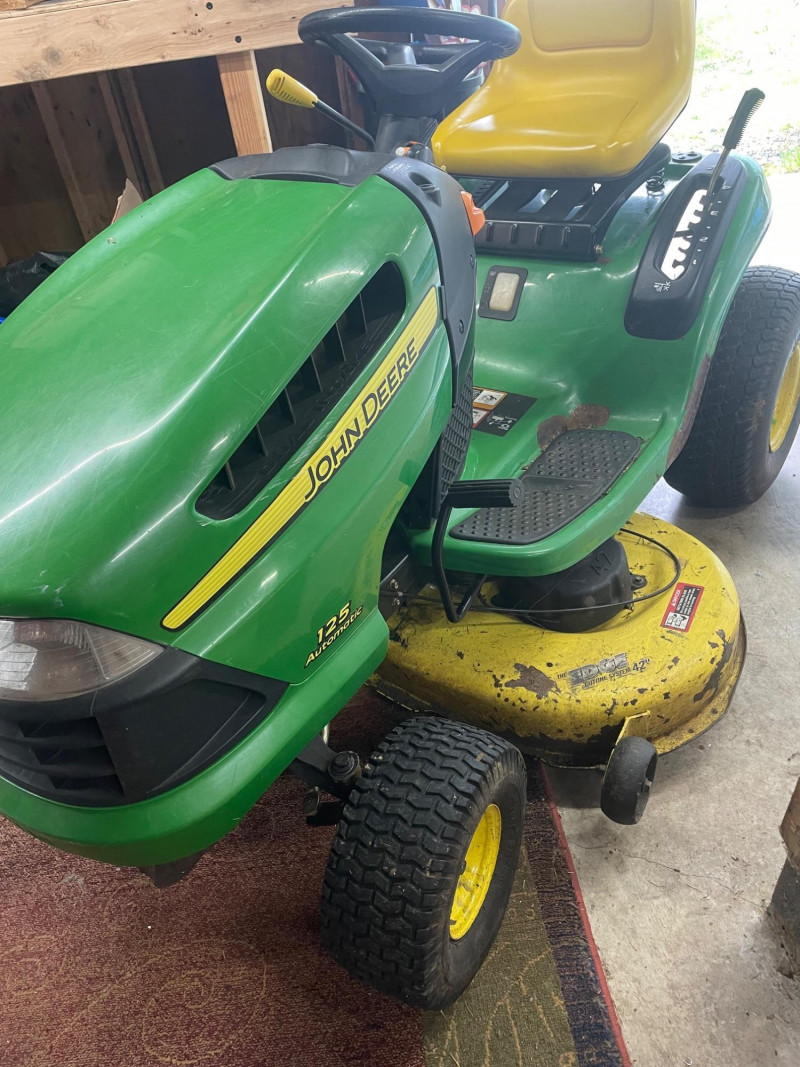 A dependable John Deere 125 Automatic riding mower, known for its durability, ease of use, and classic green‑and‑yellow styling. This model features an automatic transmission for smooth operation and a wide mower deck suitable for residential lawn care. Features: Operational at time of listing. Pre‑owned with typical wear from use.John Deere 125 Automatic Mower – Operational