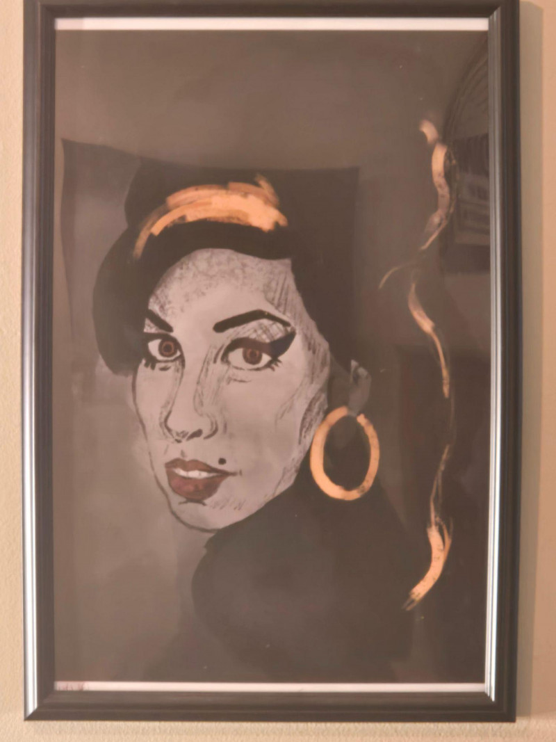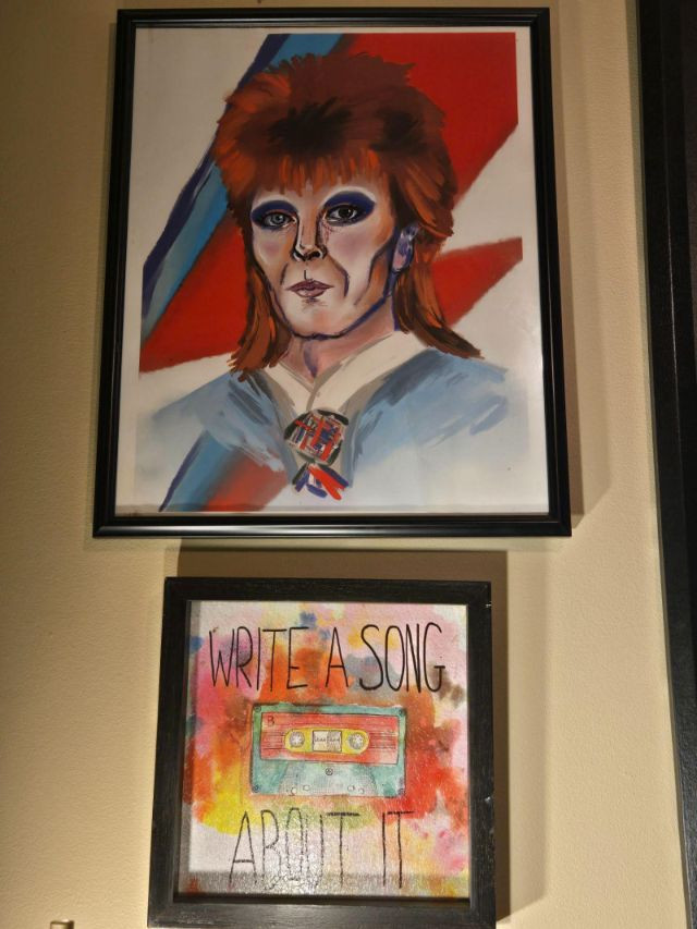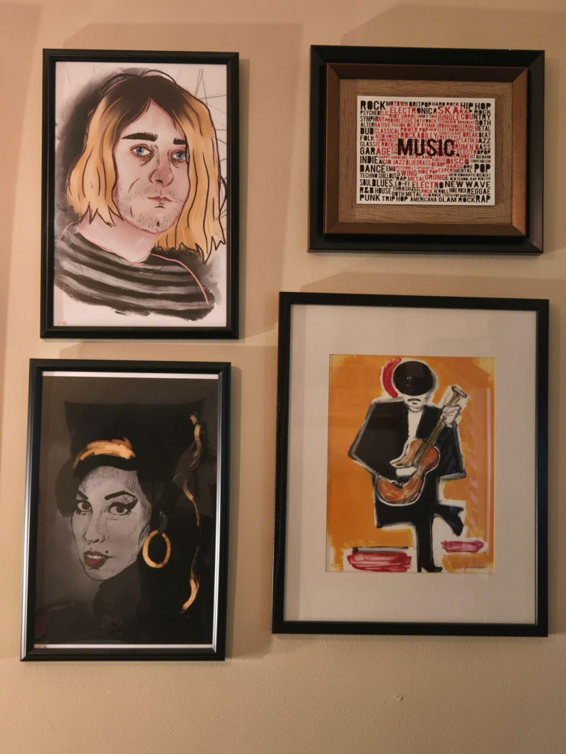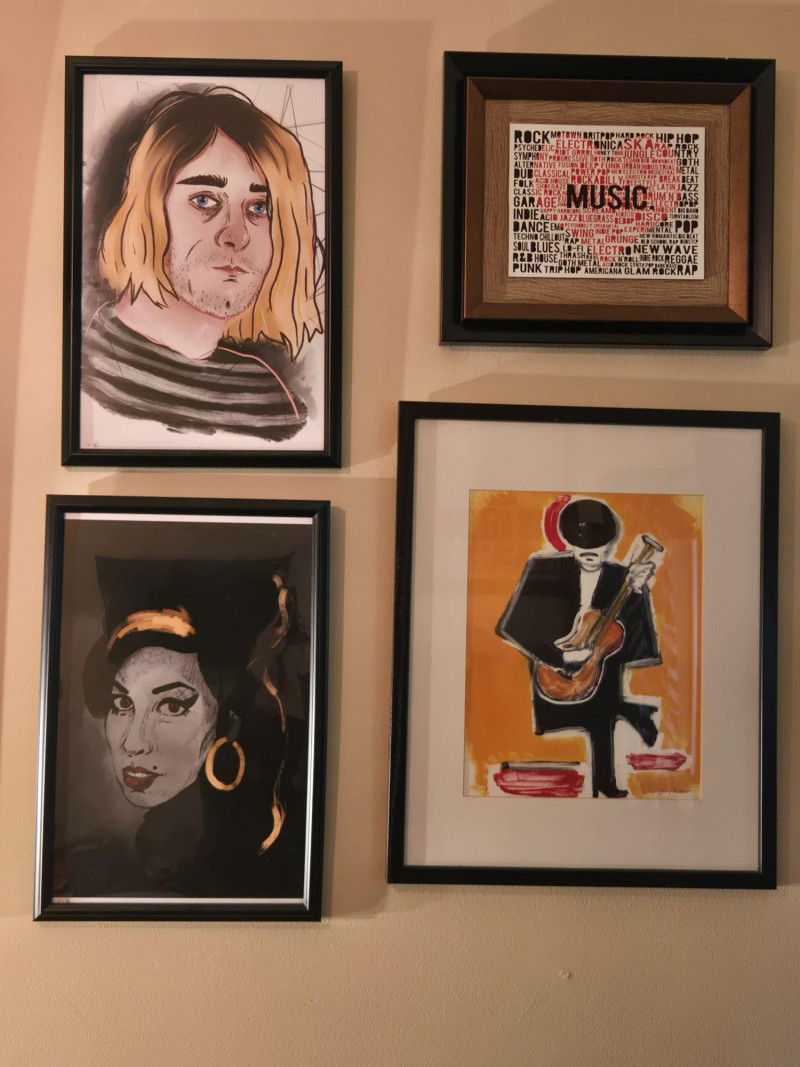 “WRITE A SONG ABOUT IT” print with retro cassette graphic Kurt Cobain portrait — expressive sketch‑style rendering Amy Winehouse portrait — dark background with gold accents David Bowie portrait — bold red hair and lightning‑bolt motif Rod Stewart‑style guitarist painting — abstract, high‑energy composition Typography “MUSIC” print featuring genre names like rock, jazz, hip hop, blues, funk, and moreMusic, Kurt Cobain, Amy Winehouse, David Bowie Prints