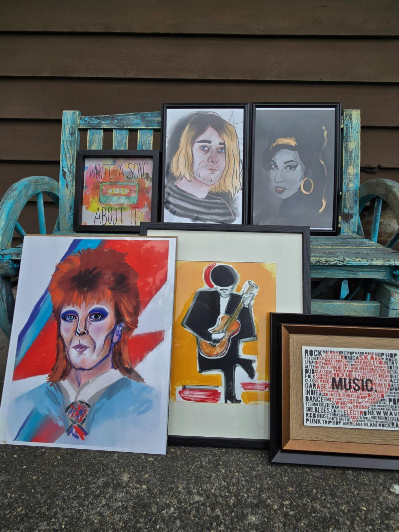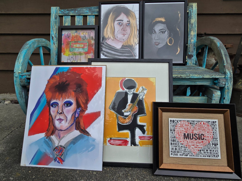 A vibrant, mixed collection of music‑themed art prints and portraits, celebrating iconic performers across rock, soul, and pop. This visually dynamic lot includes:
