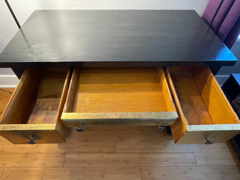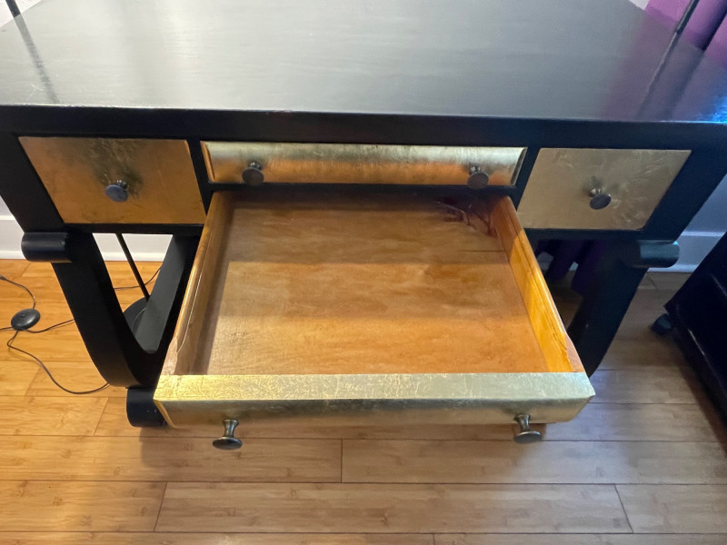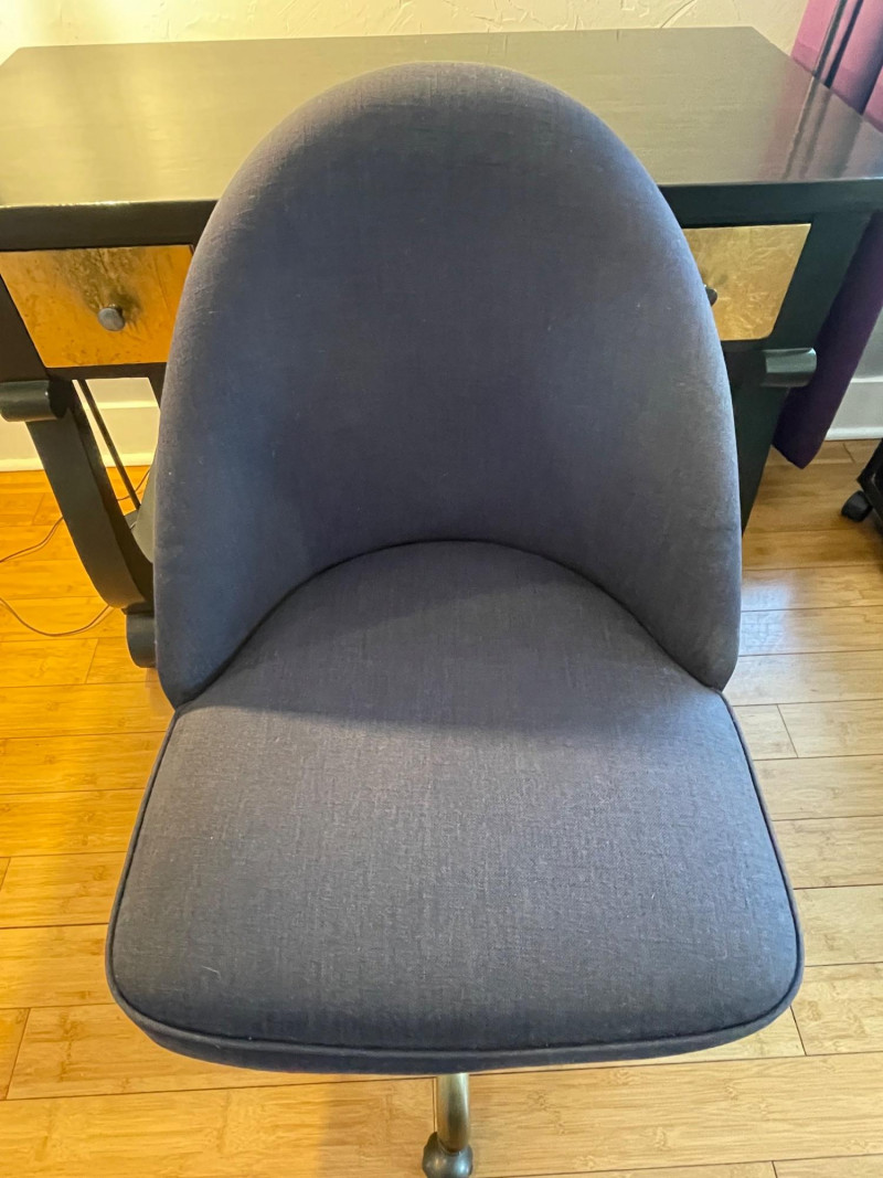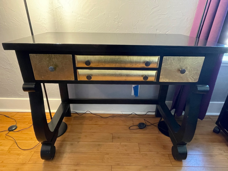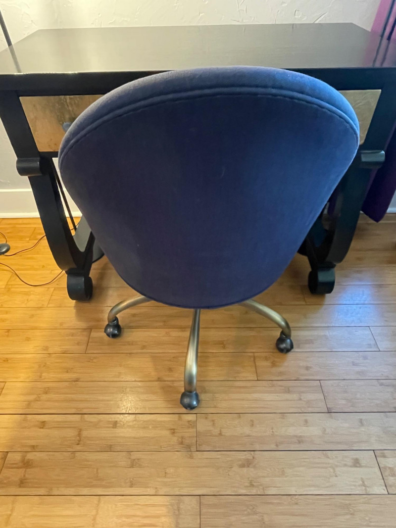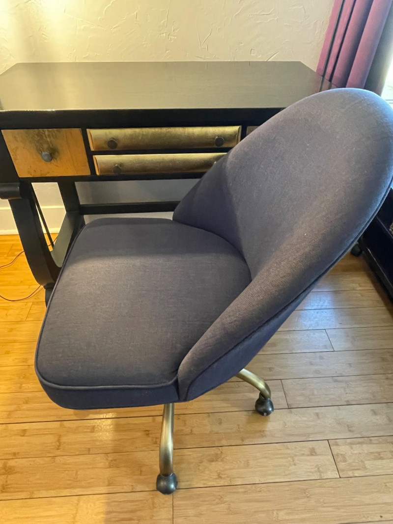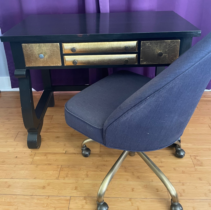 Desk painted black with gold drawers, chair is blue fabric. Desk 40” x 20” x 30”H Chair 34” H x Seat 18” x 22”A sturdy, neutral desk paired with a rolling, swiveling chair, featuring a smooth work surface, clean lines, and a supportive backrest.