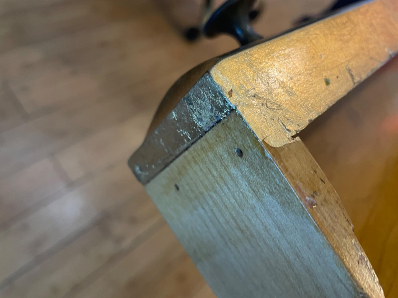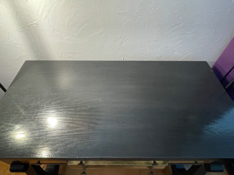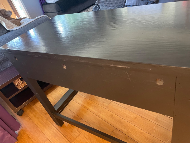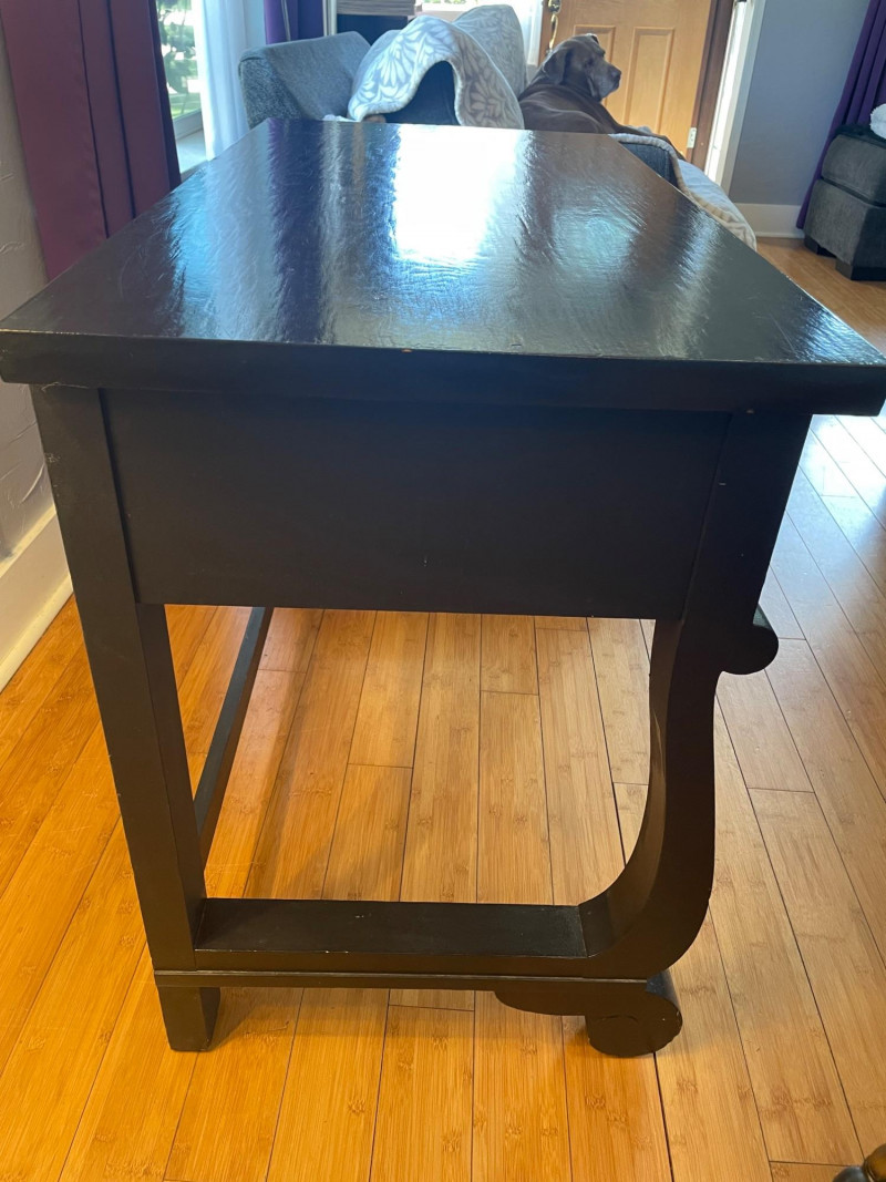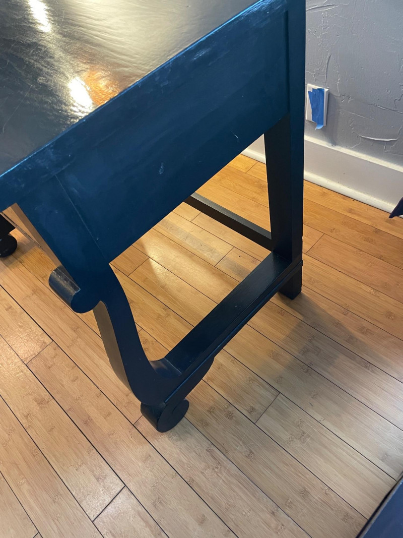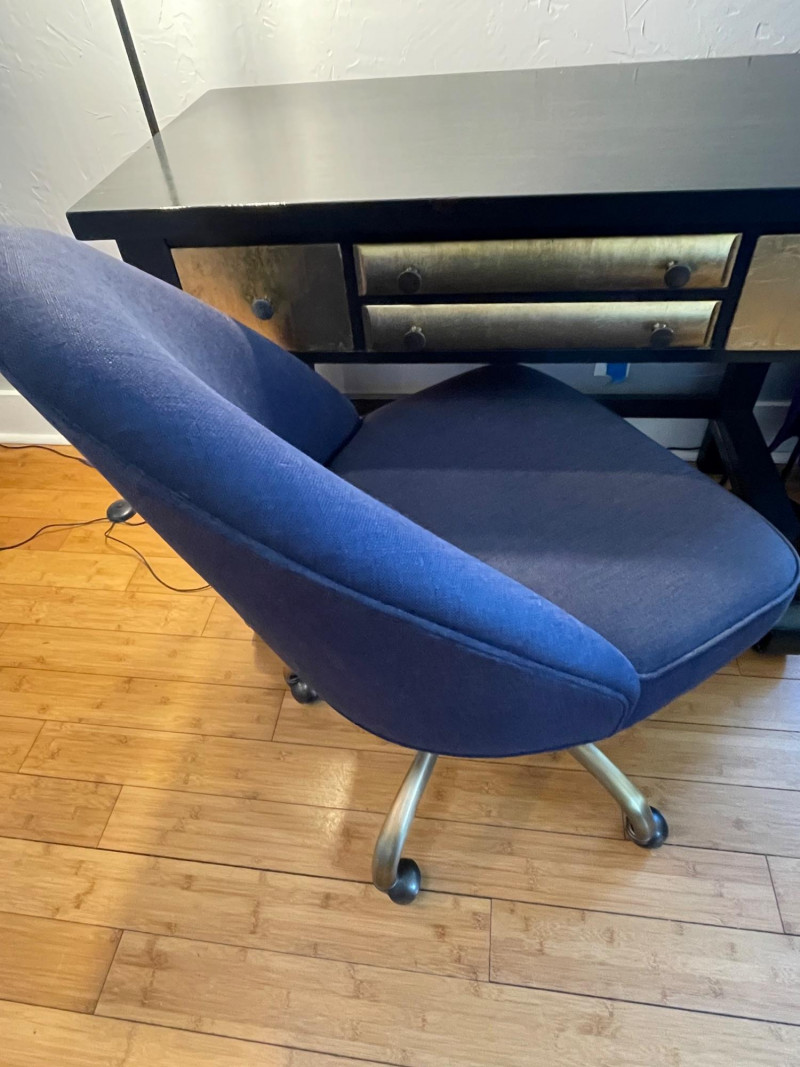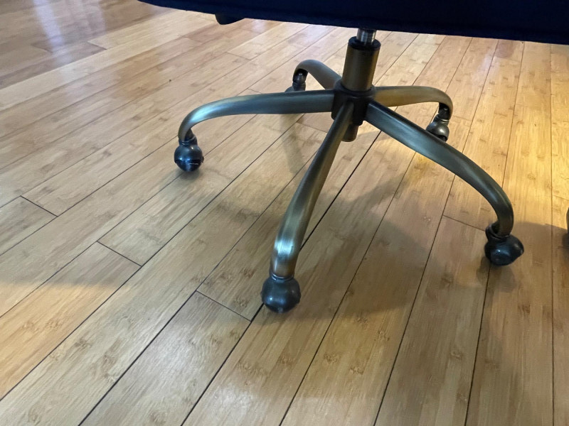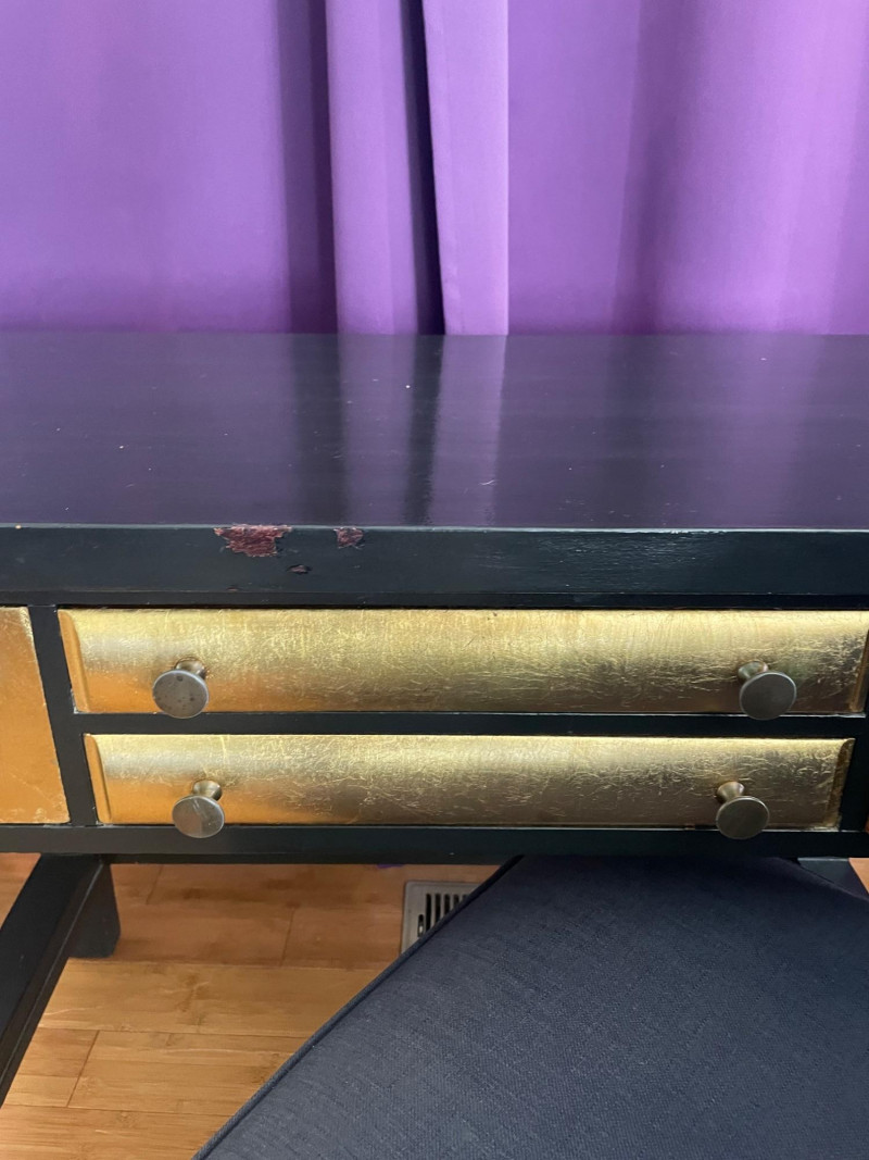 Desk painted black with gold drawers, chair is blue fabric. Desk 40” x 20” x 30”H Chair 34” H x Seat 18” x 22”A sturdy, neutral desk paired with a rolling, swiveling chair, featuring a smooth work surface, clean lines, and a supportive backrest.