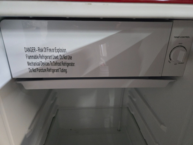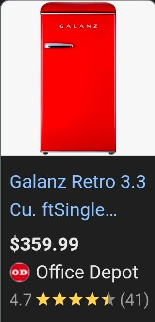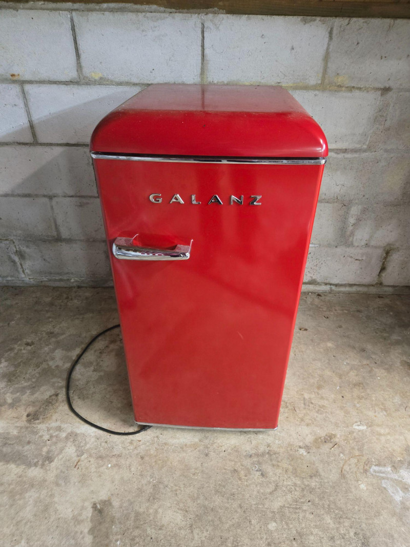 17.6" W x 35.43" H x 21.02" D A vibrant Galanz Retro 3.3 cu. ft. refrigerator in classic cherry‑red with chrome accents. This compact single‑door unit blends nostalgic mid‑century styling with modern convenience, making it perfect for offices, dorms, studios, garages, or vintage‑themed spaces. Glossy red exterior with curved retro profile Chrome handle and trim Compact 3.3 cu. ft. capacity Interior shelving and small freezer compartment Ideal as a secondary fridge or décor statement pieceGalanz Retro 3.3 Cu. Ft. Single Door Fridge