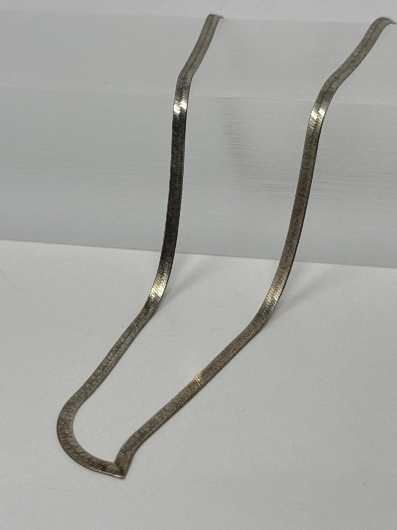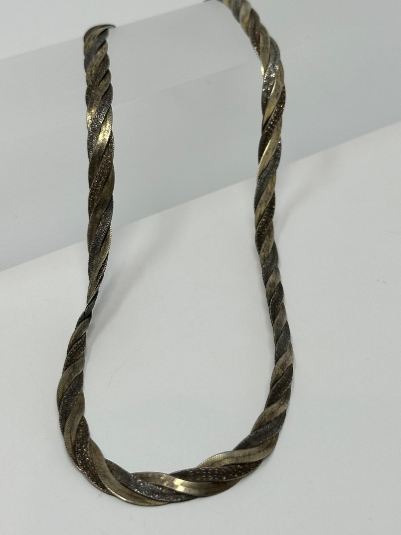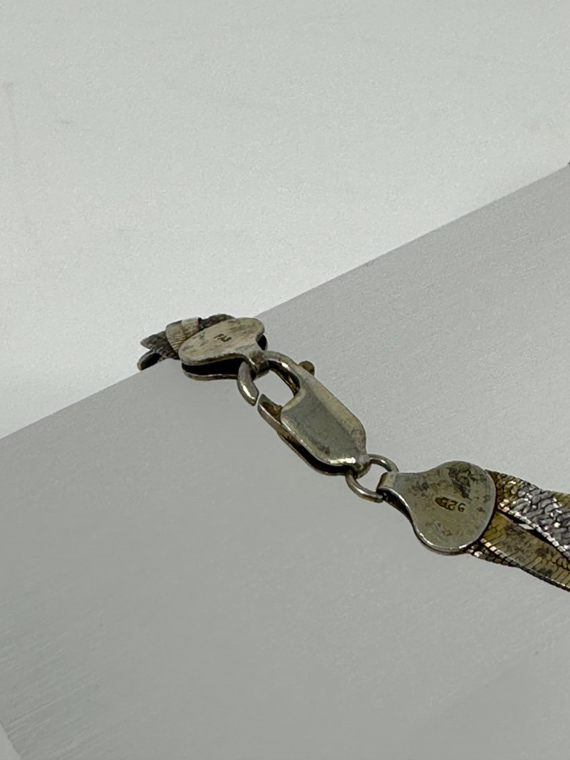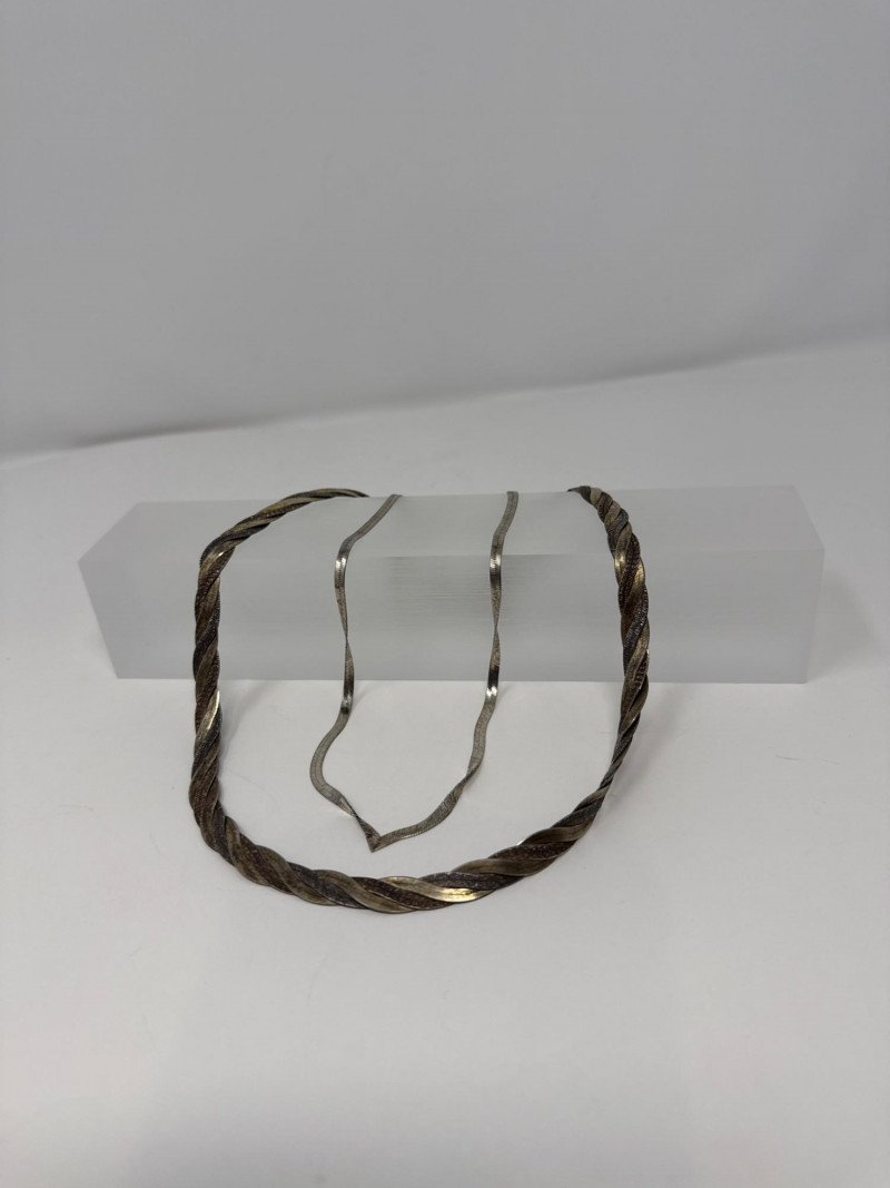 Both Apprx. 8" Clasped Two sterling chains: one a twisted, light‑catching spiral with oxidized contrast, the other a sleek, flat wave chain with a smooth reflective finish.