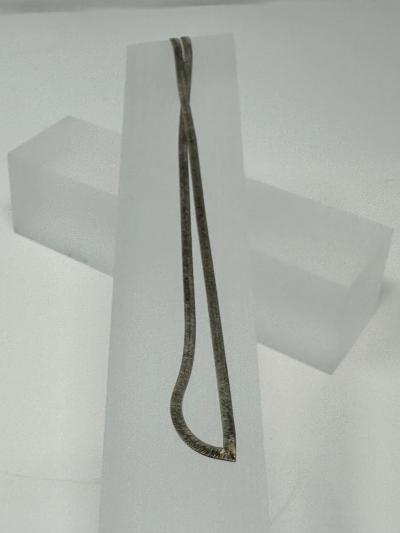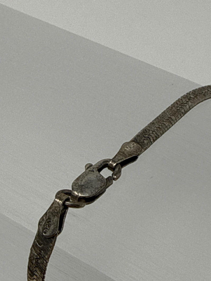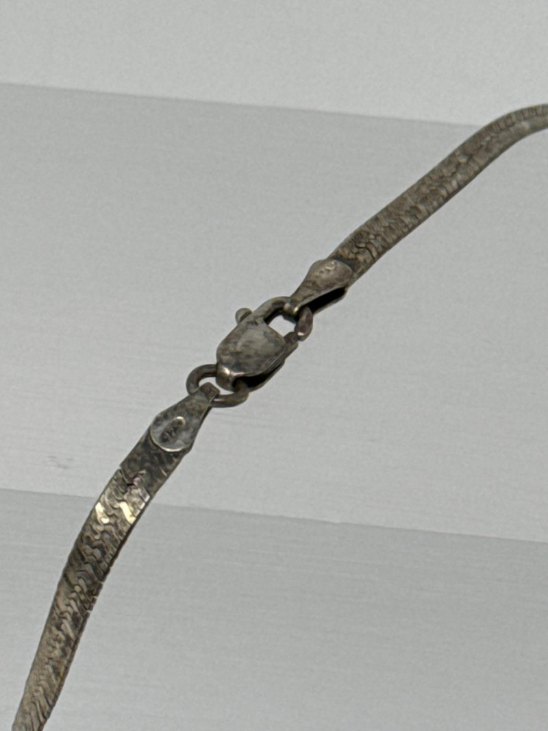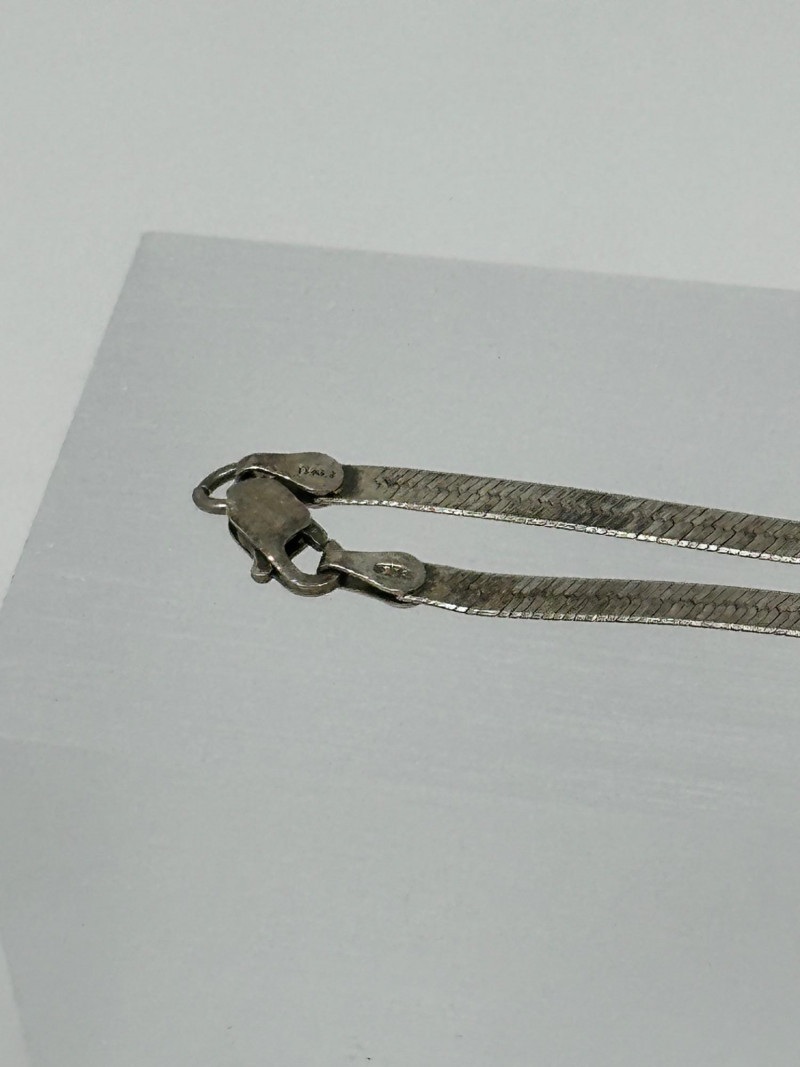 Both Apprx. 8" Clasped Two sterling chains: one a twisted, light‑catching spiral with oxidized contrast, the other a sleek, flat wave chain with a smooth reflective finish.