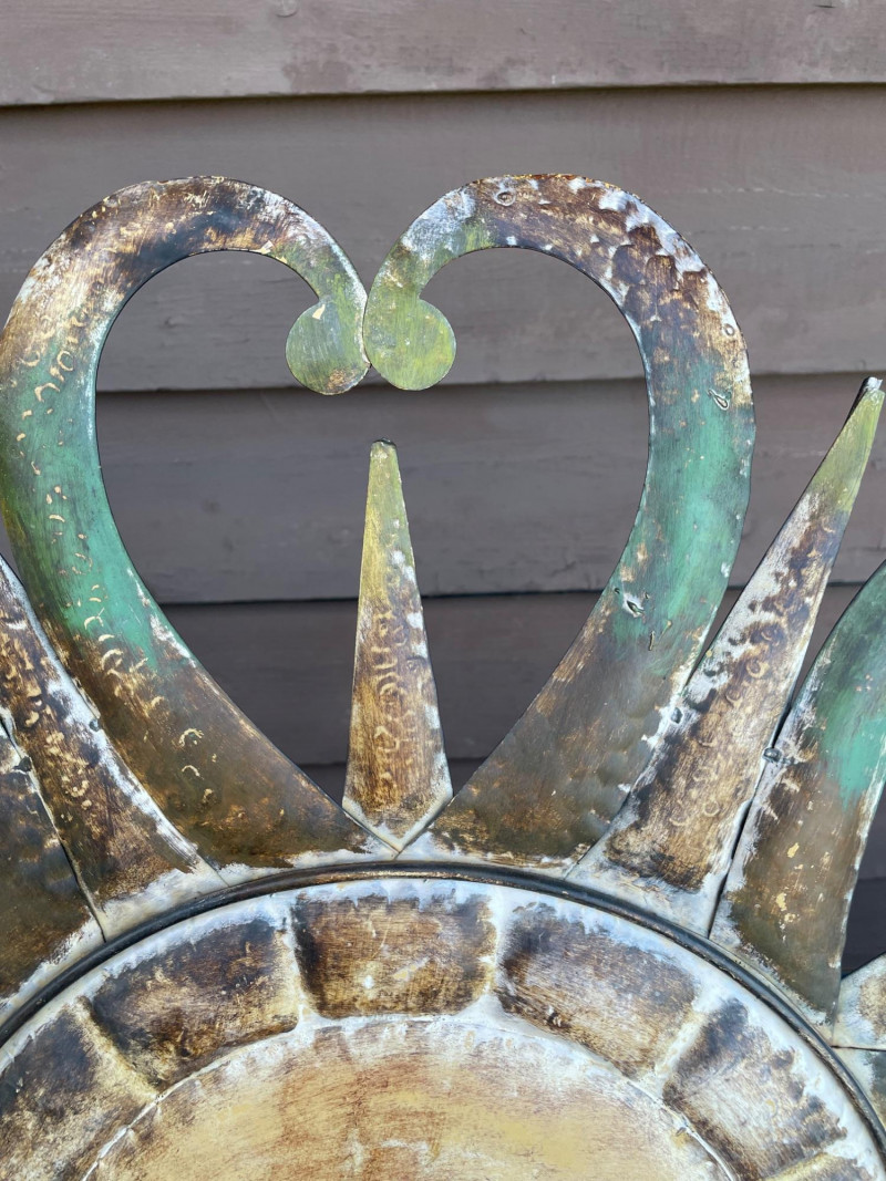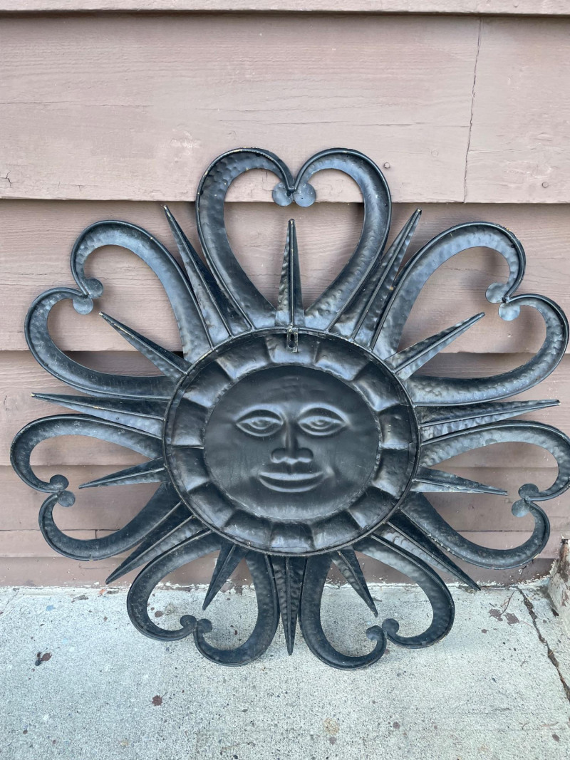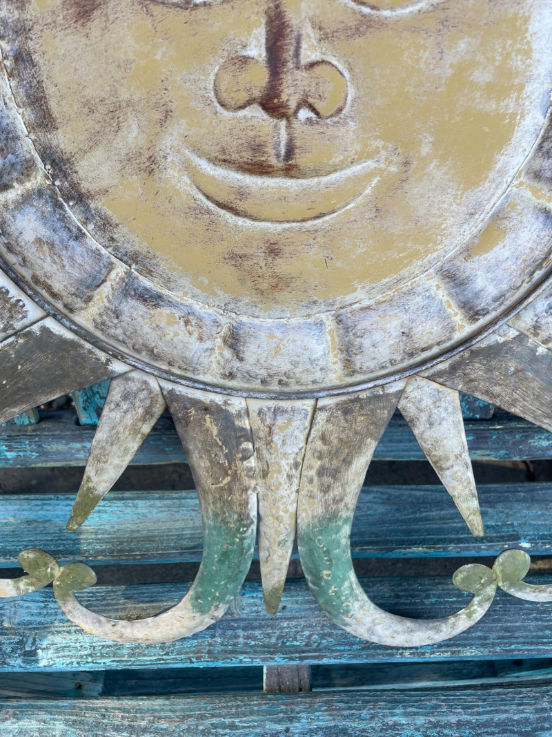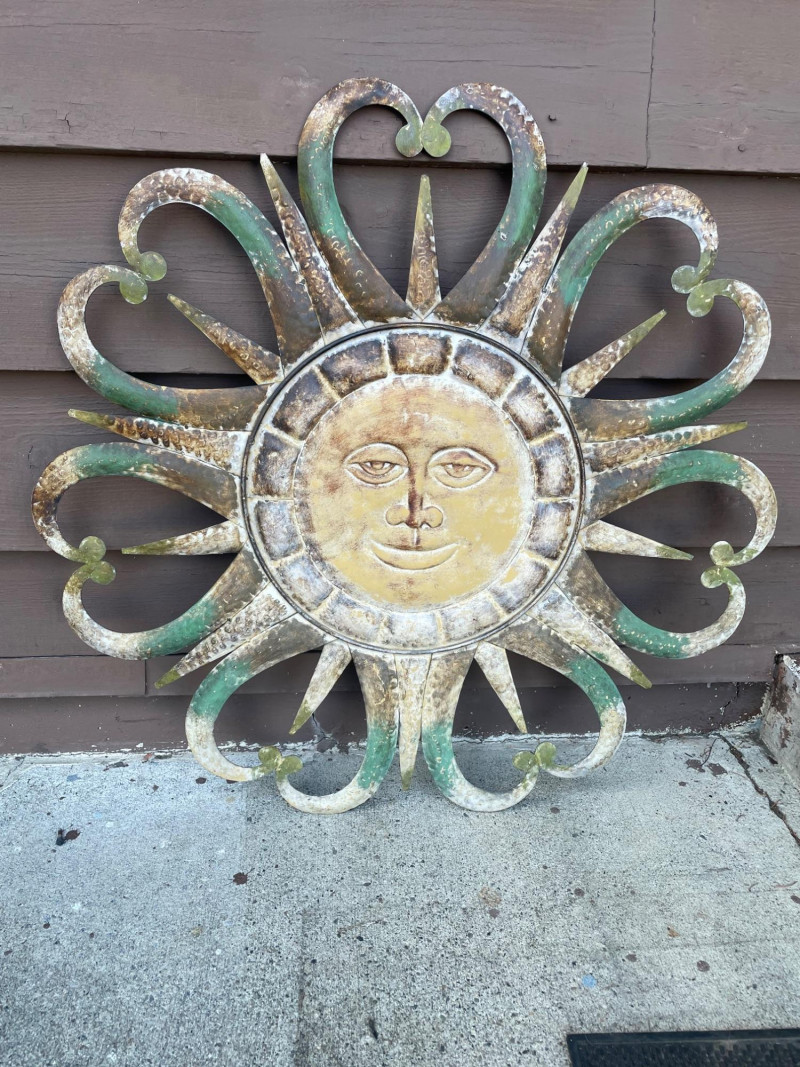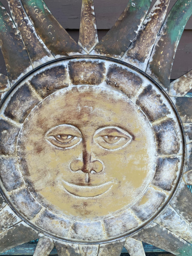 A metal sun‑face wall piece with a smiling central face and mixed straight and curved rays in a weathered gold‑brown‑green patina, in the style of mid‑century and garden sunburst designs, approximately 31" x 30" high.