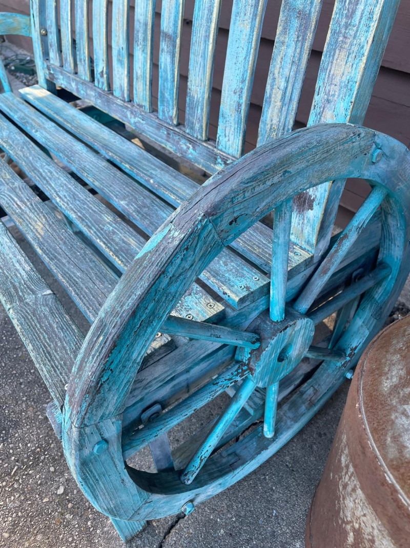 A fir‑wood rocking bench featuring wagon‑wheel armrests, a slatted seat, and a curved slatted back, measuring approximately 45" long, 34" high, and a 14" x 42" seat. Sun Face Wall Decor