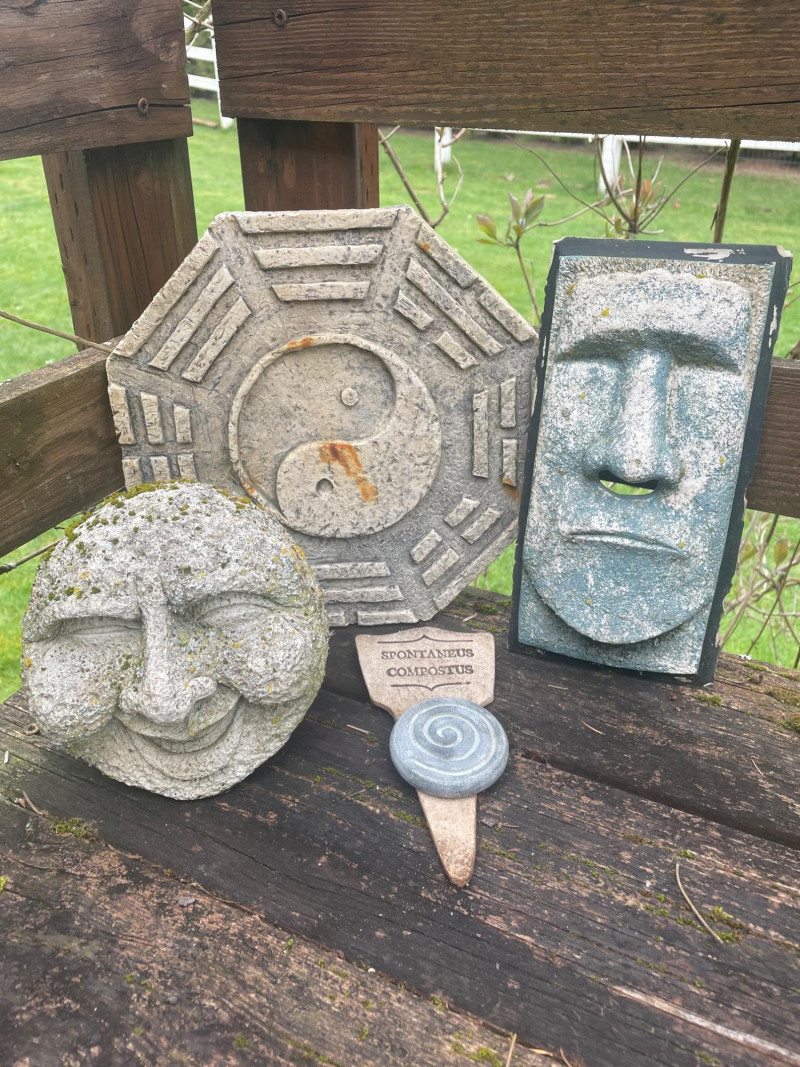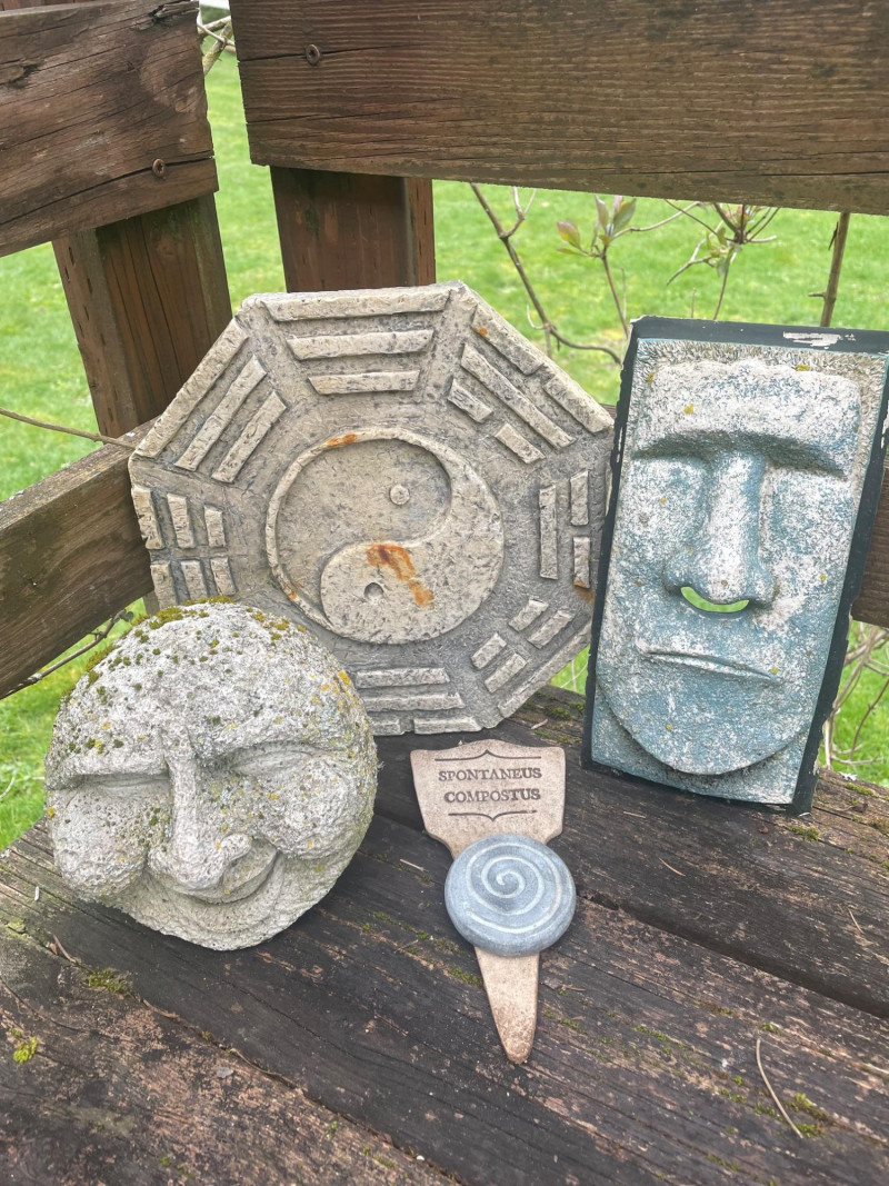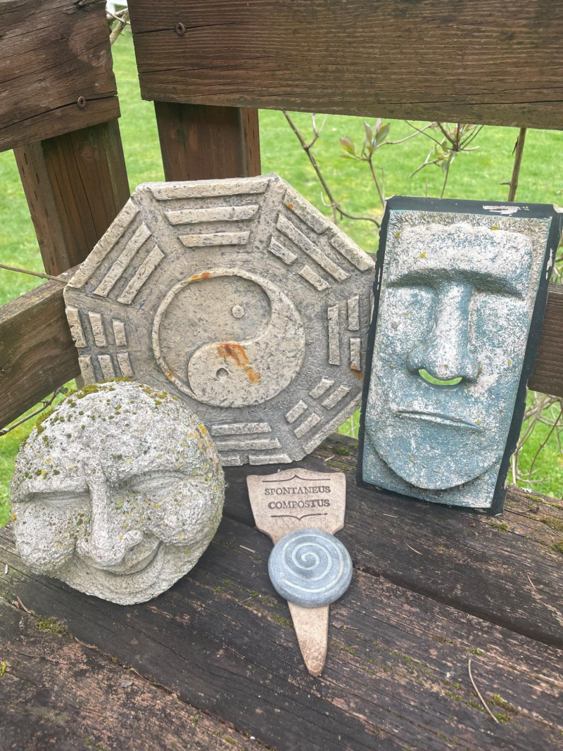 A character‑filled assortment of resin and stone‑look garden art, perfect for adding personality, humor, and cultural flair to outdoor spaces, patios, or meditation corners. This eclectic grouping includes: Round Face: 6 1/2” Square Face: 10” x 5” Spontaneous Marker:7” x 3 1/2” Ying/Yang: 10 1/4”Resin Yard Art