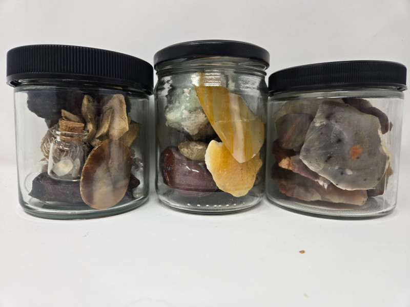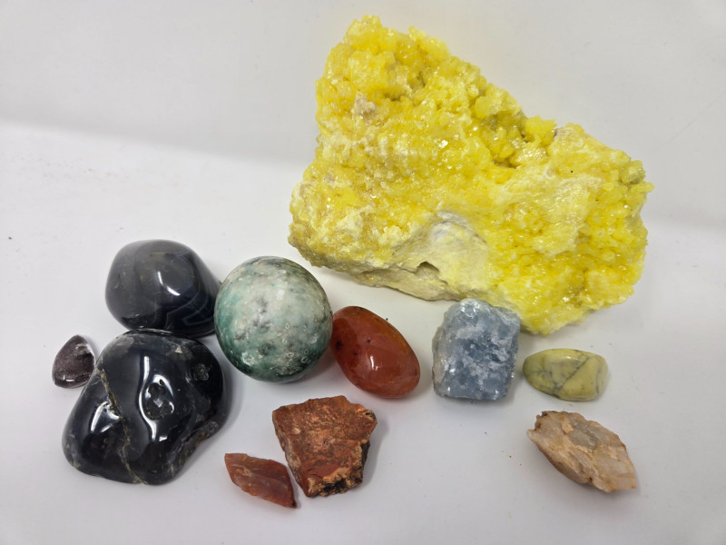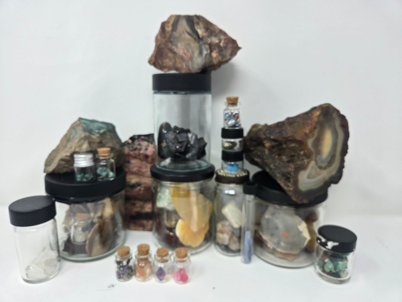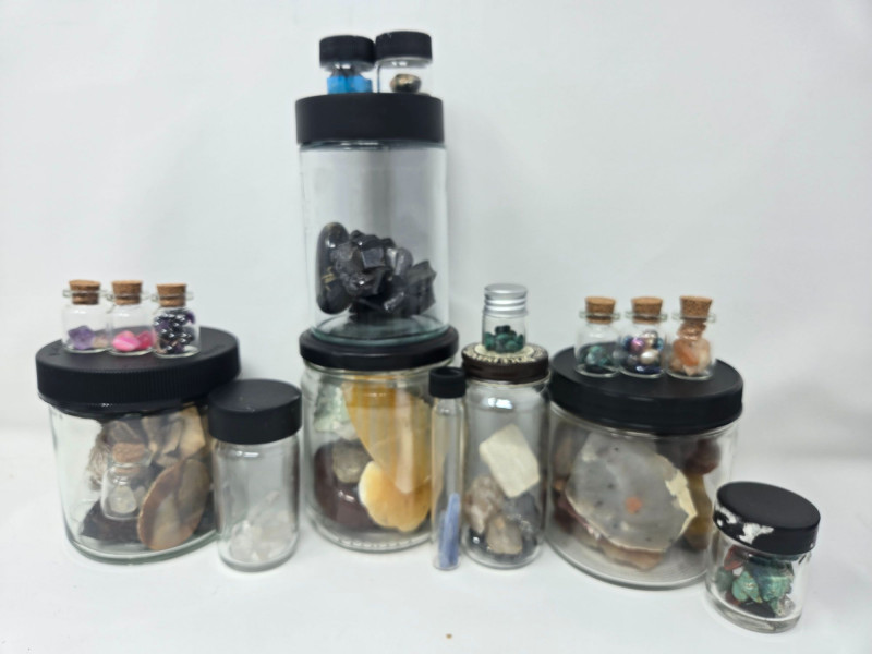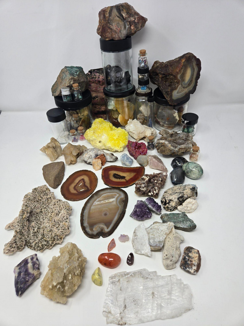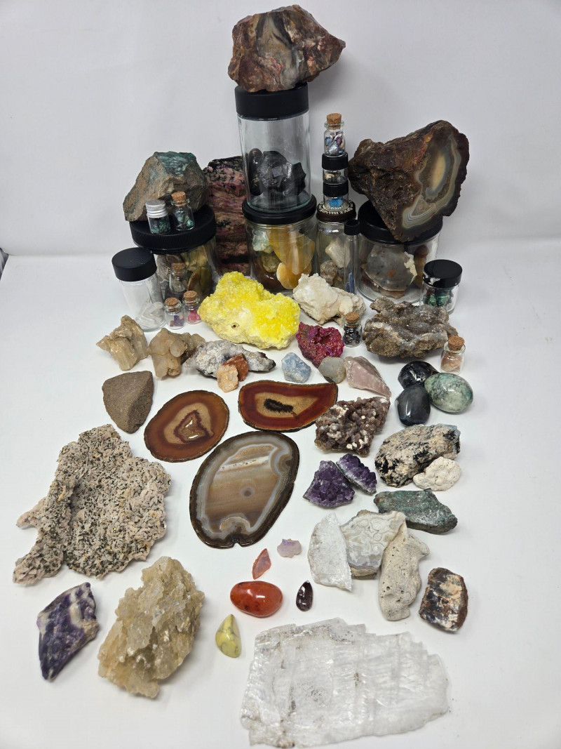A diverse and visually striking assortment of rocks, minerals, and crystals. This curated collection includes: Polished and raw mineral specimens Agate slices with banded patterns Amethyst clusters and quartz points Brightly colored minerals, including a vivid yellow sulfur piece Decorative heart‑shaped crystal Small corked vials and clear jars containing miniature specimens A wide range of textures, colors, and geological forms