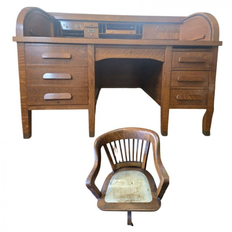 Lot # 26 - Antique 1910‑ish 'Benton‑Herald Desk & Safe Co' Roll‑Top Desk & Chair