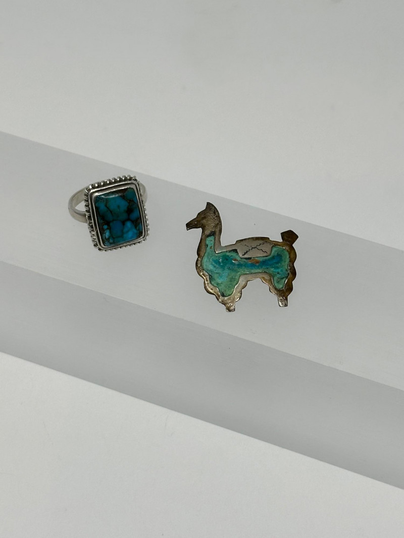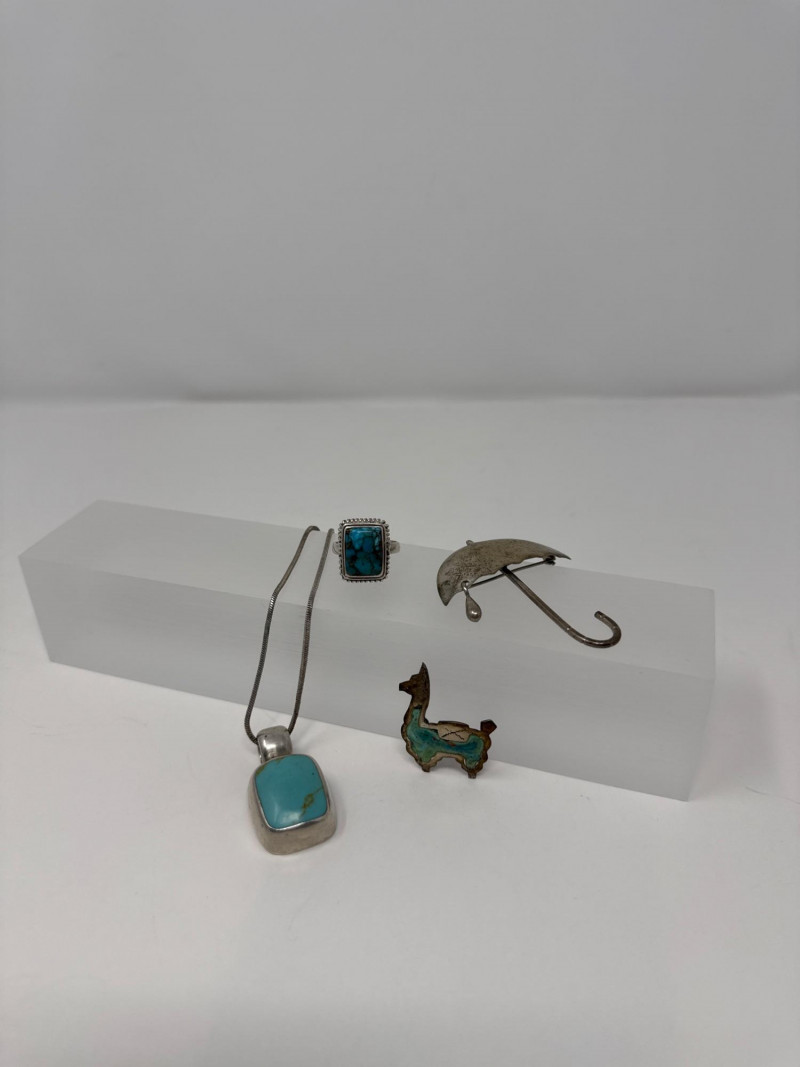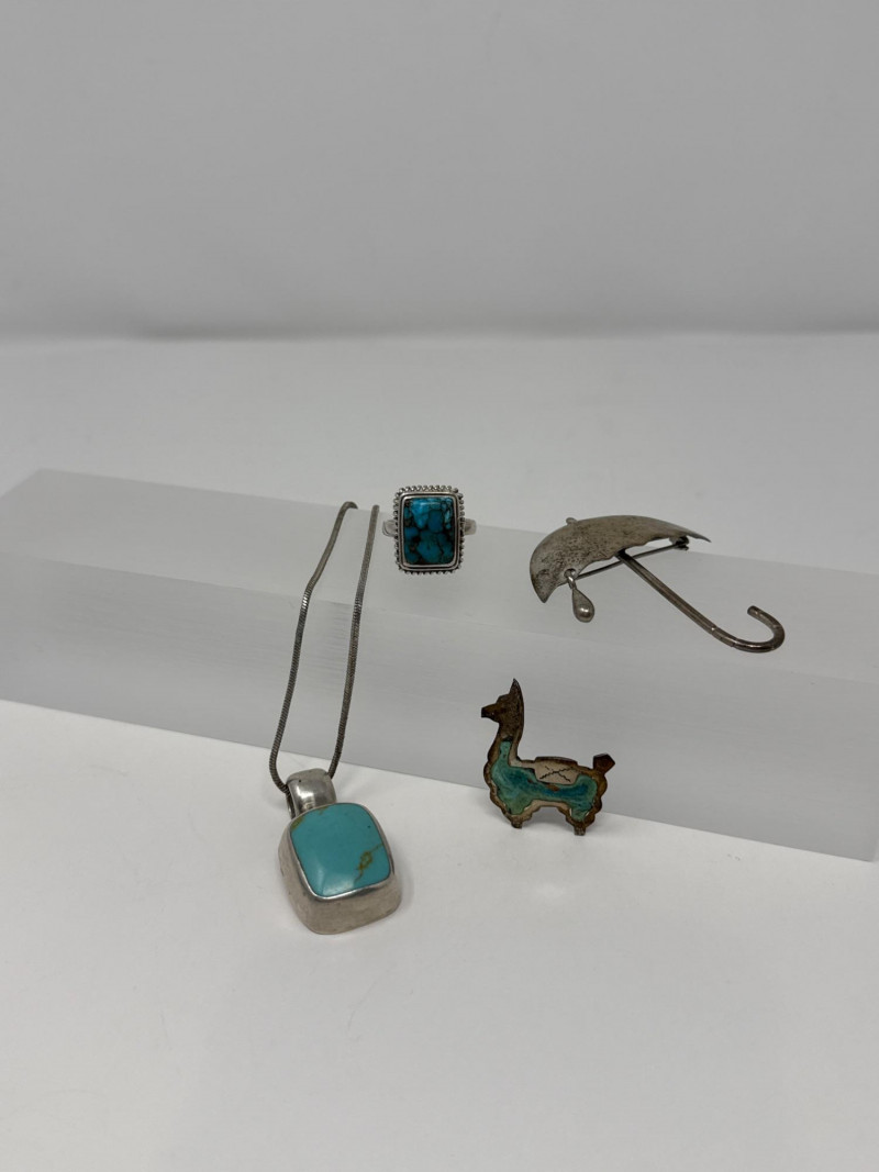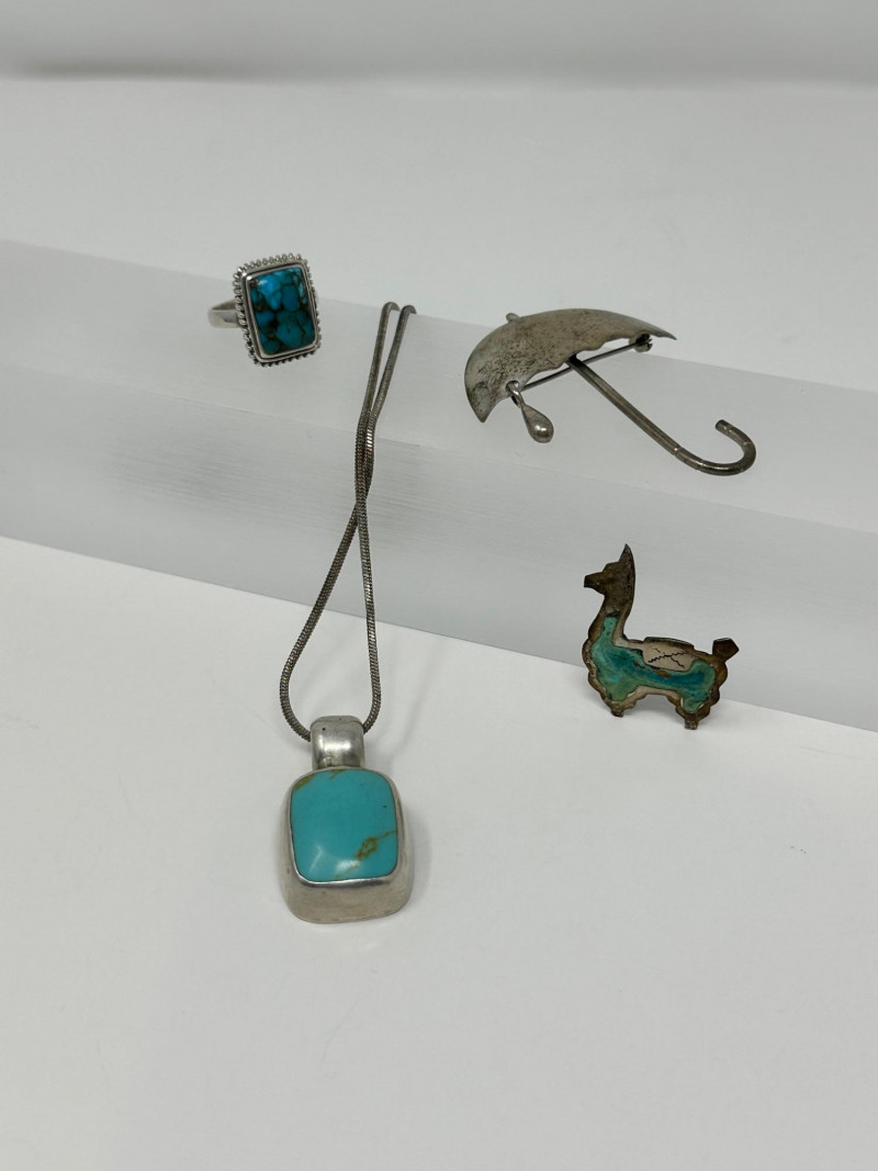 A refined collection of sterling silver and turquoise jewelry, blending artisan craftsmanship with classic Southwestern charm. This curated grouping includes a pendant necklace, a statement ring, and two whimsical brooch‑style pieces. Included Highlights: Sterling Turquoise Pendant Necklace Oval turquoise stone set in silver Comes on a silver chain 18" (appears to be sterling, magnet did not stick to the surface) The weight of the chain was not weighed because the chain was not marked. Sterling Turquoise Ring (Size 5.5) Rectangular turquoise stone Decorative silver border with traditional styling Sterling Umbrella Brooch Sculptural silver umbrella design Elegant and unique accent piece Sterling Llama Pin with Turquoise Inlay Charming llama silhouette Turquoise inlay adds color and characterSterling and Turquoise