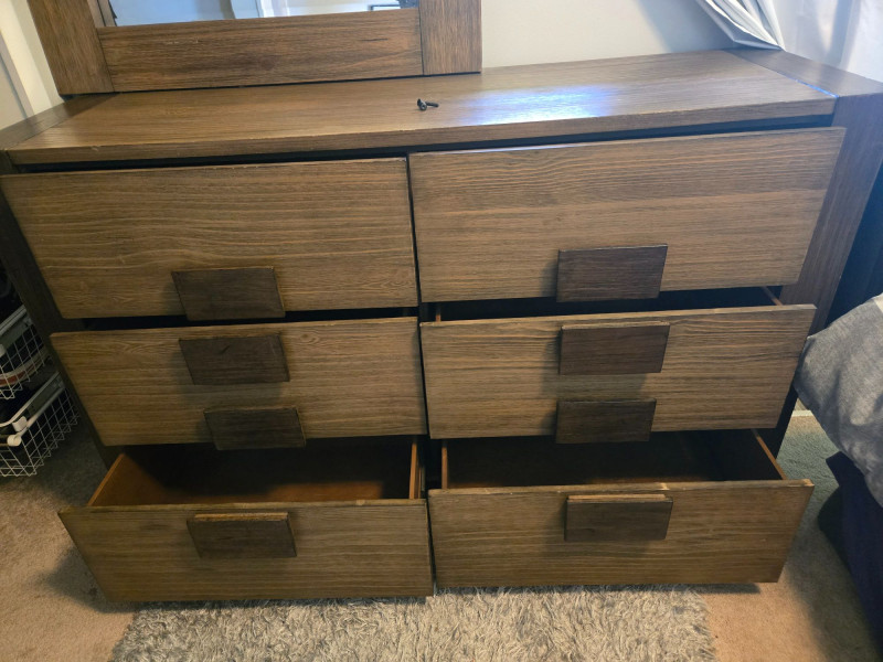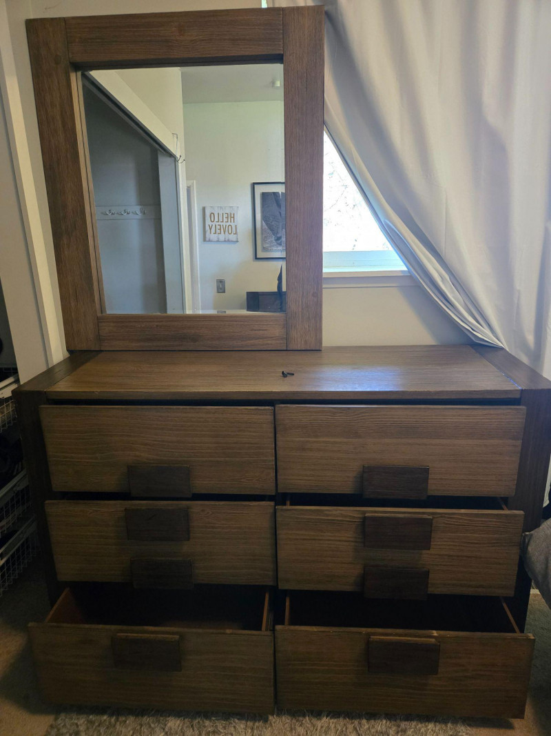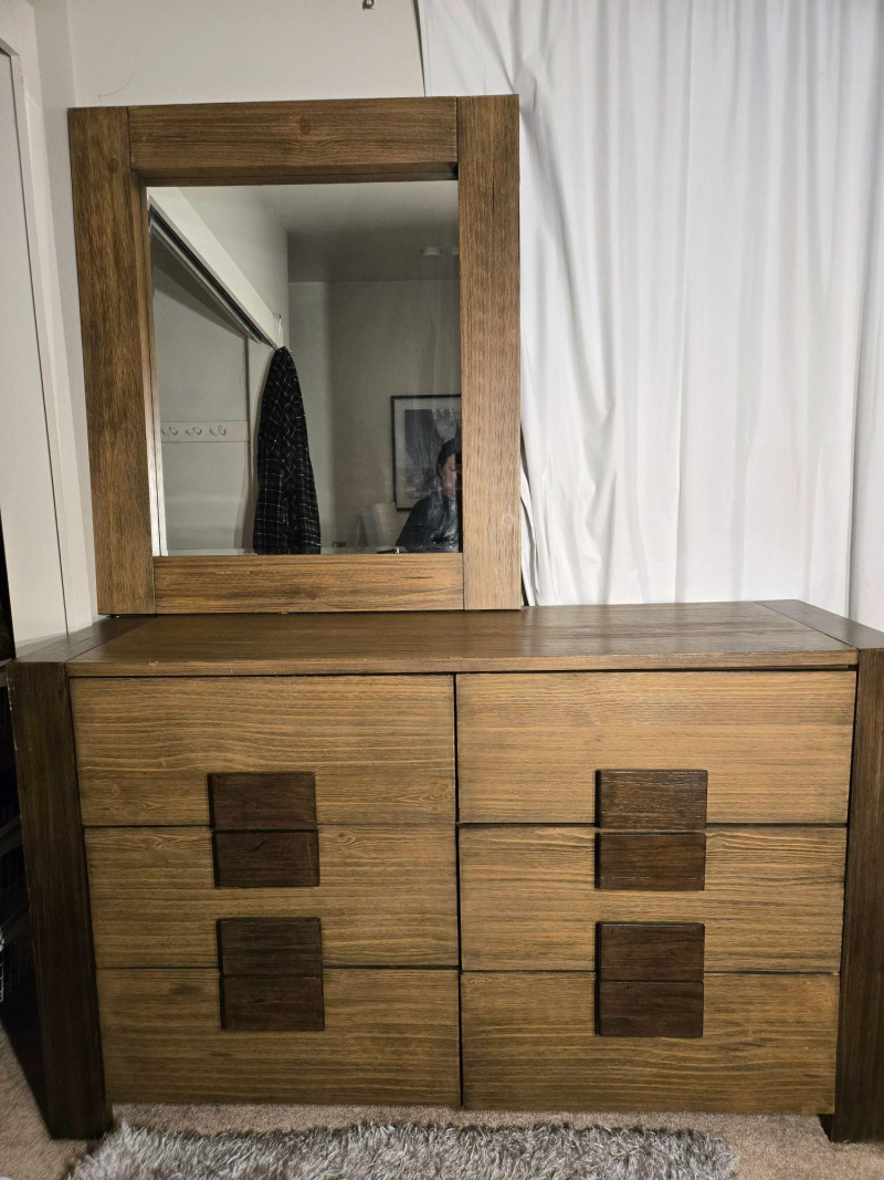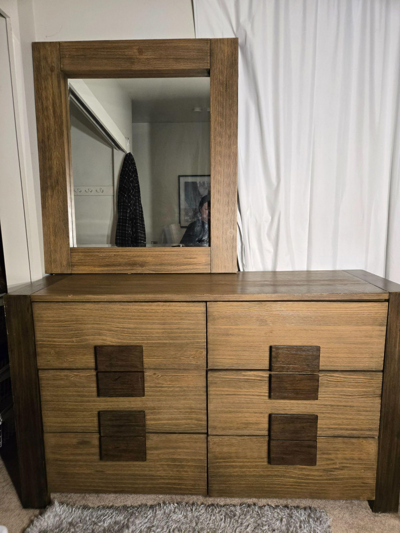 HB 38w x 18d x 43t Dresser 60w x 19d x 36t Mirror 37w x 42t x 2d A clean, contemporary solid wood highboy and matching dresser with mirror, built with sturdy construction and a warm natural‑wood finish. This coordinated set features: Dresser with Mirror: Six spacious drawers in a 3‑over‑3 layout Square dark‑wood pulls for a modern contrast Large rectangular mirror with matching wood frame Smooth, minimalist lines suitable for many décor styles Highboy: Coordinating design and finish Multiple deep drawers for ample storage Solid, stable build consistent with the dresser A practical and attractive bedroom set offering both style and durability.Solid/Sturdy Highboy & Dresser w/ Mirror