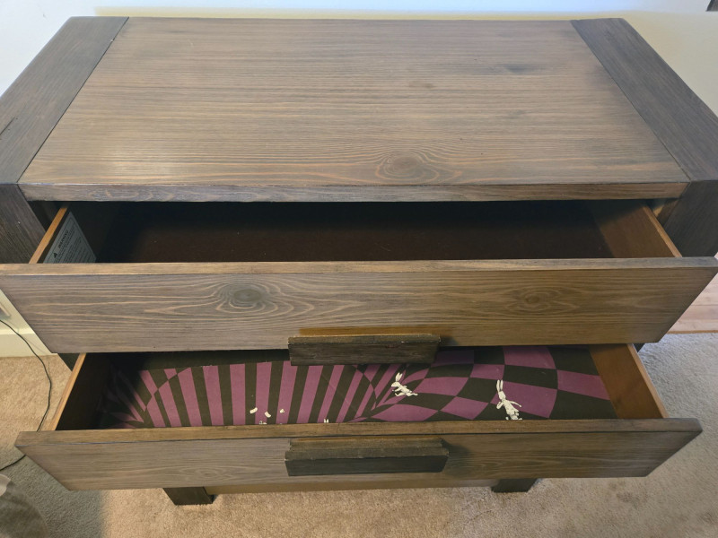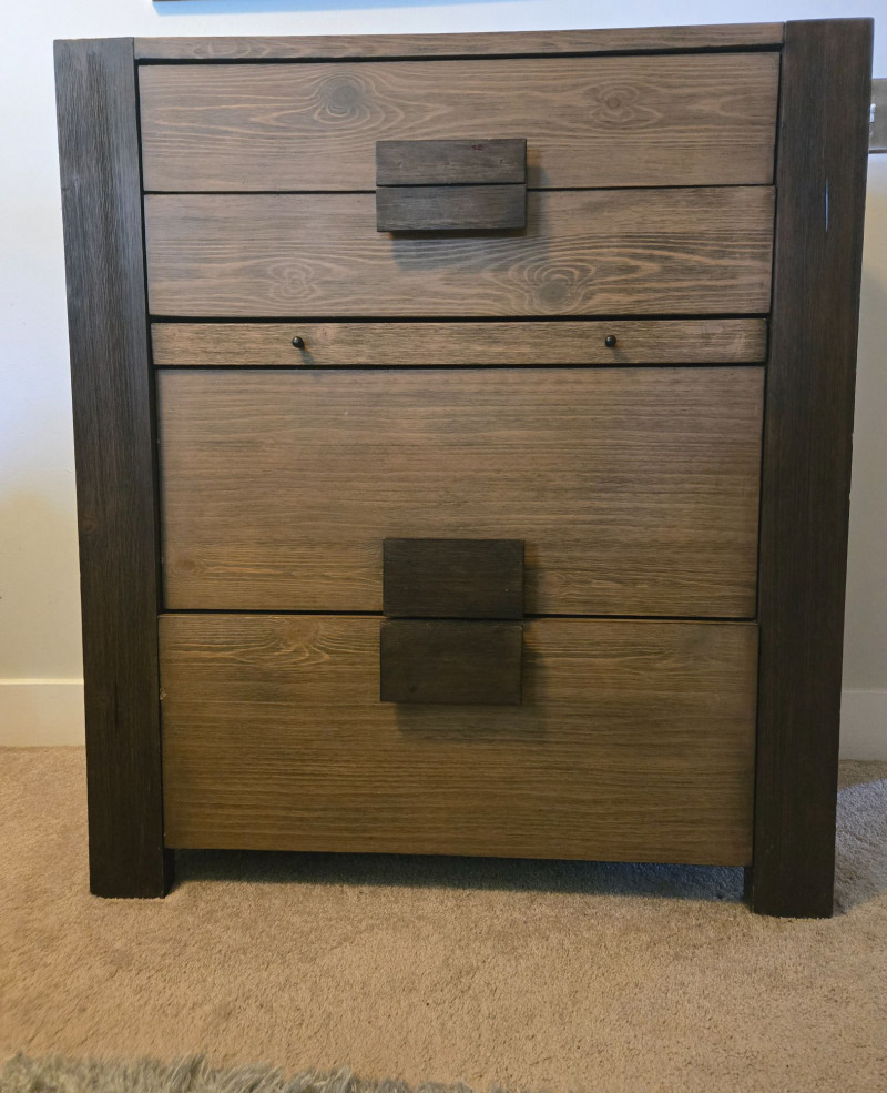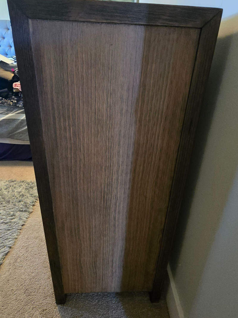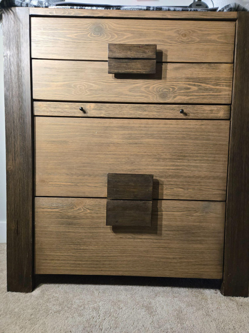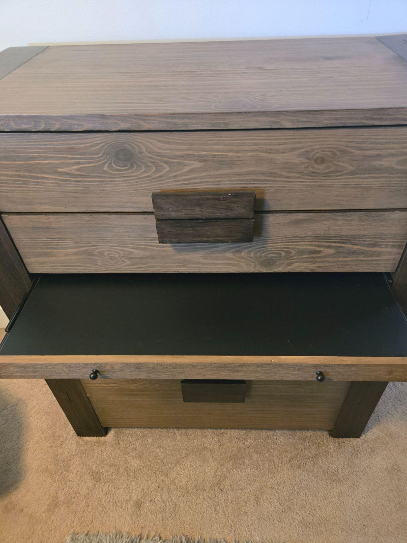 HB 38w x 18d x 43t Dresser 60w x 19d x 36t Mirror 37w x 42t x 2d A clean, contemporary solid wood highboy and matching dresser with mirror, built with sturdy construction and a warm natural‑wood finish. This coordinated set features: Dresser with Mirror: Six spacious drawers in a 3‑over‑3 layout Square dark‑wood pulls for a modern contrast Large rectangular mirror with matching wood frame Smooth, minimalist lines suitable for many décor styles Highboy: Coordinating design and finish Multiple deep drawers for ample storage Solid, stable build consistent with the dresser A practical and attractive bedroom set offering both style and durability.Solid/Sturdy Highboy & Dresser w/ Mirror