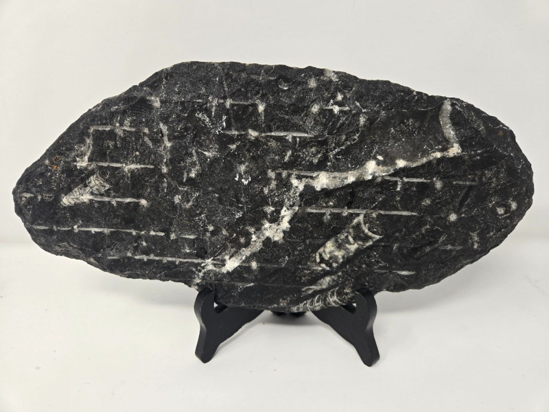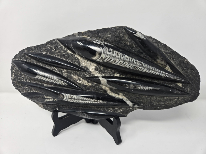 A striking trio of natural history pieces, perfect for collectors, décor enthusiasts, or anyone who appreciates geological and fossil specimens. This lot includes: Orthoceras Fossil Sculpture