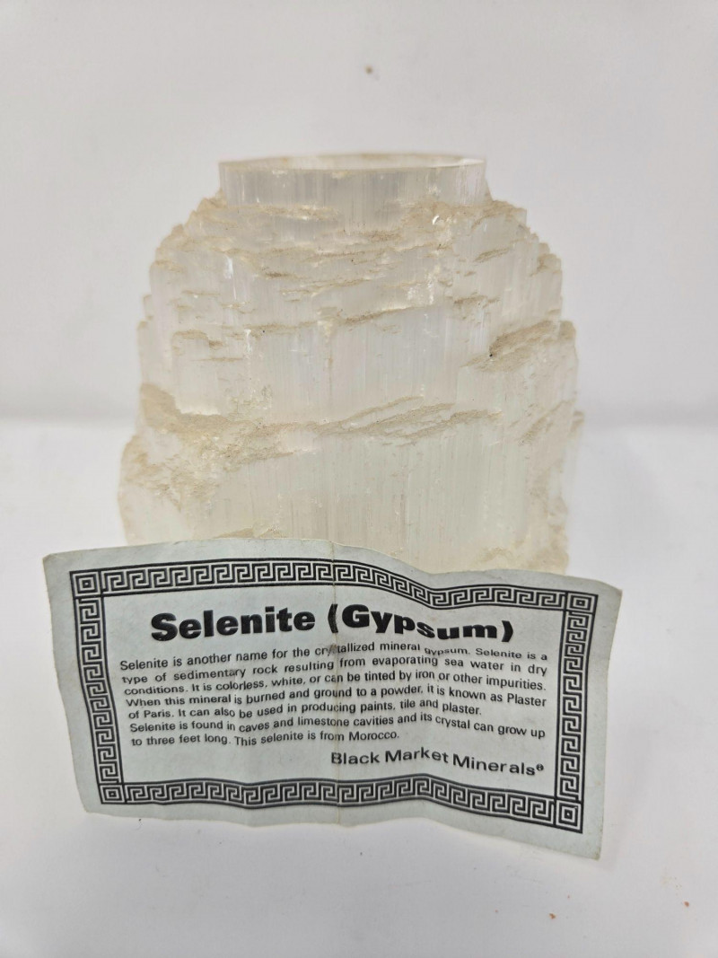 A carved selenite tower with its signature translucent glow and layered structure. Designed to hold a light source for a soft, luminous effect.Fossil Treasures