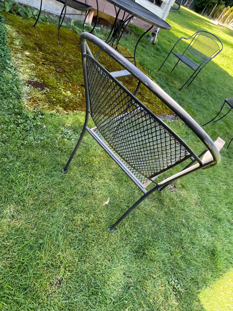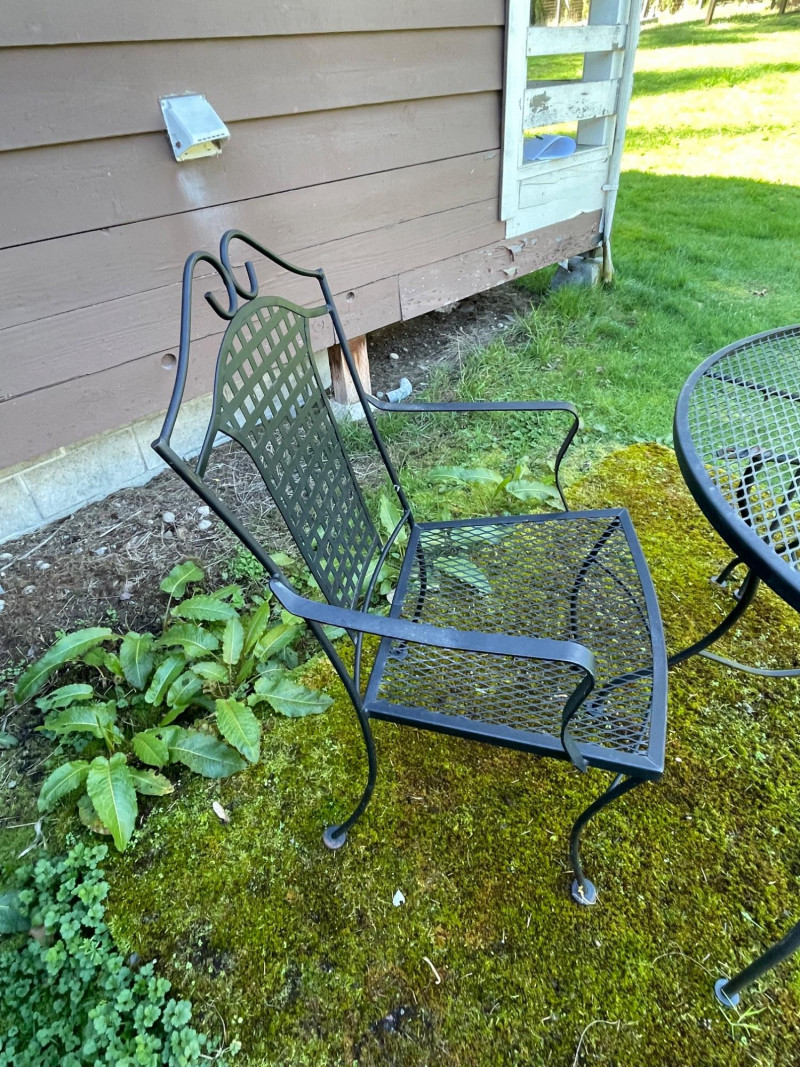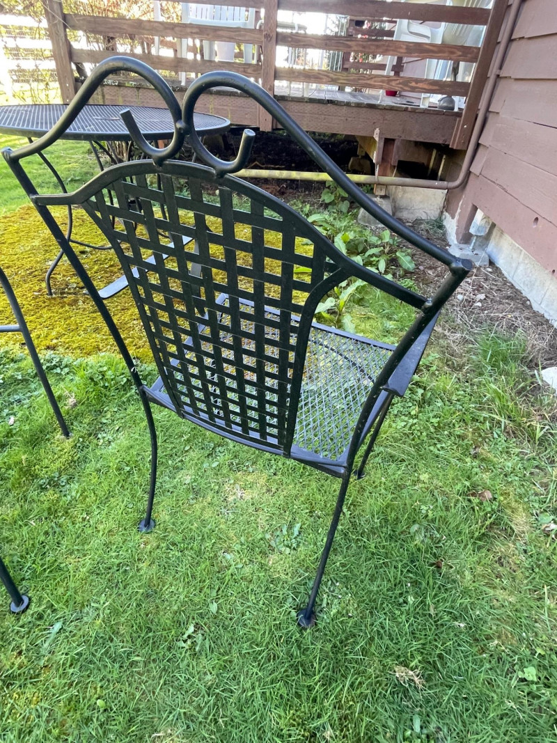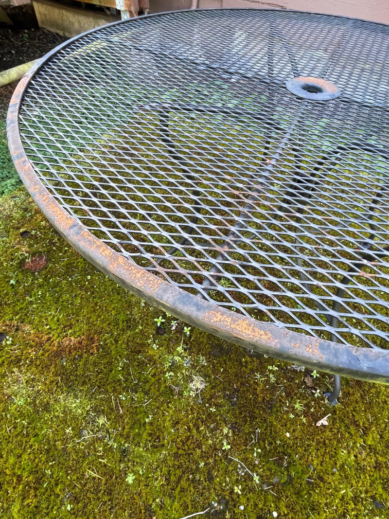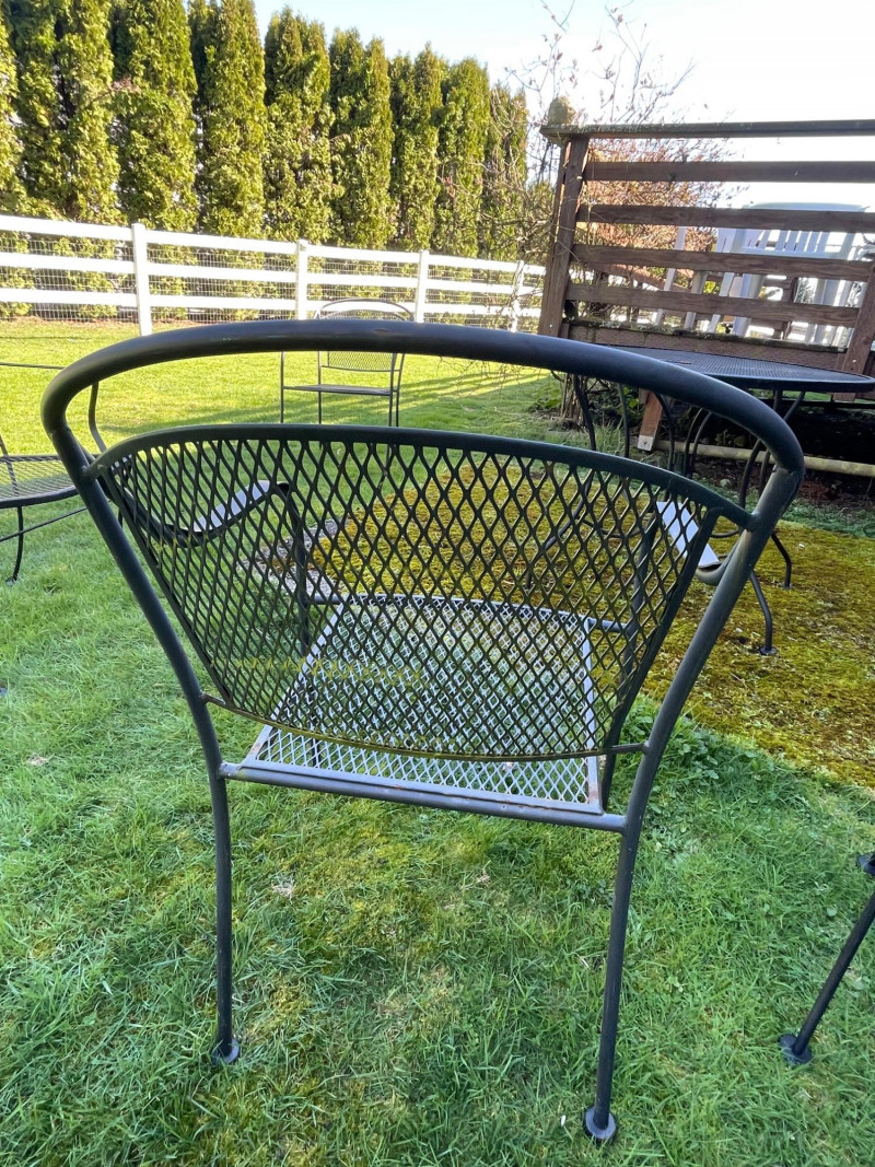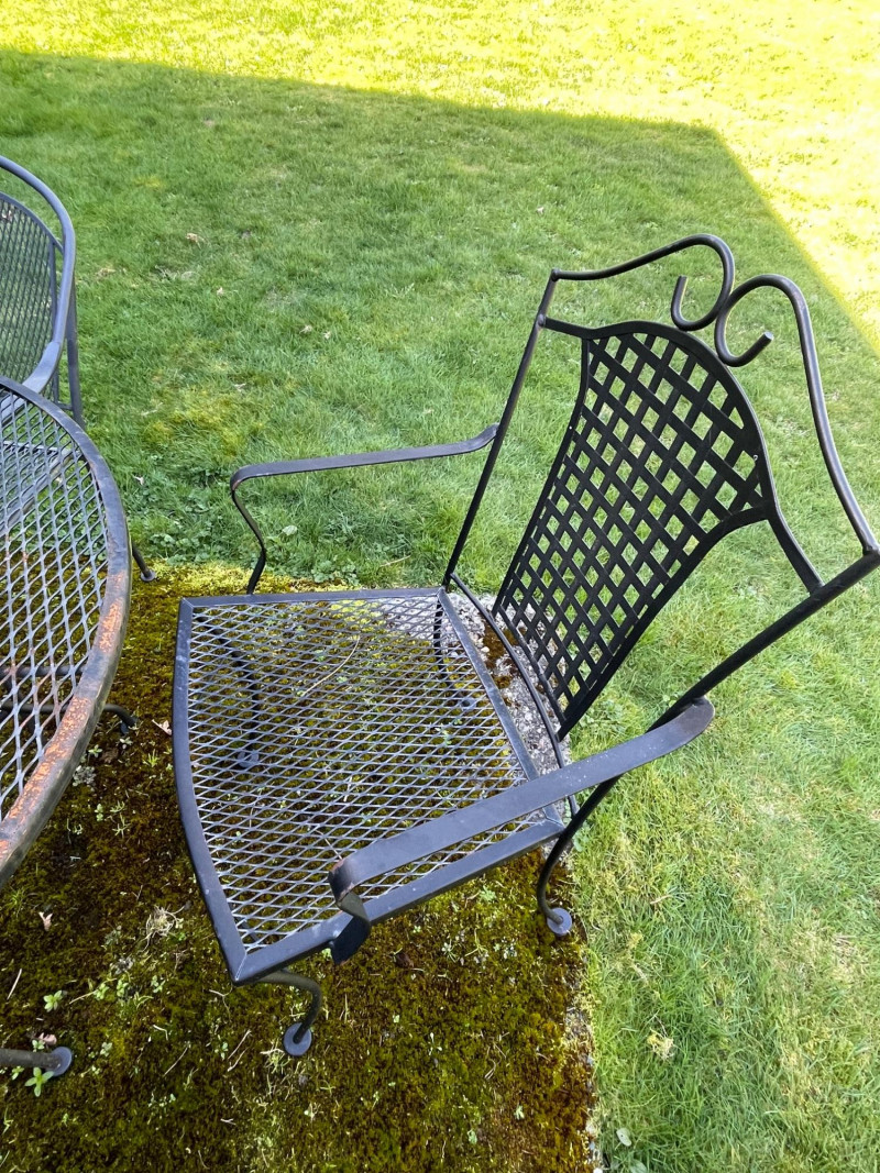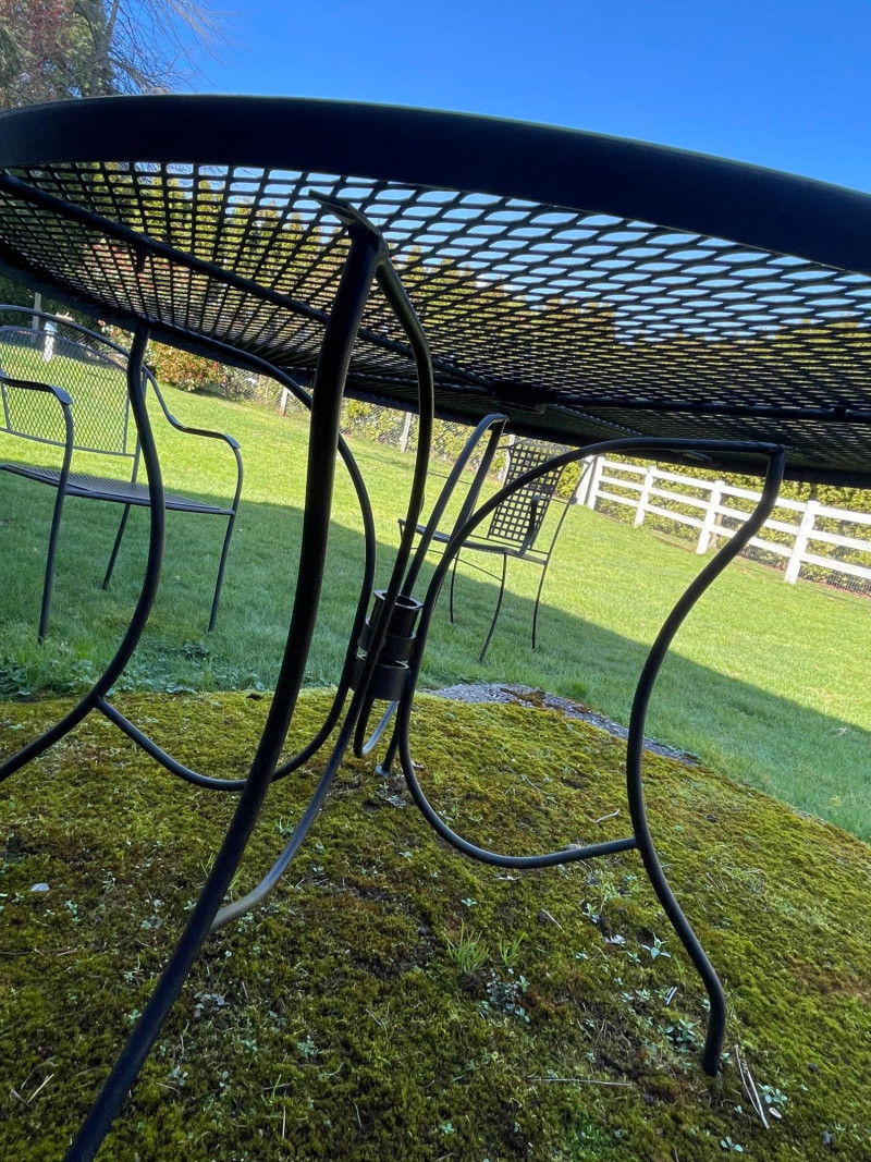 Outdoor Table and 4 Chairs – Metal A classic metal outdoor patio set featuring a round mesh‑top table and four mesh chairs, perfect for garden seating, porch gatherings, or a shaded backyard corner. The open‑weave design offers durability and easy drainage, while the uniform metal construction provides a cohesive, timeless look. Features: Pre‑owned outdoor condition with visible weathering and moss on surfaces. All items sold AS IS, WHERE IS. Table: Top 42” Round x 38” H (top not attached) Ornate Chair:48” H x Seat 27” x 18” Rounded Top Chair: 32” H x Seat 15”x 18” Needs cleaning and bolts to reattach table top to base