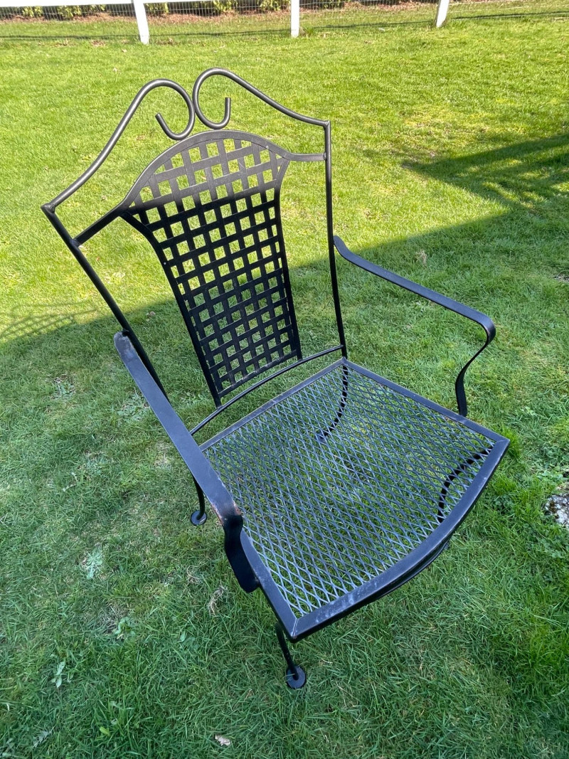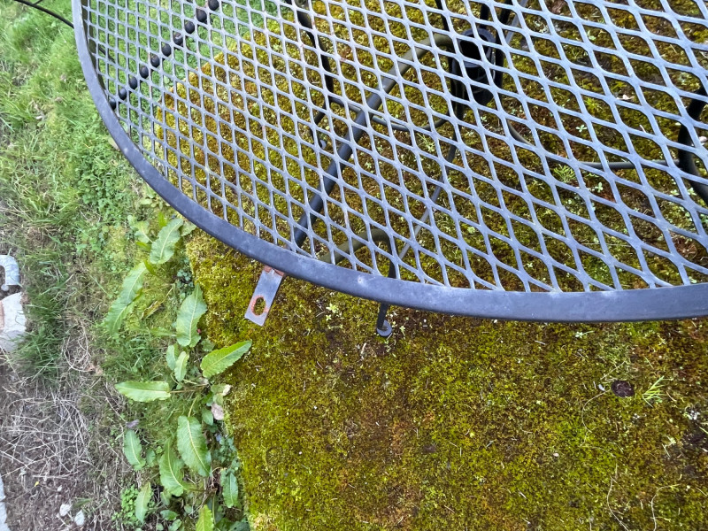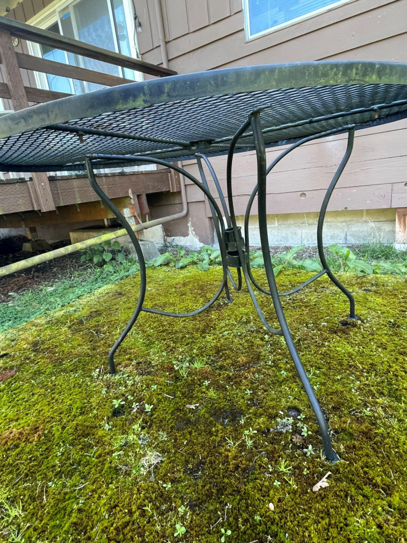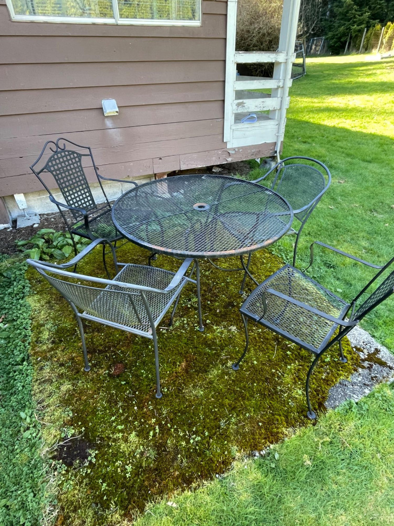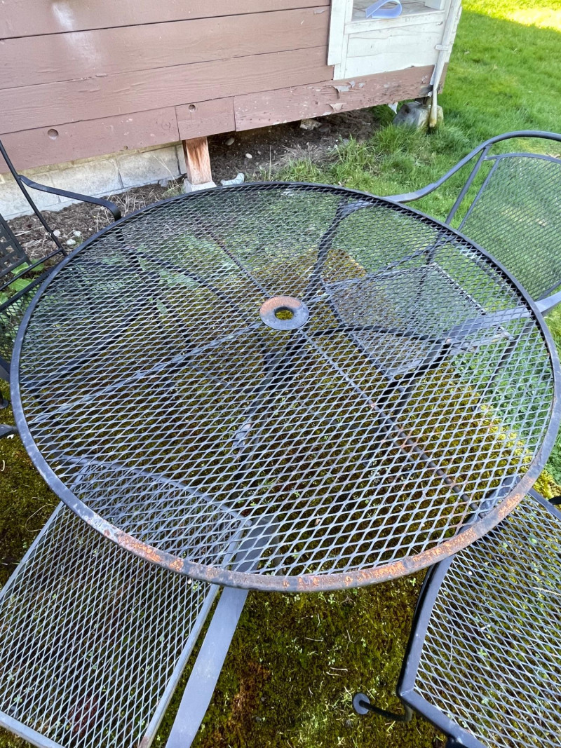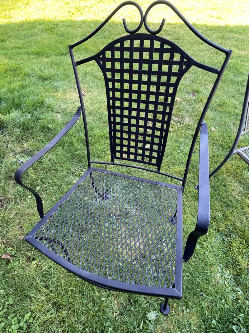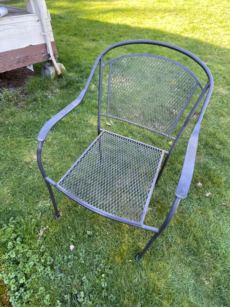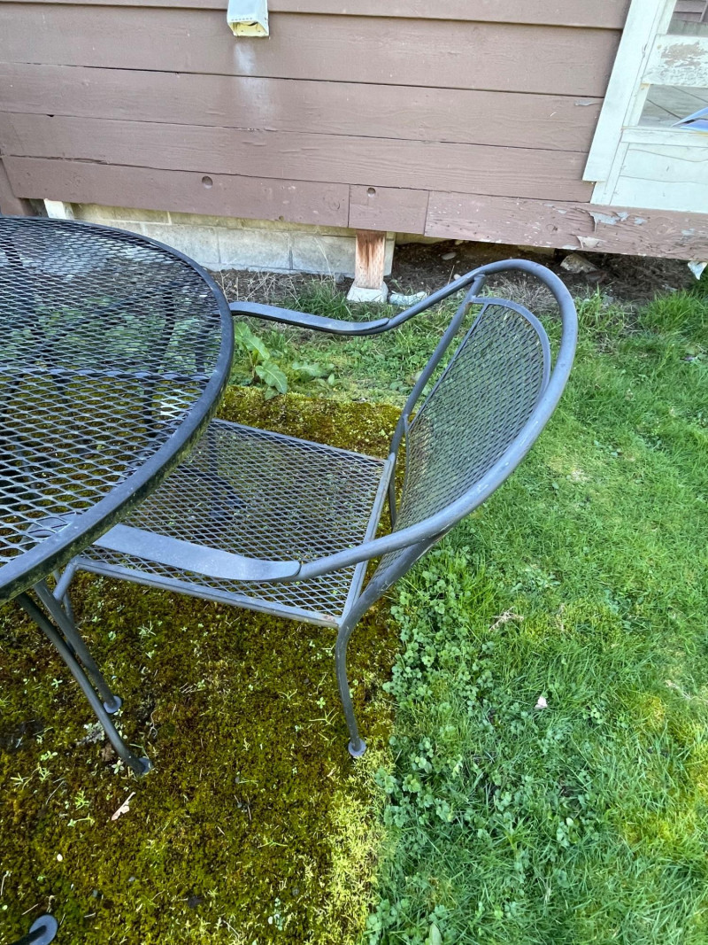 Outdoor Table and 4 Chairs – Metal A classic metal outdoor patio set featuring a round mesh‑top table and four mesh chairs, perfect for garden seating, porch gatherings, or a shaded backyard corner. The open‑weave design offers durability and easy drainage, while the uniform metal construction provides a cohesive, timeless look. Features: Pre‑owned outdoor condition with visible weathering and moss on surfaces. All items sold AS IS, WHERE IS. Table: Top 42” Round x 38” H (top not attached) Ornate Chair:48” H x Seat 27” x 18” Rounded Top Chair: 32” H x Seat 15”x 18” Needs cleaning and bolts to reattach table top to base
