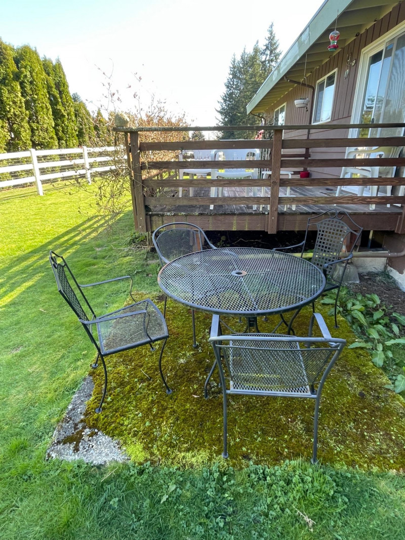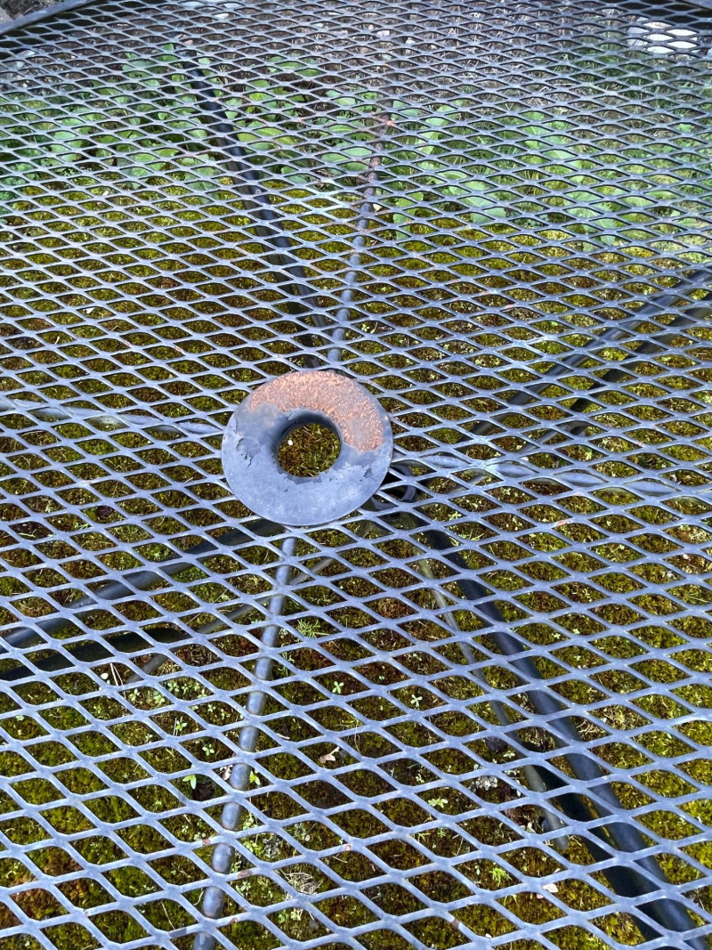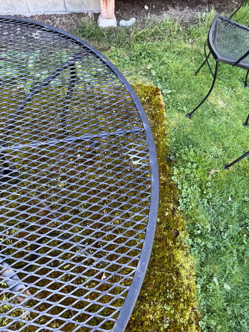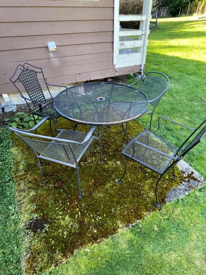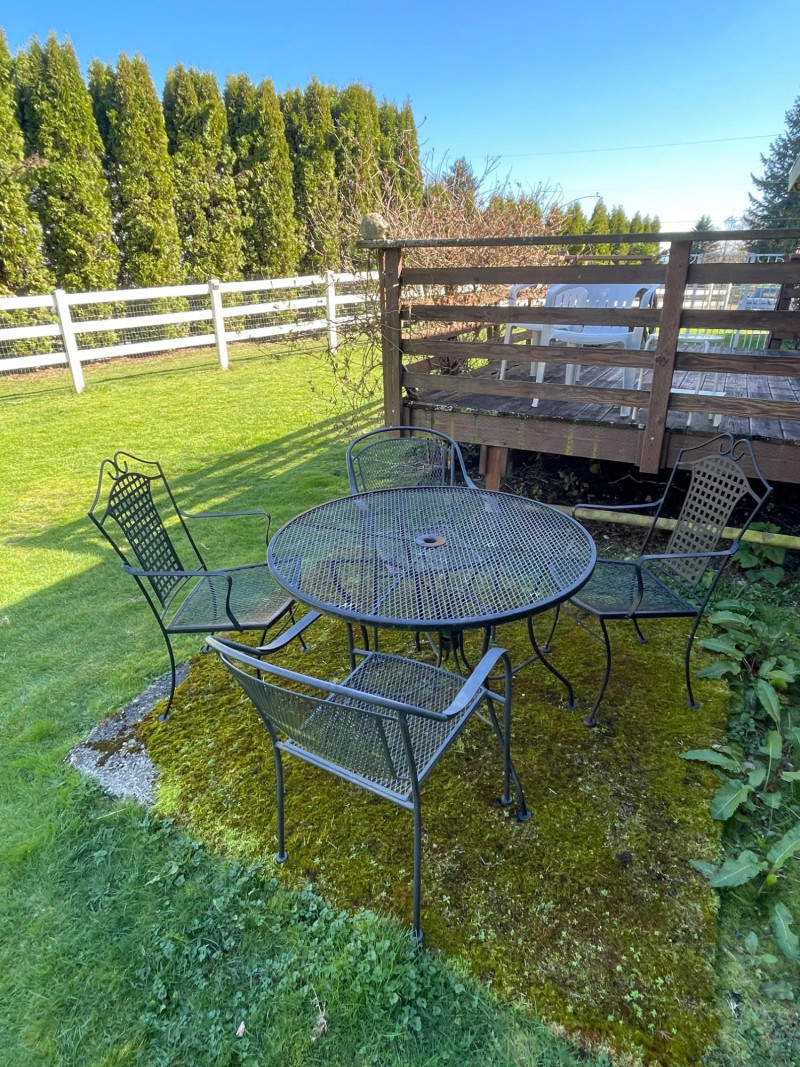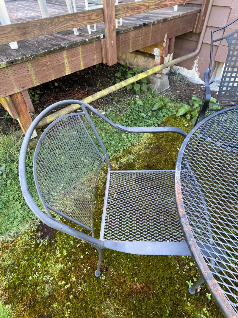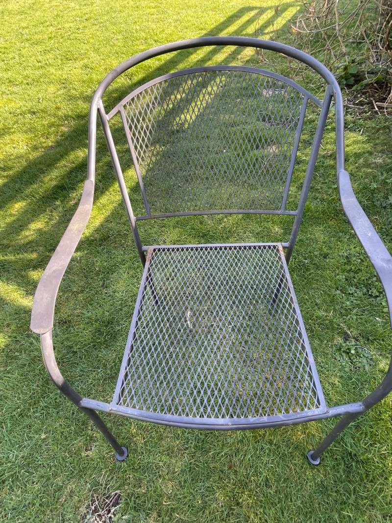 Outdoor Table and 4 Chairs – Metal A classic metal outdoor patio set featuring a round mesh‑top table and four mesh chairs, perfect for garden seating, porch gatherings, or a shaded backyard corner. The open‑weave design offers durability and easy drainage, while the uniform metal construction provides a cohesive, timeless look. Features: Pre‑owned outdoor condition with visible weathering and moss on surfaces. All items sold AS IS, WHERE IS. Table: Top 42” Round x 38” H (top not attached) Ornate Chair:48” H x Seat 27” x 18” Rounded Top Chair: 32” H x Seat 15”x 18” Needs cleaning and bolts to reattach table top to base
