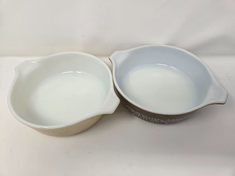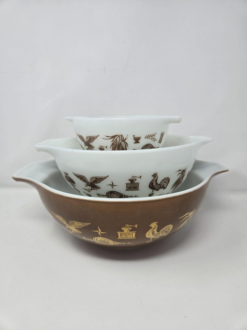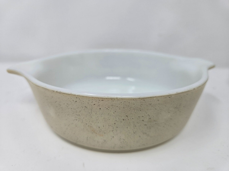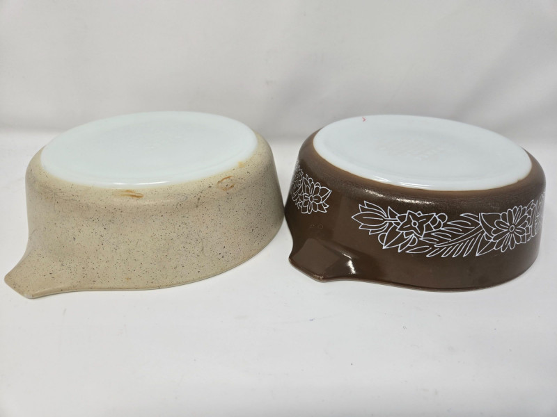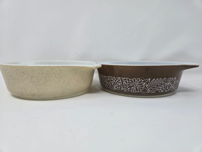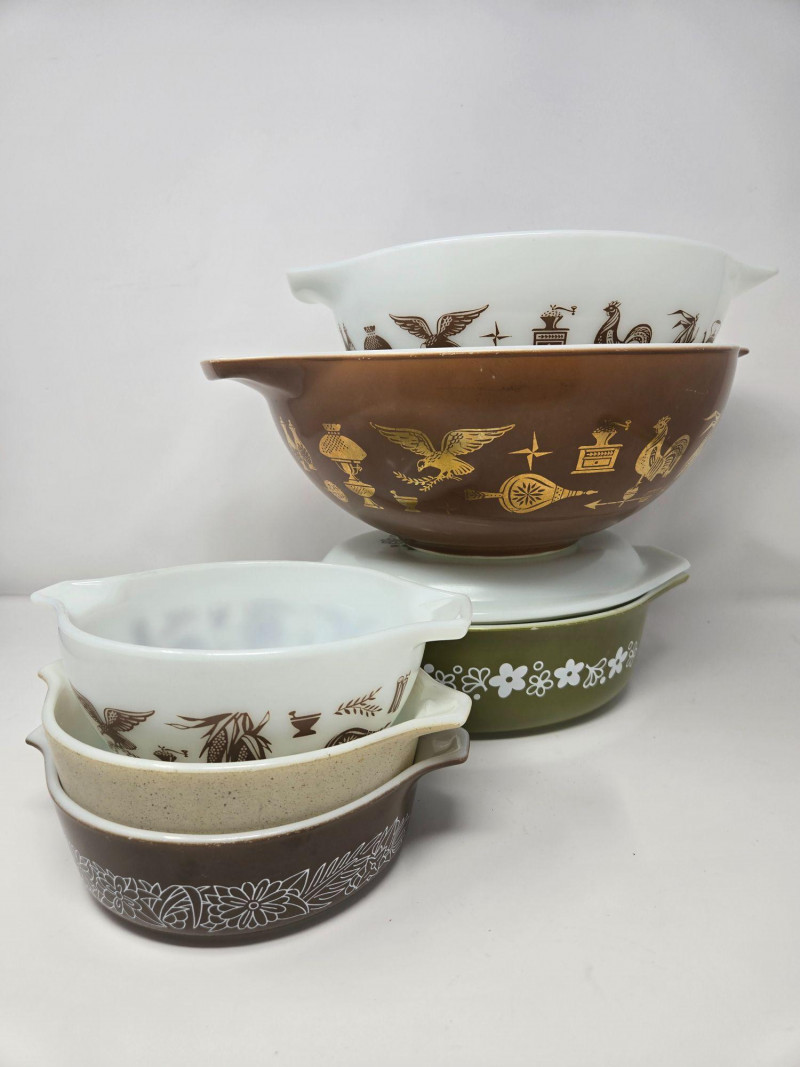 A charming mixed collection of 8 vintage Pyrex pieces, featuring classic mid‑century patterns and colors. This lot includes: Large 'Cinderella' mixing bowls with brown‑on‑white and gold‑on‑brown Americana‑style motifs, sm-3 1/4" x 4 1/4"t - lg-10 1/26 x 6"t Smaller bowls and casseroles in coordinating earth‑tone patterns Speckled beige 'Woodland' bowl 6 1/2"r x 2"t, 1 pint Dark brown floral‑patterned bowl Oval green, 1.5-quart, 'Crazy Daisy' dish with Lid 3"t /4 1/2"t w/lid, 10 12"x 7"oval A great assortment for Pyrex collectors, vintage kitchen lovers, or anyone looking to add functional retro charm to their cookware lineup. Pre‑owned condition with typical wear for vintage Pyrex. 8 Piece Pyrex